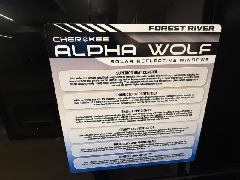 With any Cherokee Alpha Wolf travel trailer by Forest River you'll enjoy outstanding amenities, quality construction, and an affordable price. Each model features a "ToughBend" rigid skirt metal design, 5/8" tongue and groove plywood floor decking, and a "SuperTruss" roof structure that will hold up through years of camping memories. There is a pet friendly "clean sweep" floor design with no heat vents indoors, along with a super lumen lighting system, a 15,000 BTU quick cool central air conditioning, and many more comforts. There are many convenient exterior features such as, Leash Latch pet safety technology, an outside shower with hot and cold water, and exterior steps with oversized landing and quick release. The Weather Guard Package will add protection against the elements with an armored underbelly tank enclosure and forced air heat, thermo-control reflective safety glass windows, and upgraded laminated walls with block foam insulation!