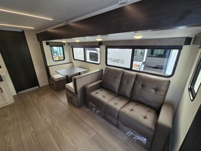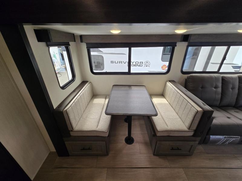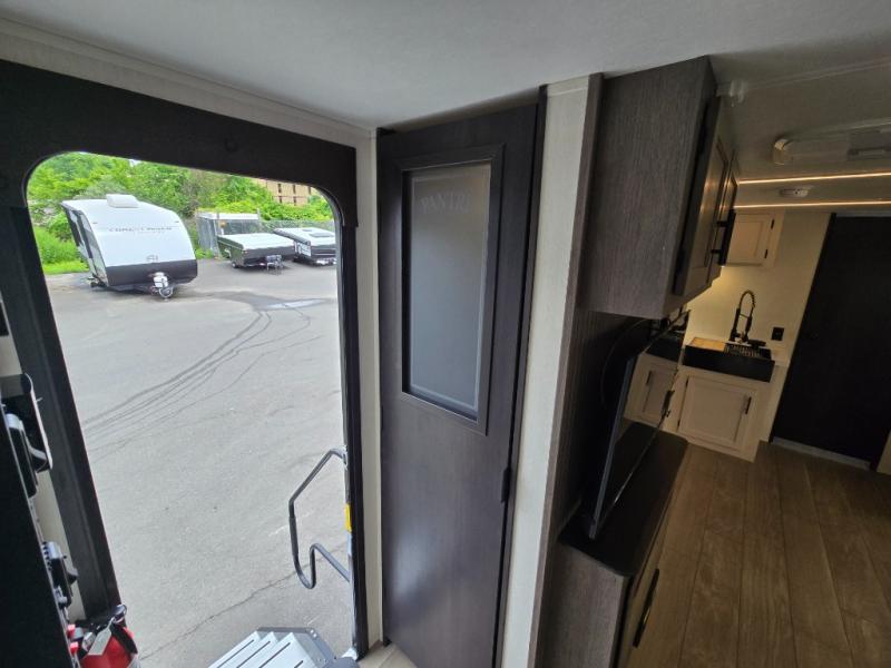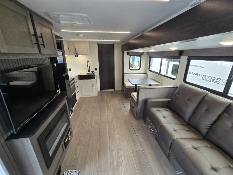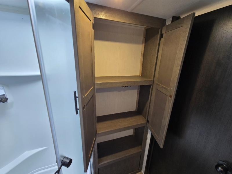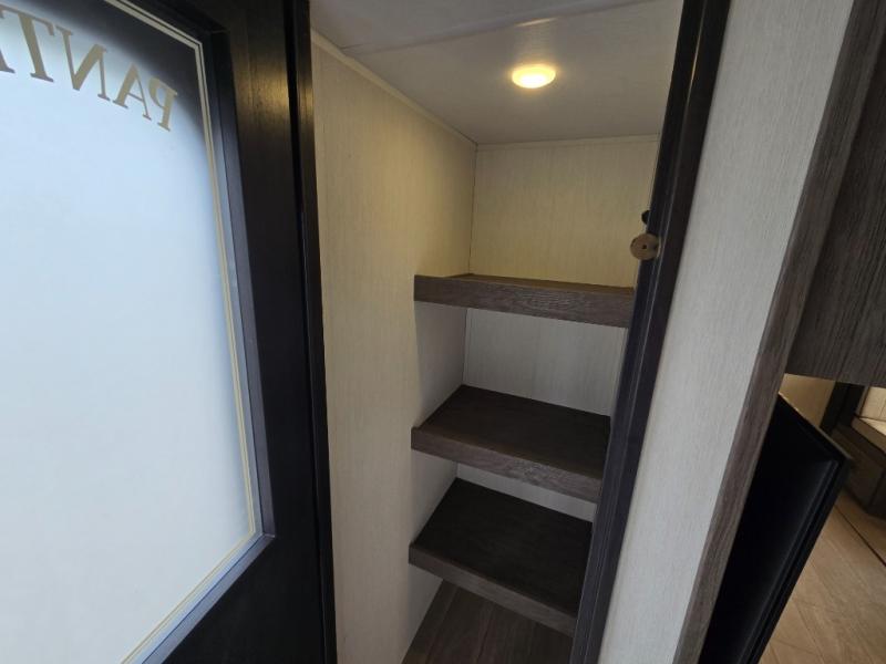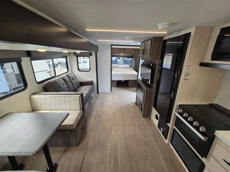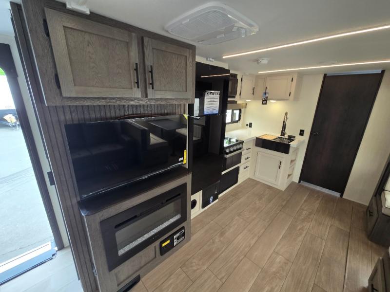 Head to your local state park in this travel trailer with a large slide out! You will love having more space to move about, and your crew can relax on the theater seating or play a game at the booth dinette. An optional TV can be added to the entertainment center, and the fireplace will make it feel a little more like home. There is a three burner cooktop and microwave oven in the kitchen, along with a 12V refrigerator and a walk-in pantry. If you enjoy cooking outdoors, then the outside kitchen will be waiting for you! The full rear bath will let you freshen up before bed, and the queen bed is sure to bring a great night's rest!