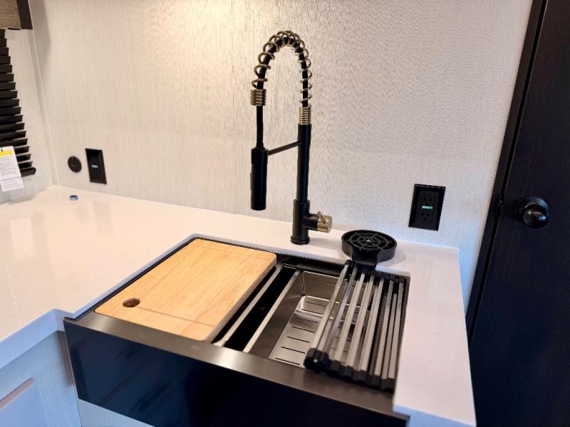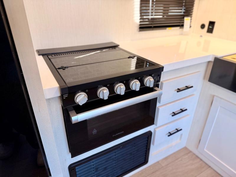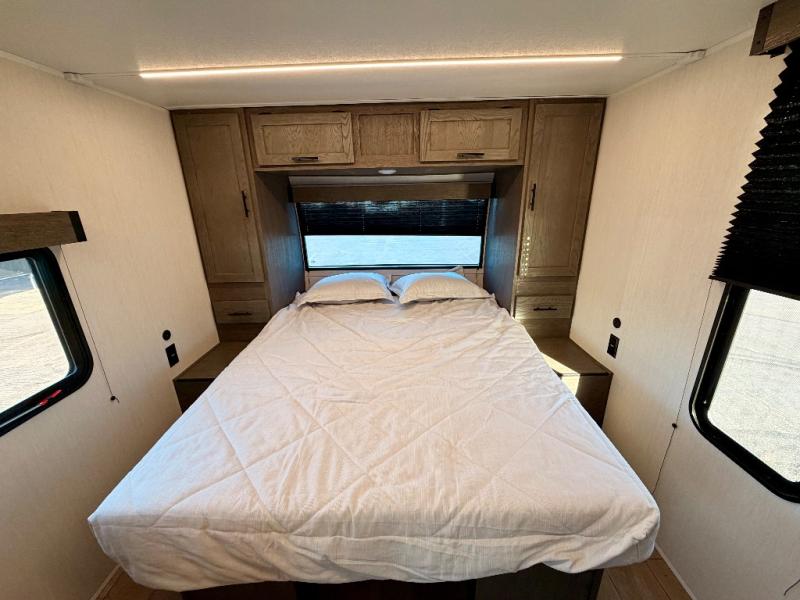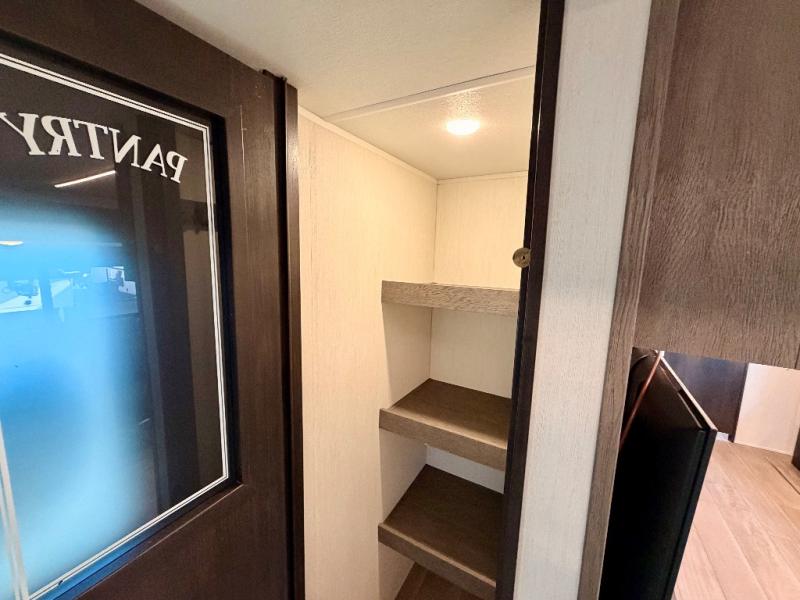 The interior kitchen is a standout, boasting a three-burner cooktop, microwave, and a high-capacity 12V refrigerator. Storage is never an issue thanks to the rare walk-in pantry that can hold enough supplies for extended trips. If you prefer the open air, the outside kitchen is ready for morning coffee or evening cookouts. To wrap up the day, the full rear bath provides a spacious shower to freshen up before you retreat to the front private bedroom for a restful night on the queen-size bed.