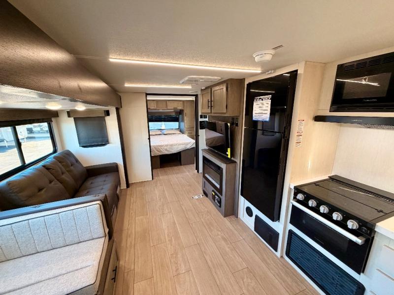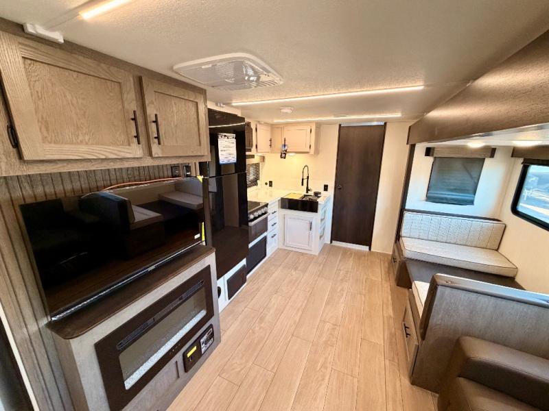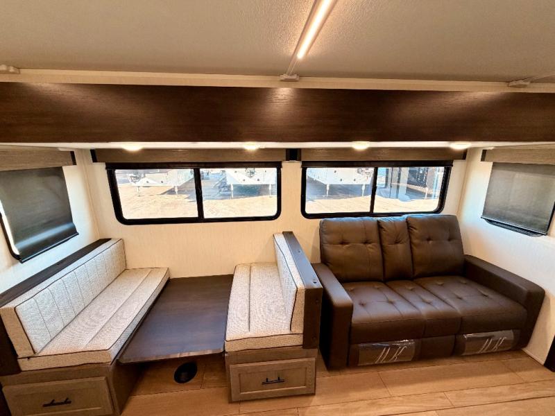 Head to your favorite state park or hidden retreat in this expertly designed travel trailer featuring a large main slide-out that dramatically opens up the living area. You and your crew will love the extra floor space, whether you’re relaxing in the premium theater seating or gathering for a board game at the spacious booth dinette. The entertainment center serves as a focal point, with space for an optional TV and a built-in fireplace that adds both warmth and a cozy, home-like ambiance.