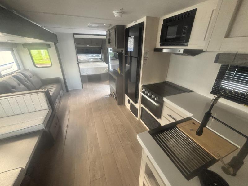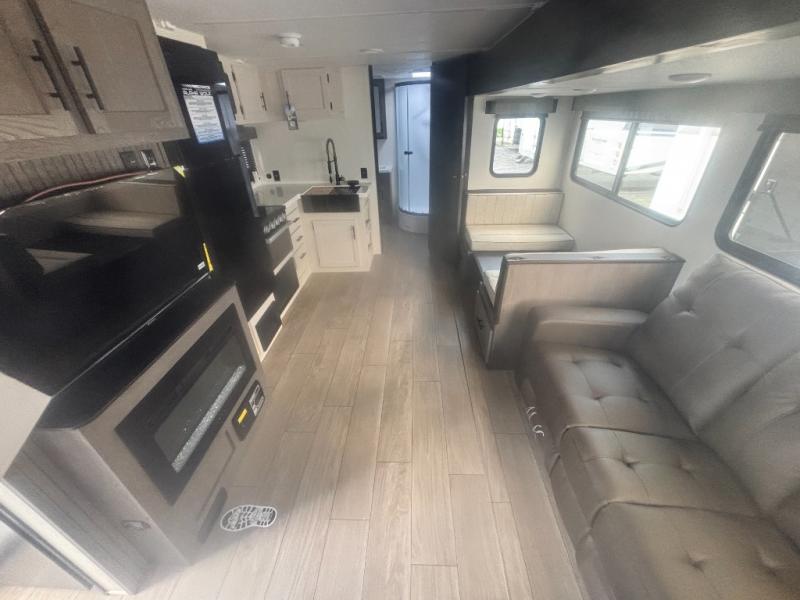 Head to your local state park in this travel trailer with a large slide out! You will love having more space to move about, and your crew can relax on the theater seating or play a game at the booth dinette. An optional TV can be added to the entertainment center, and the fireplace will make it feel a little more like home. There is a three burner cooktop and microwave oven in the kitchen, along with a 12V refrigerator and a walk-in pantry. If you enjoy cooking outdoors, then the outside kitchen will be waiting for you! The full rear bath will let you freshen up before bed, and the queen bed is sure to bring a great night's rest!