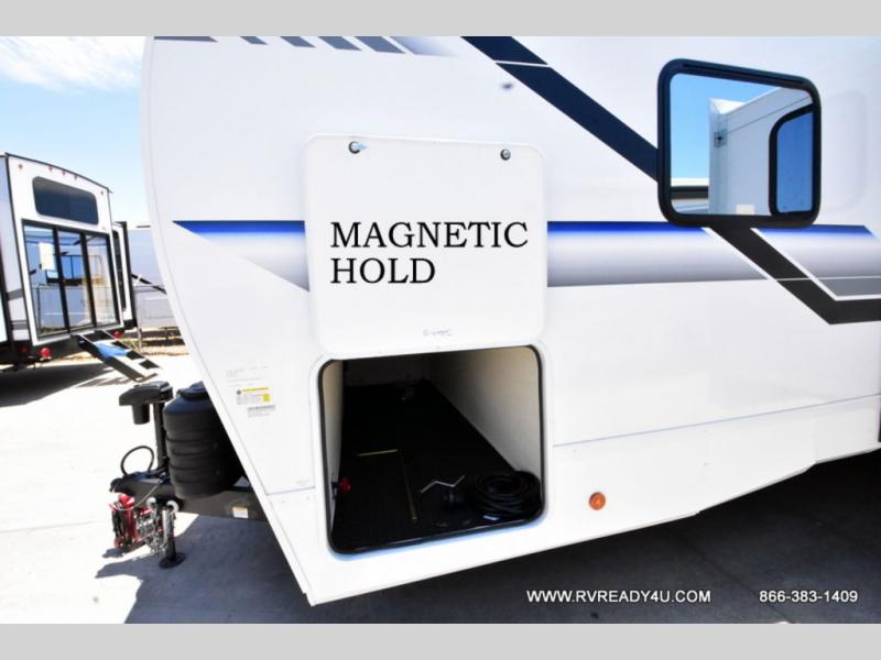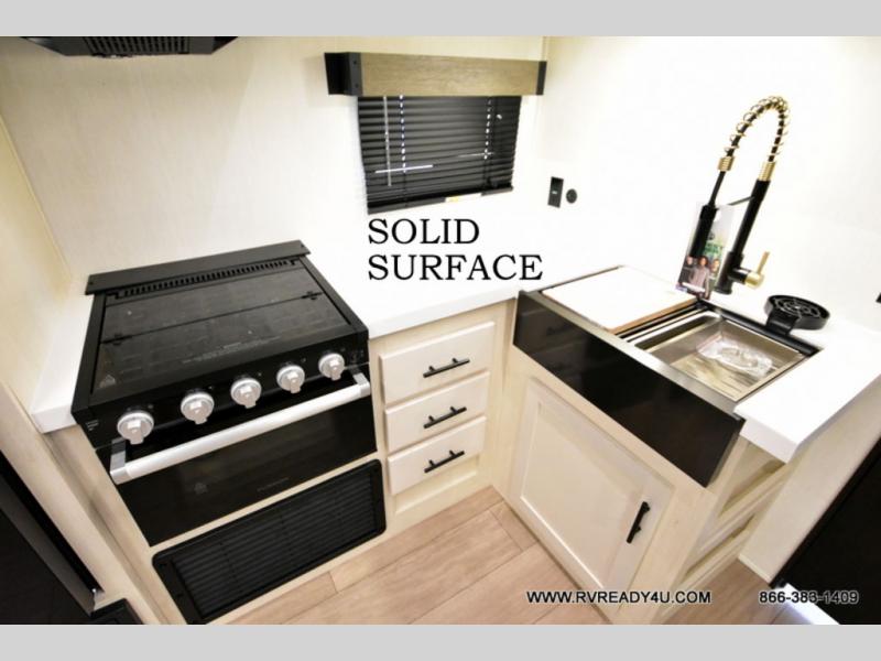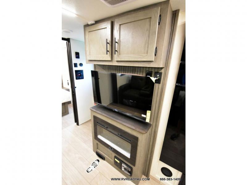 Head to your local state park in this travel trailer with a large slide out! You will love having more space to move about, and your crew can relax on the theater seating or play a game at the booth dinette. An optional TV can be added to the entertainment center, and the fireplace will make it feel a little more like home. There is a three burner cooktop and microwave oven in the kitchen, along with a 12V refrigerator and a walk-in pantry. If you enjoy cooking outdoors, then the outside kitchen will be waiting for you! The full rear bath will let you freshen up before bed, and the queen bed is sure to bring a great night's rest!