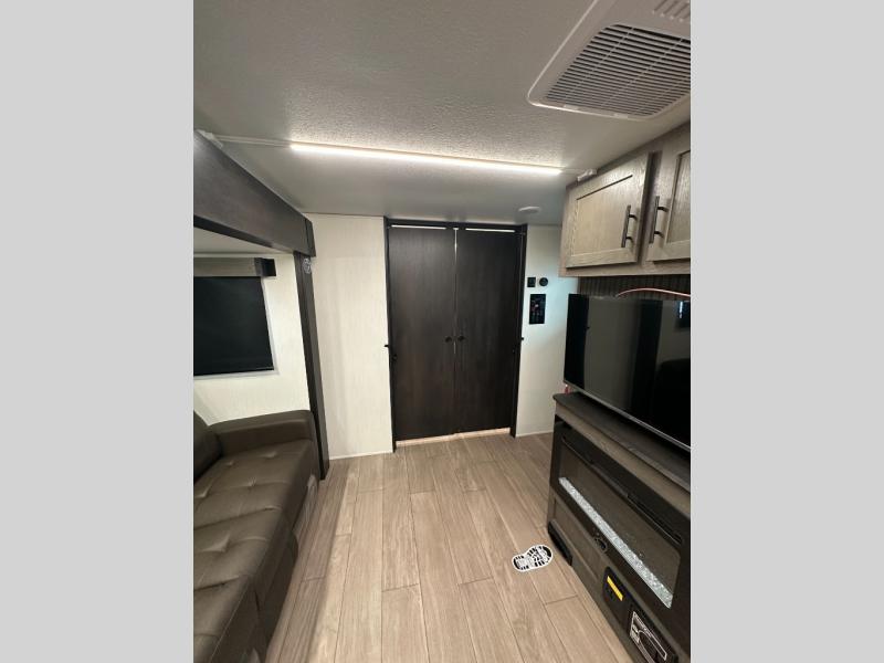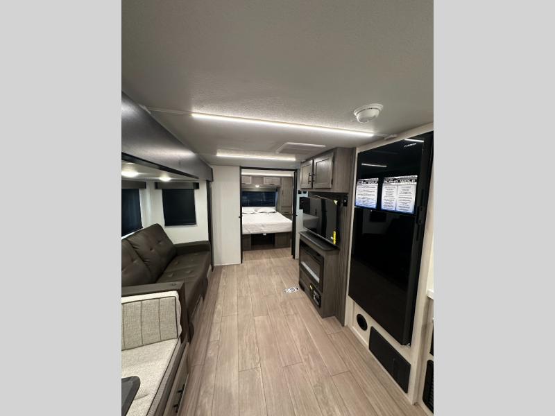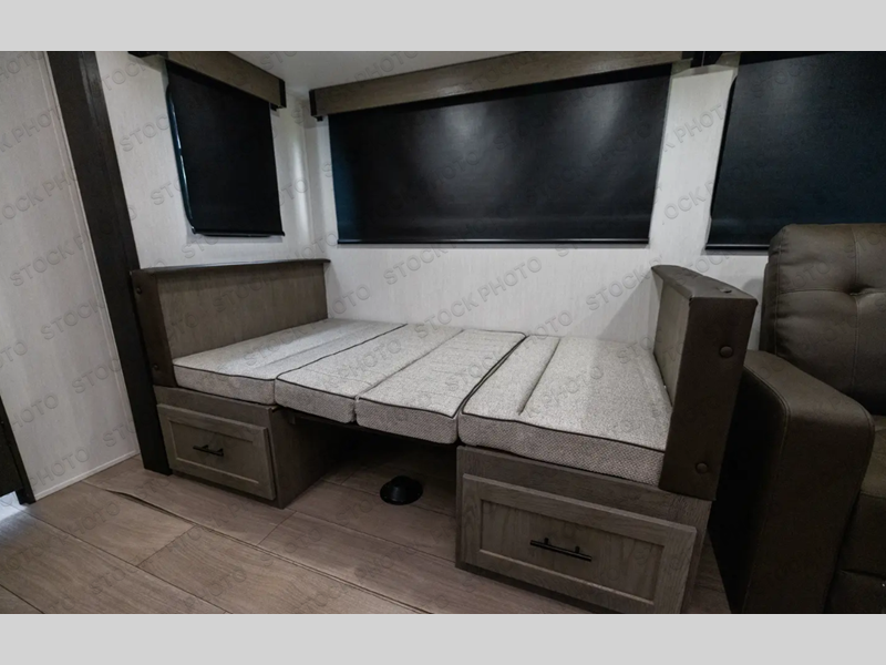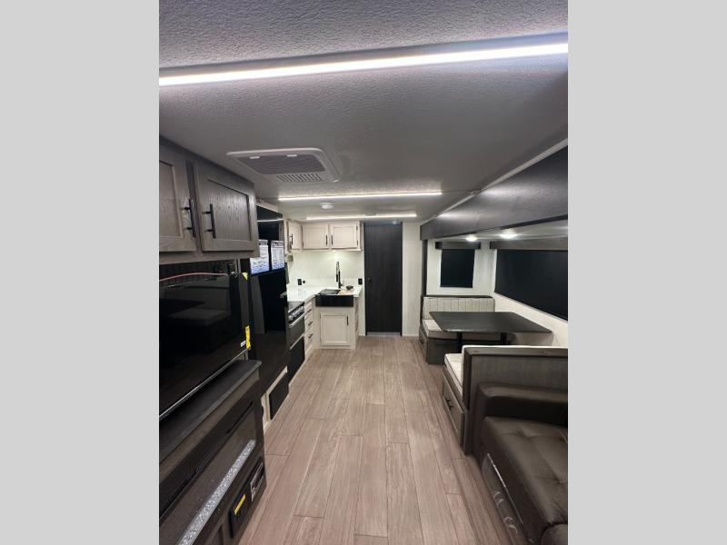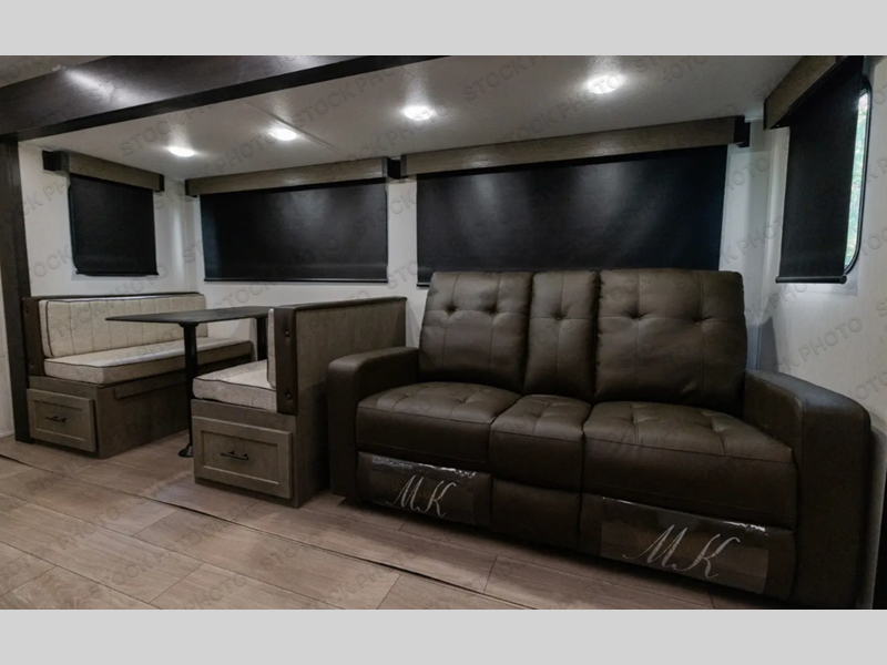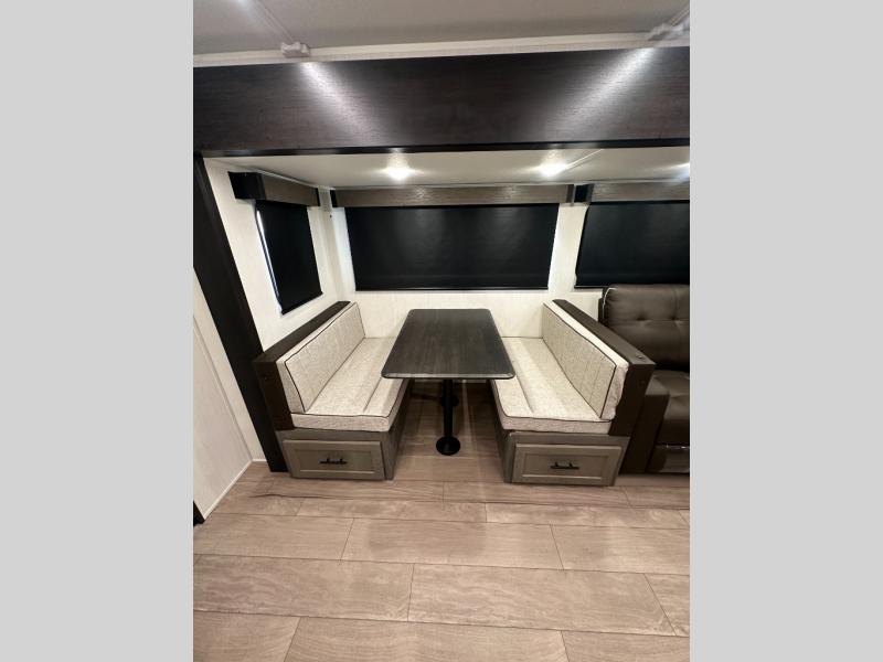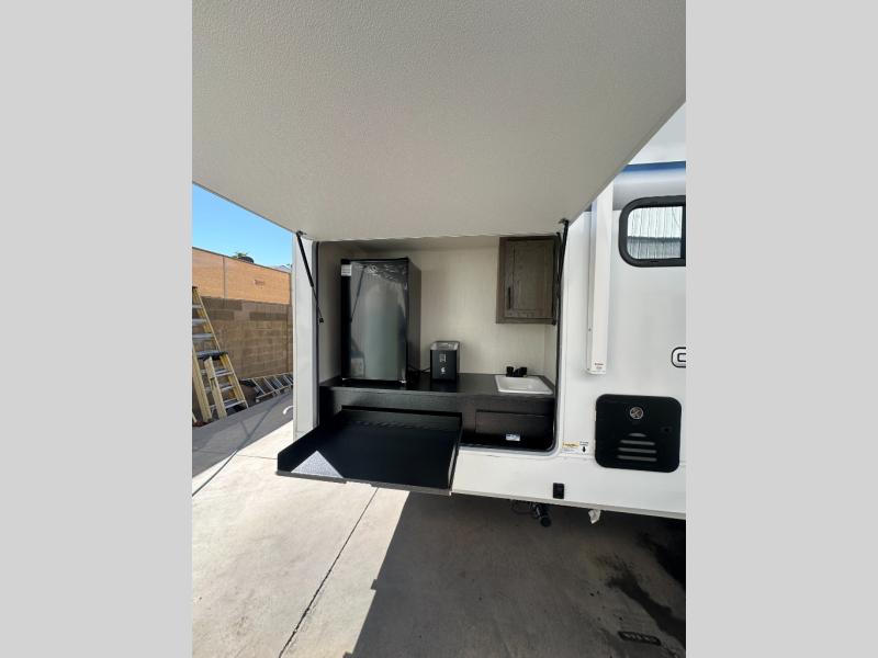 Head to your local state park in this travel trailer with a large slide out! You will love having more space to move about, and your crew can relax on the theater seating or play a game at the booth dinette. An optional TV can be added to the entertainment center, and the fireplace will make it feel a little more like home. There is a three burner cooktop and microwave oven in the kitchen, along with a 12V refrigerator and a walk-in pantry. If you enjoy cooking outdoors, then the outside kitchen will be waiting for you! The full rear bath will let you freshen up before bed, and the queen bed is sure to bring a great night's rest!