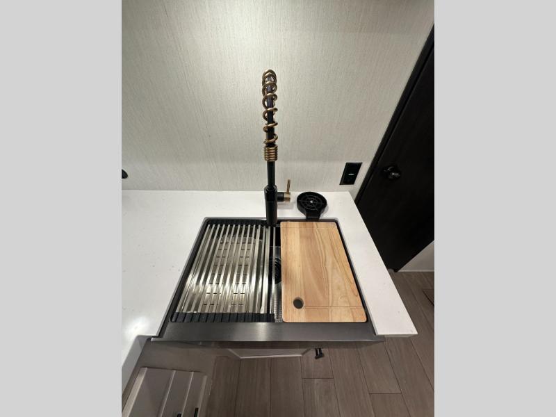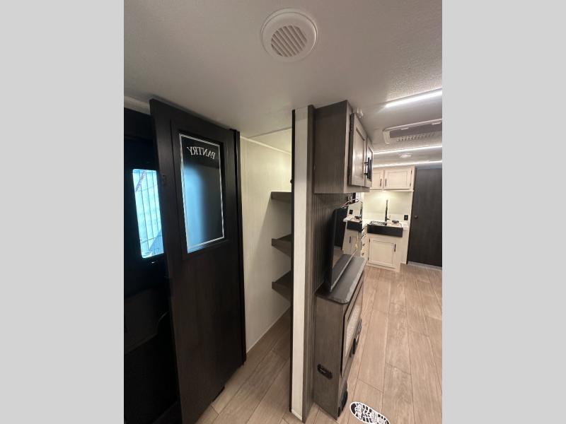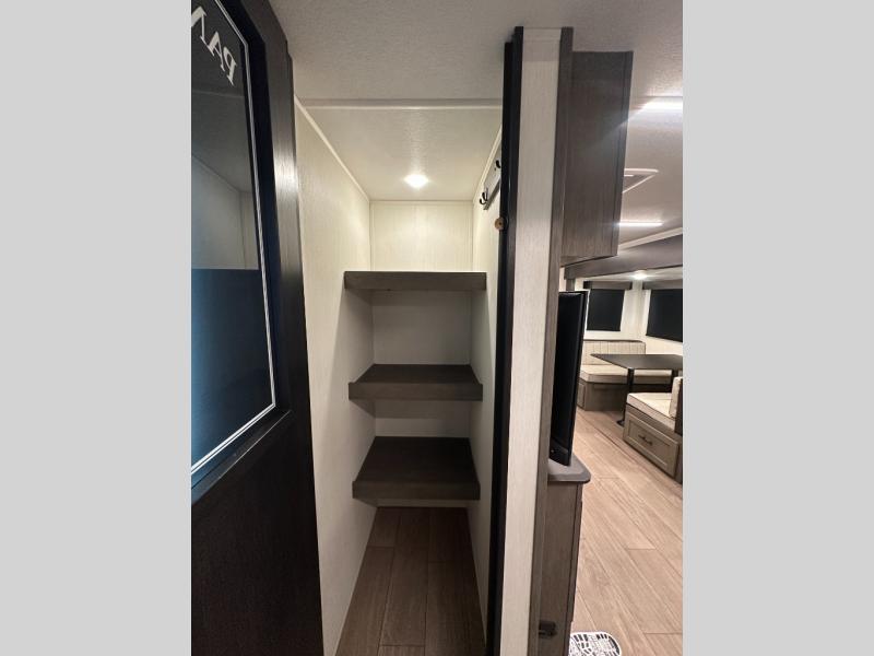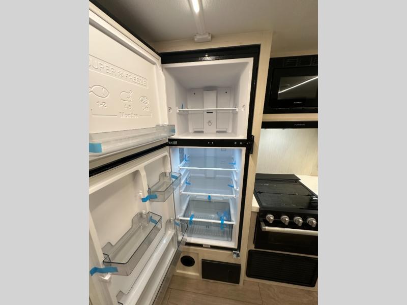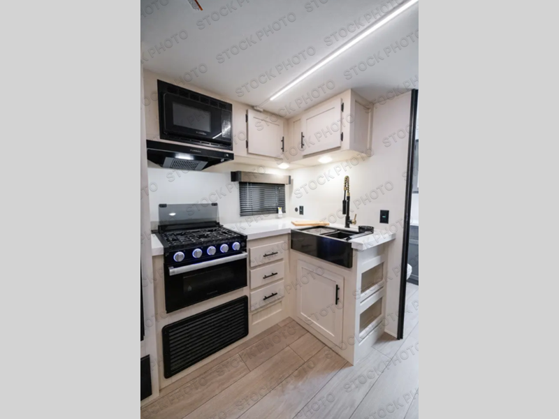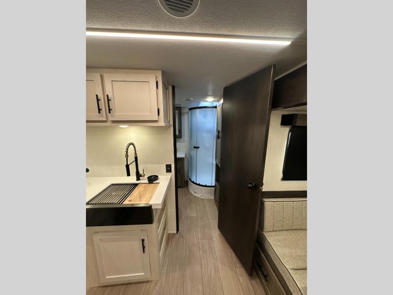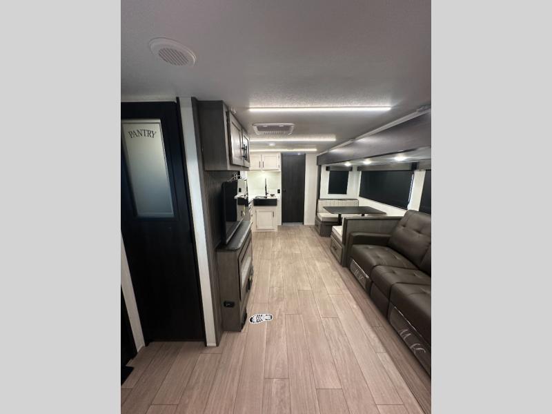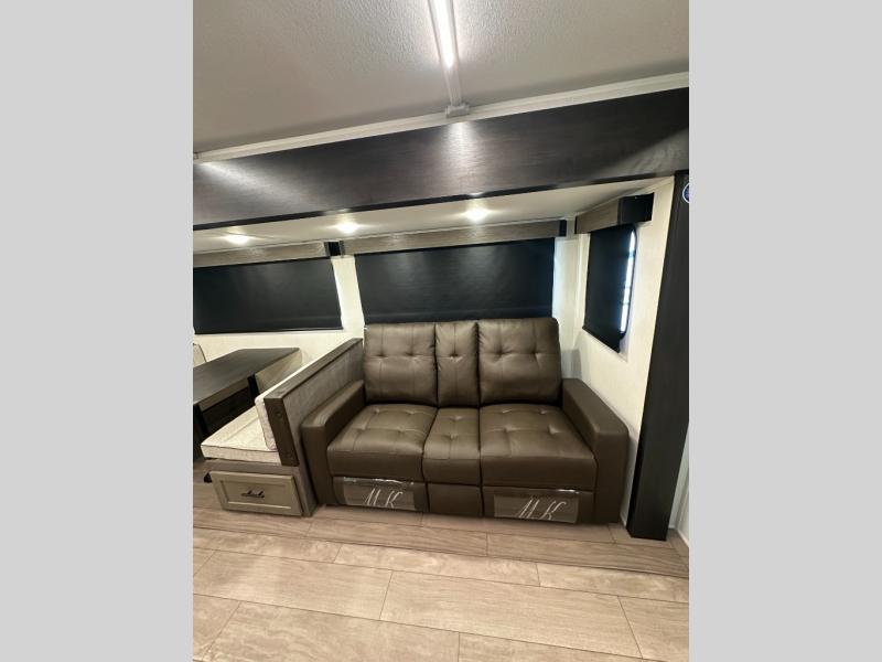 Head to your local state park in this travel trailer with a large slide out! You will love having more space to move about, and your crew can relax on the theater seating or play a game at the booth dinette. An optional TV can be added to the entertainment center, and the fireplace will make it feel a little more like home. There is a three burner cooktop and microwave oven in the kitchen, along with a 12V refrigerator and a walk-in pantry. If you enjoy cooking outdoors, then the outside kitchen will be waiting for you! The full rear bath will let you freshen up before bed, and the queen bed is sure to bring a great night's rest!