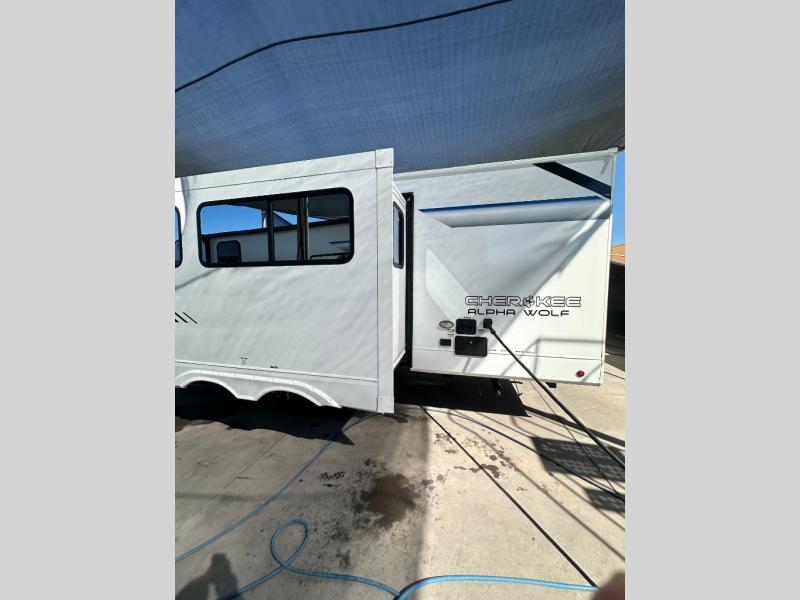 With any Cherokee Alpha Wolf travel trailer by Forest River you'll enjoy outstanding amenities, quality construction, and an affordable price. Each model features a "ToughBend" rigid skirt metal design, 5/8" tongue and groove plywood floor decking, and a "SuperTruss" roof structure that will hold up through years of camping memories. There is a pet friendly "clean sweep" floor design with no heat vents indoors, along with a super lumen lighting system, a 15,000 BTU quick cool central air conditioning, and many more comforts. There are many convenient exterior features such as, Leash Latch pet safety technology, an outside shower with hot and cold water, and exterior steps with oversized landing and quick release. The Weather Guard Package will add protection against the elements with an armored underbelly tank enclosure and forced air heat, thermo-control reflective safety glass windows, and upgraded laminated walls with block foam insulation!
