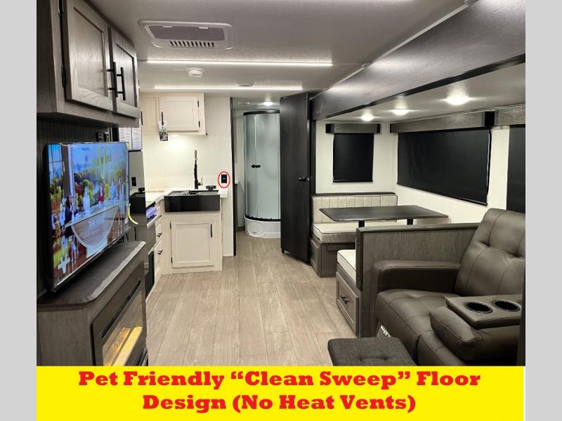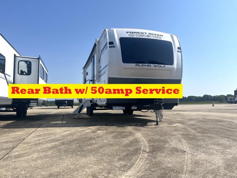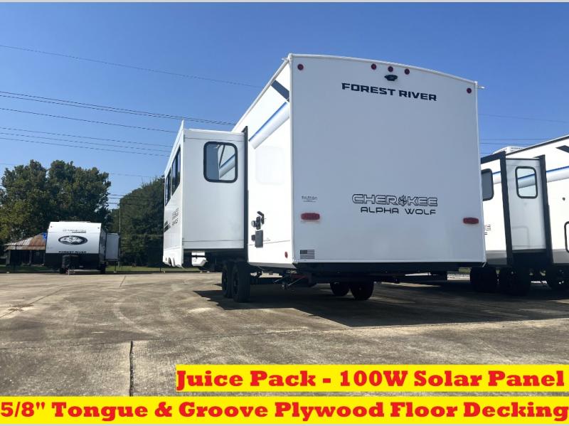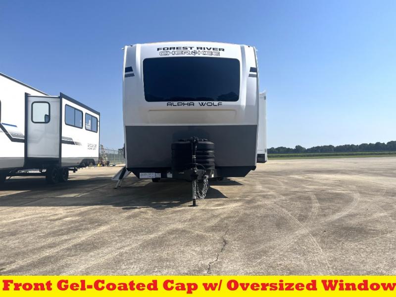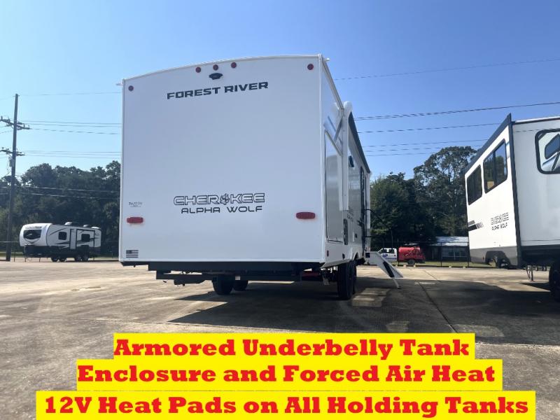 With any Cherokee Alpha Wolf travel trailer by Forest River you'll enjoy outstanding amenities, quality construction, and an affordable price. Each model features a "ToughBend" rigid skirt metal design, 5/8" tongue and groove plywood floor decking, and a "SuperTruss" roof structure that will hold up through years of camping memories. There is a pet friendly "clean sweep" floor design with no heat vents indoors, along with a super lumen lighting system, a 15,000 BTU quick cool central air conditioning, and many more comforts. There are many convenient exterior features such as, Leash Latch pet safety technology, an outside shower with hot and cold water, and exterior steps with oversized landing and quick release. The Weather Guard Package will add protection against the elements with an armored underbelly tank enclosure and forced air heat, thermo-control reflective safety glass windows, and upgraded laminated walls with block foam insulation!