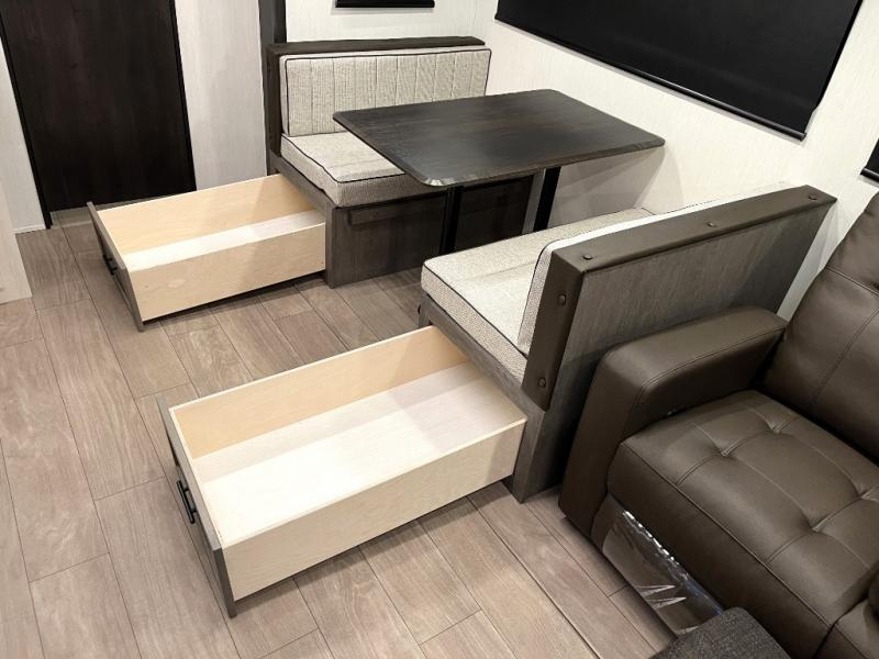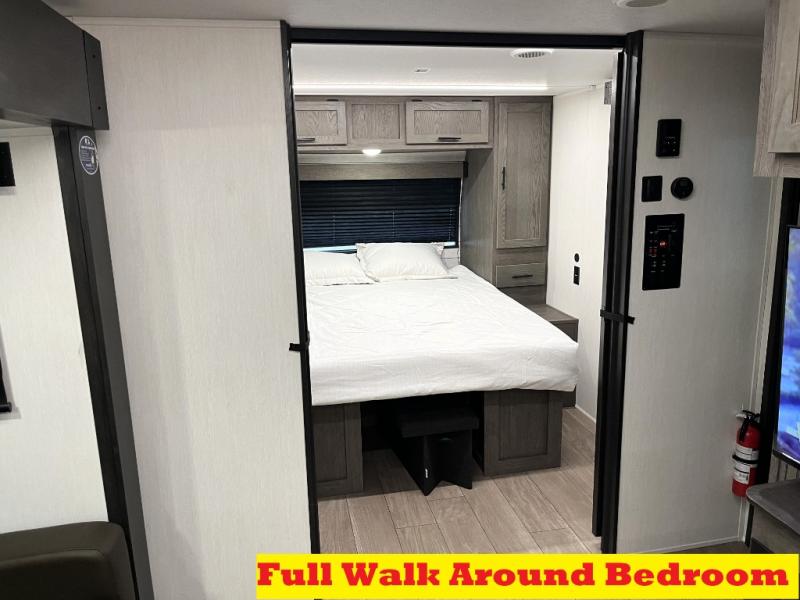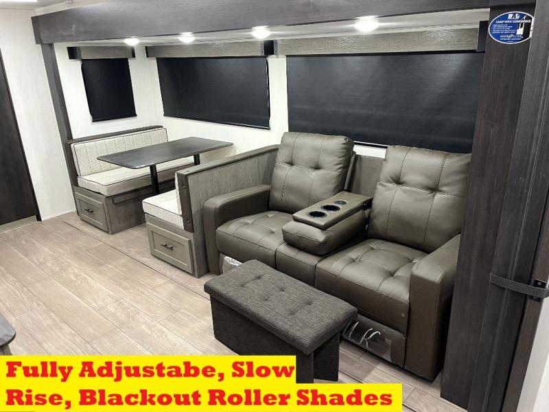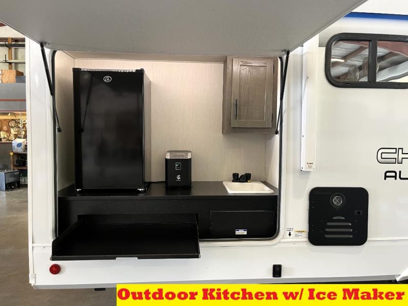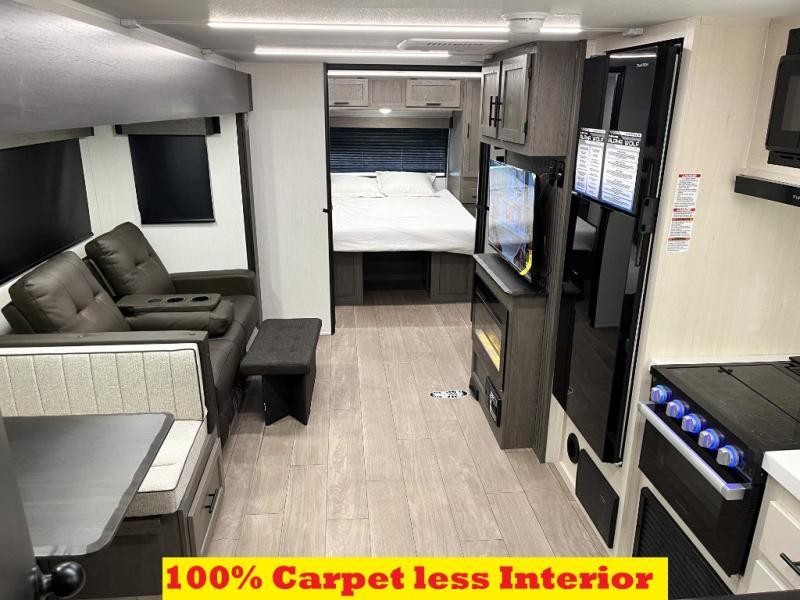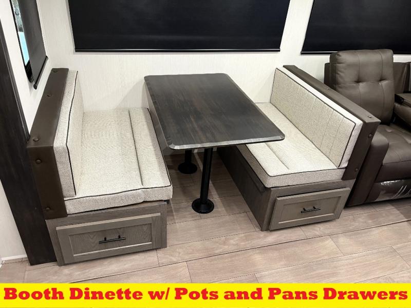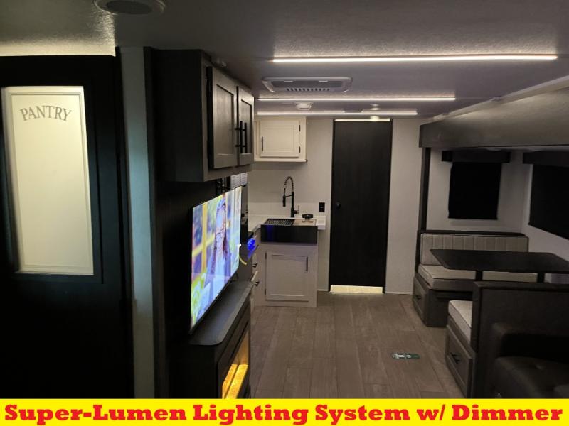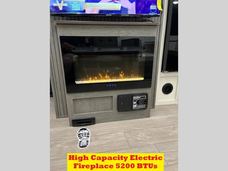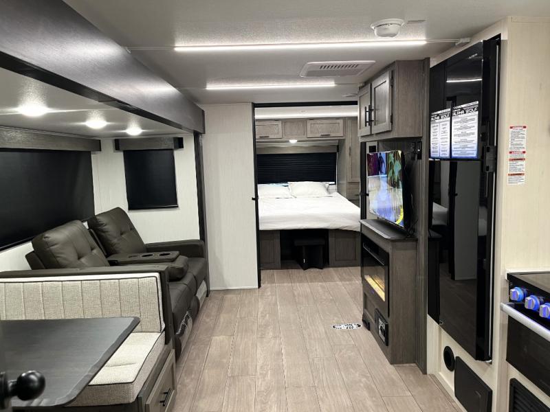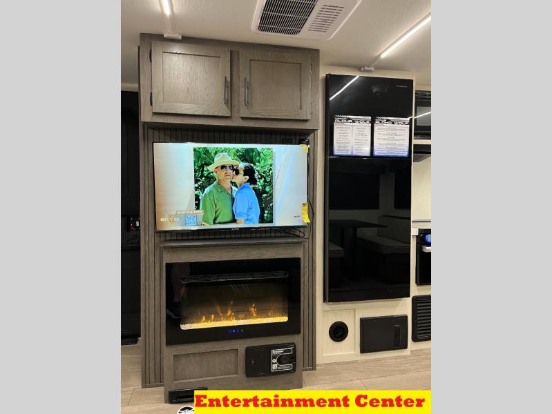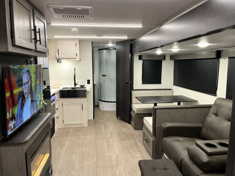 Head to your local state park in this travel trailer with a large slide out! You will love having more space to move about, and your crew can relax on the theater seating or play a game at the booth dinette. An optional TV can be added to the entertainment center, and the fireplace will make it feel a little more like home. There is a three burner cooktop and microwave oven in the kitchen, along with a 12V refrigerator and a walk-in pantry. If you enjoy cooking outdoors, then the outside kitchen will be waiting for you! The full rear bath will let you freshen up before bed, and the queen bed is sure to bring a great night's rest!