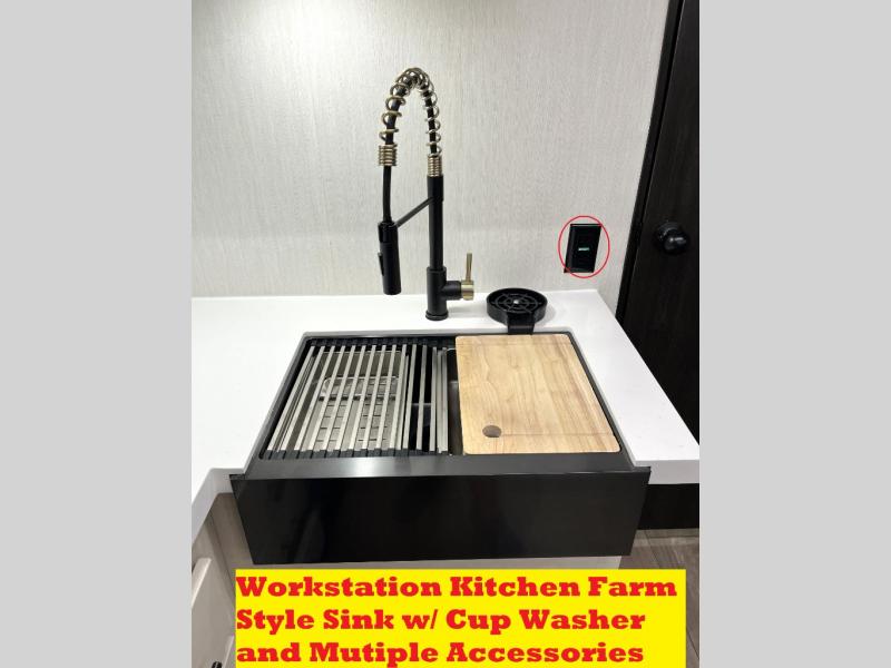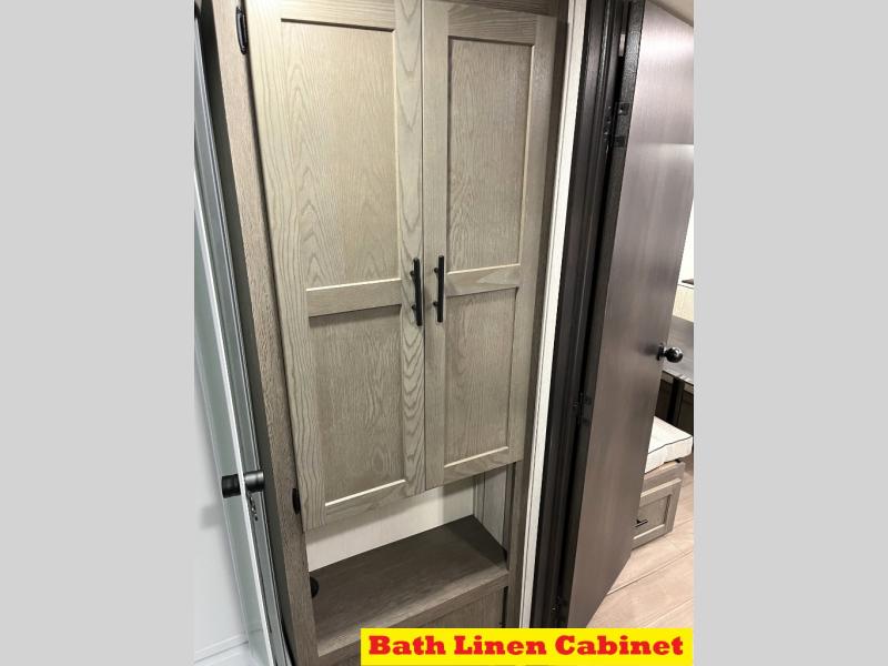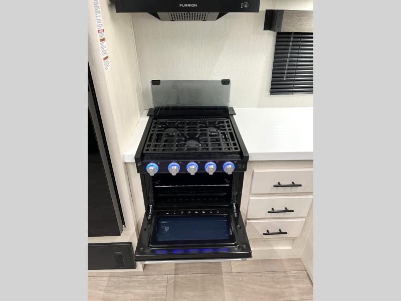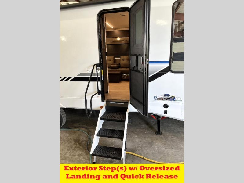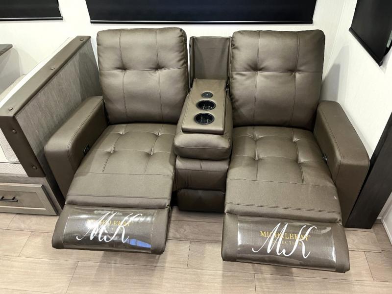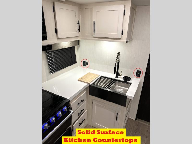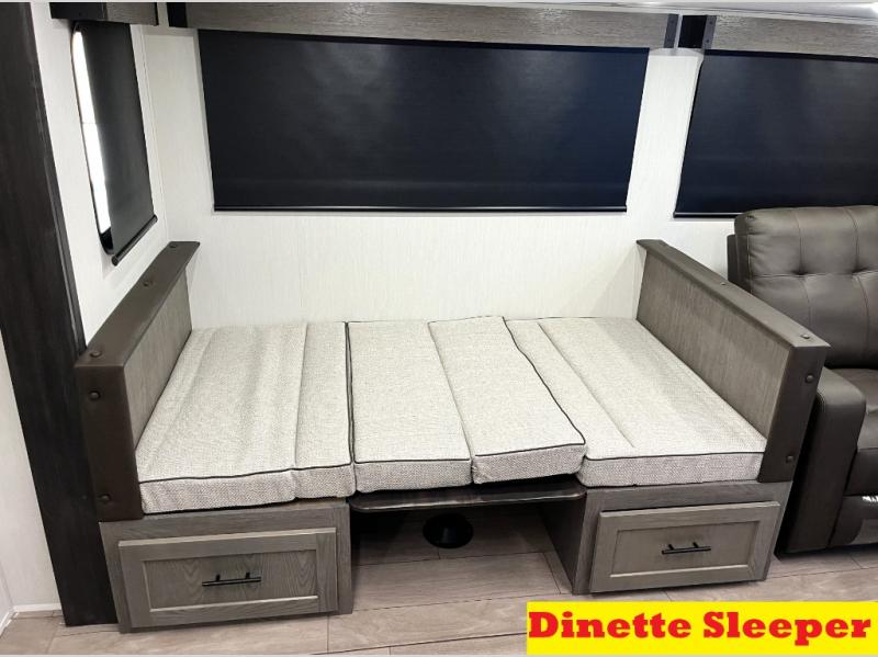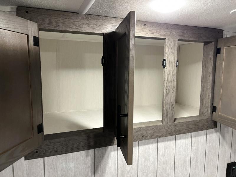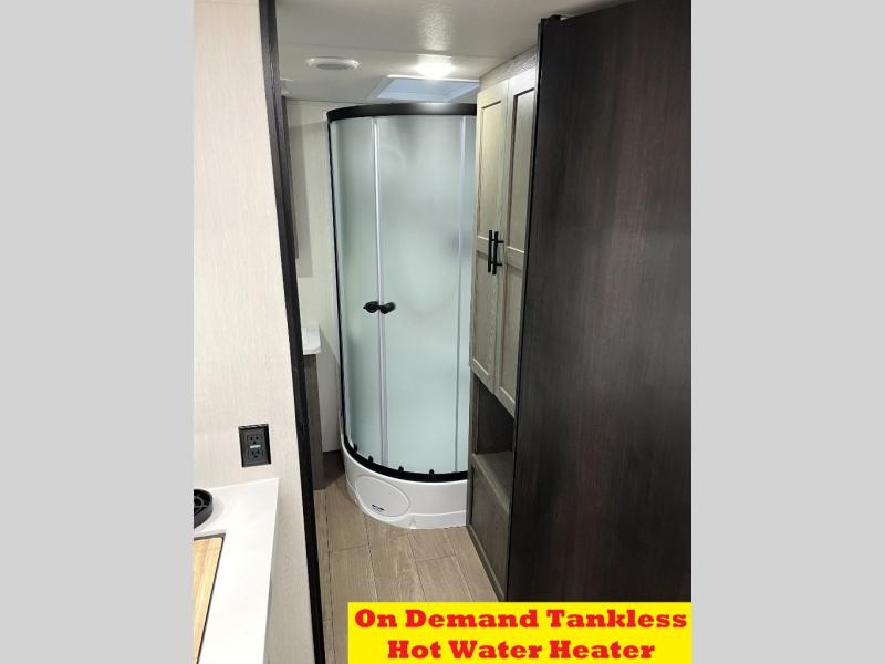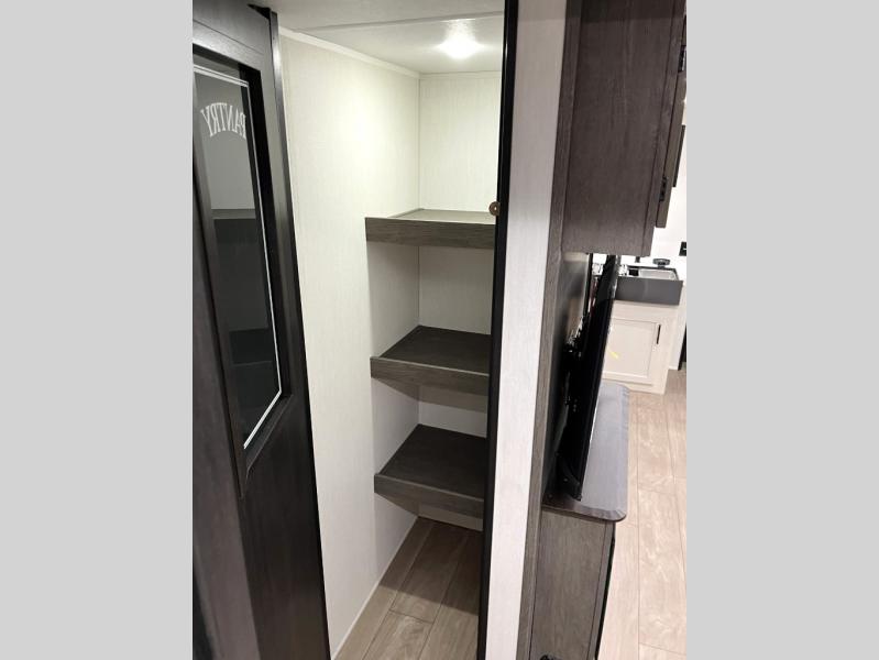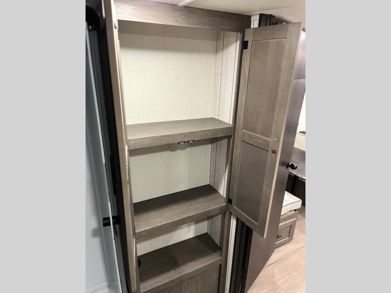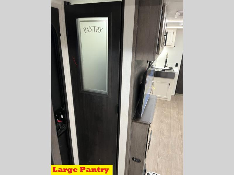 Head to your local state park in this travel trailer with a large slide out! You will love having more space to move about, and your crew can relax on the theater seating or play a game at the booth dinette. An optional TV can be added to the entertainment center, and the fireplace will make it feel a little more like home. There is a three burner cooktop and microwave oven in the kitchen, along with a 12V refrigerator and a walk-in pantry. If you enjoy cooking outdoors, then the outside kitchen will be waiting for you! The full rear bath will let you freshen up before bed, and the queen bed is sure to bring a great night's rest!