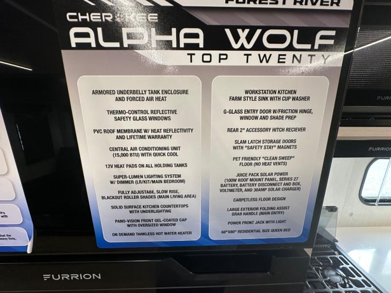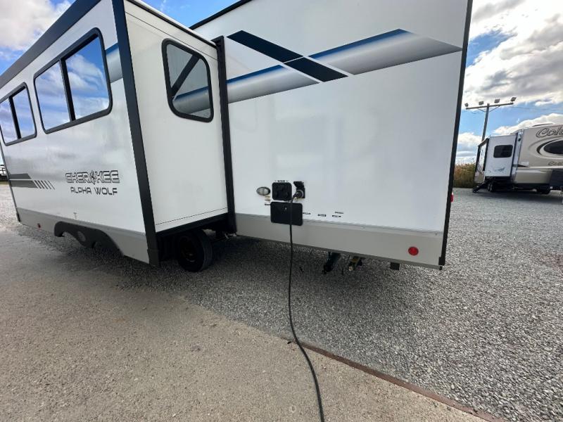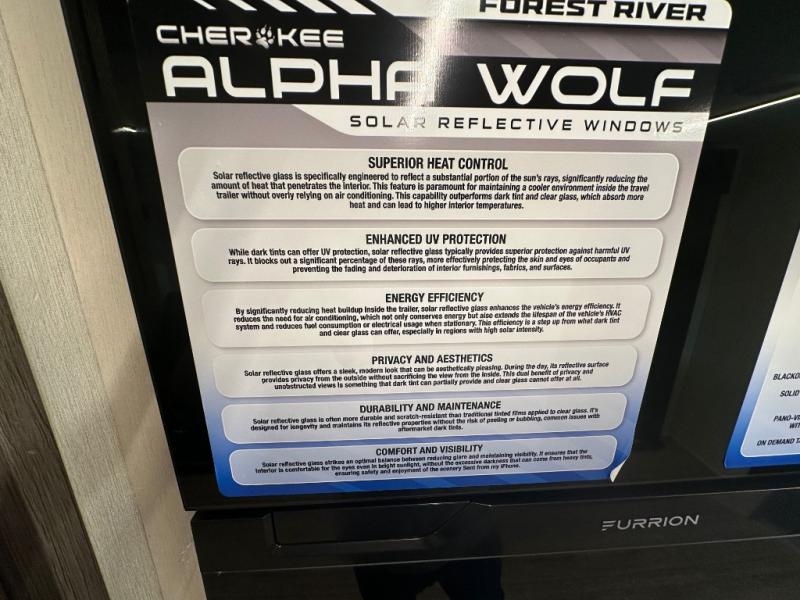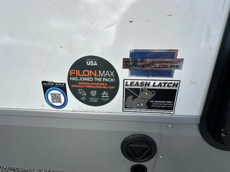 With any Cherokee Alpha Wolf travel trailer by Forest River you'll enjoy outstanding amenities, quality construction, and an affordable price. Each model features a "ToughBend" rigid skirt metal design, 5/8" tongue and groove plywood floor decking, and a "SuperTruss" roof structure that will hold up through years of camping memories. There is a pet friendly "clean sweep" floor design with no heat vents indoors, along with a super lumen lighting system, a 15,000 BTU quick cool central air conditioning, and many more comforts. There are many convenient exterior features such as, Leash Latch pet safety technology, an outside shower with hot and cold water, On The Go rear ladder prep, and exterior steps with oversized landing and quick release. The Weather Guard Package will add protection against the elements with an armored underbelly tank enclosure and forced air heat, thermo-control reflective safety glass windows, and upgraded laminated walls with block foam insulation!
