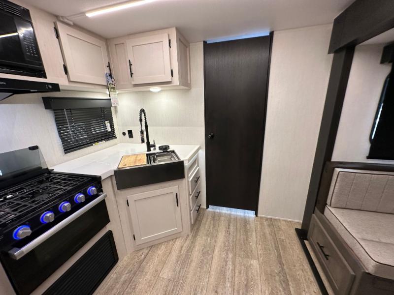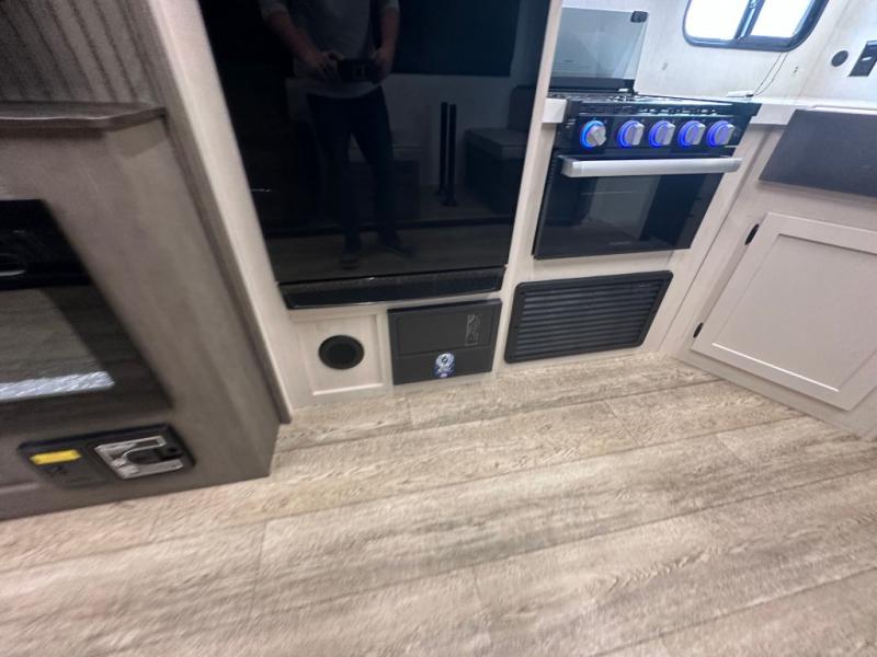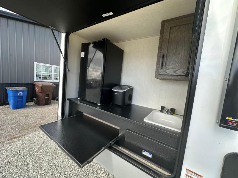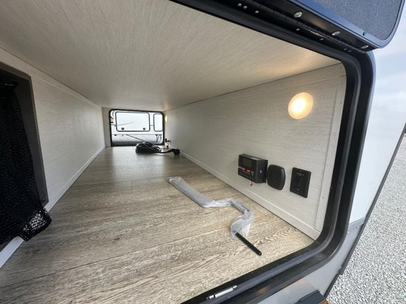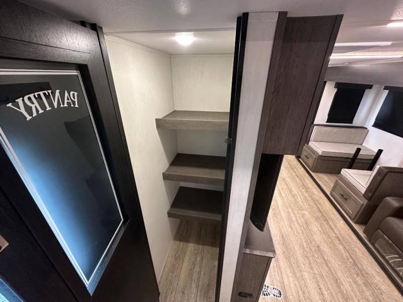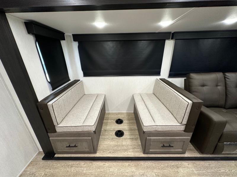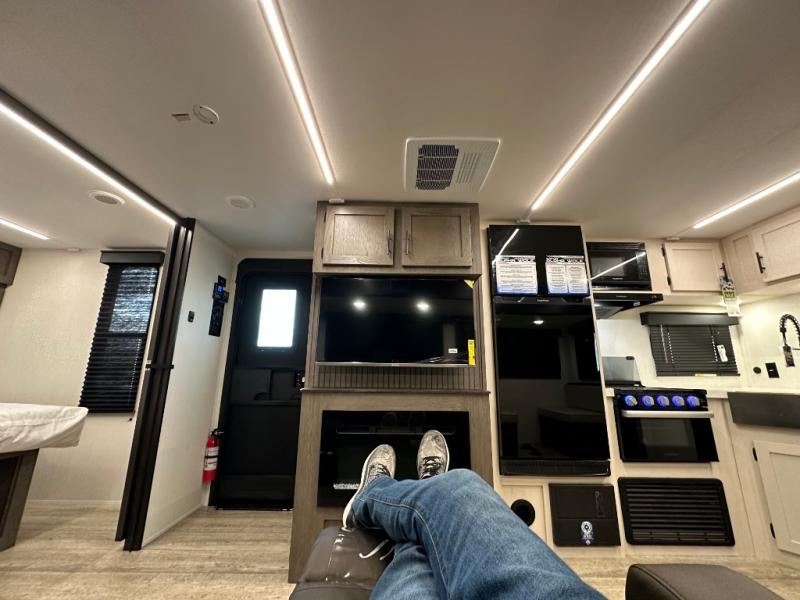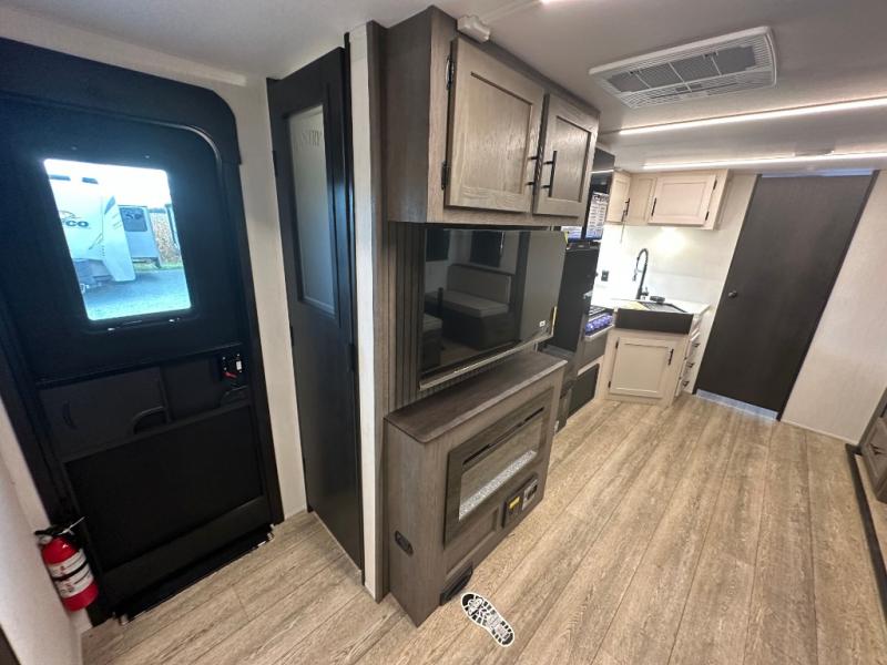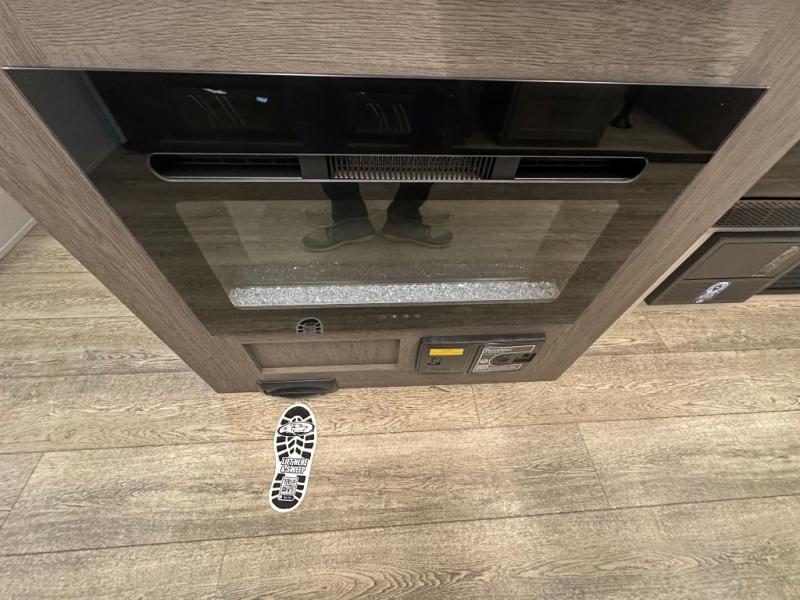 Head to your local state park in this travel trailer with a large slide out! You will love having more space to move about, and your crew can relax on the theater seating or play a game at the booth dinette. An optional TV can be added to the entertainment center, and the fireplace will make it feel a little more like home. There is a three burner cooktop and microwave oven in the kitchen, along with a 12V refrigerator and a walk-in pantry. If you enjoy cooking outdoors, then the outside kitchen will be waiting for you! The full rear bath will let you freshen up before bed, and the queen bed is sure to bring a great night's rest!
