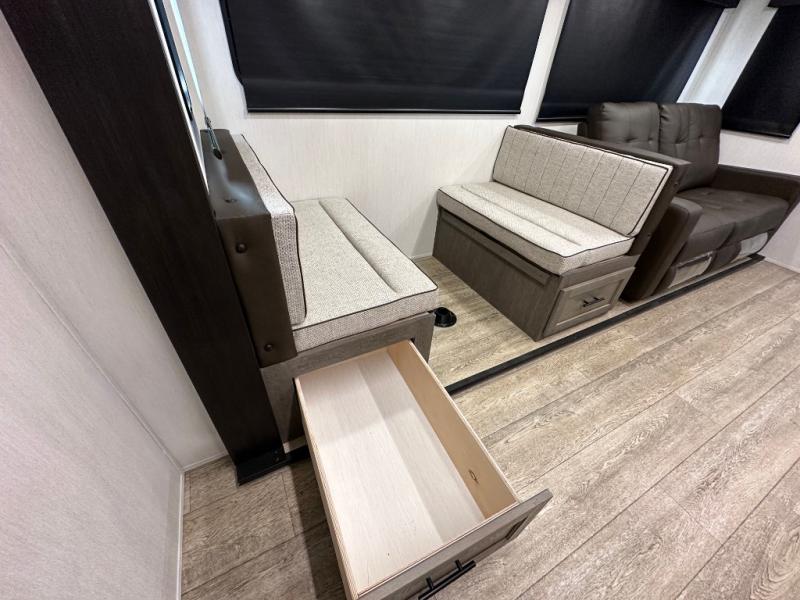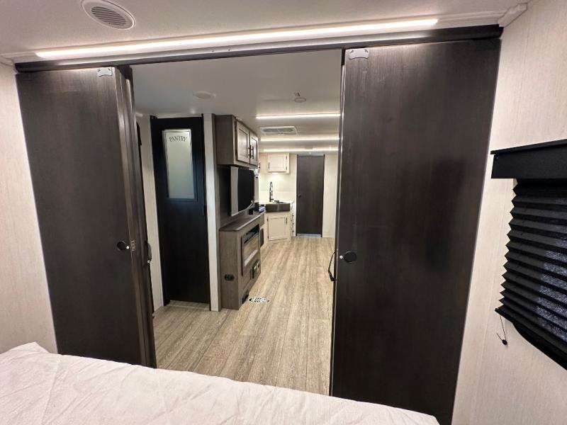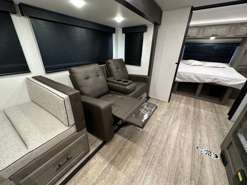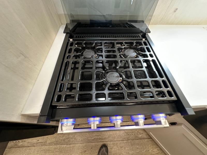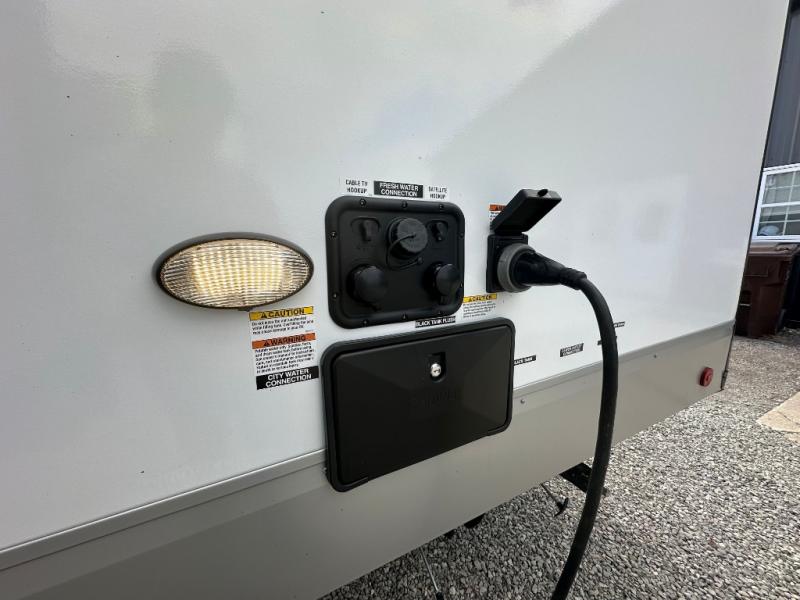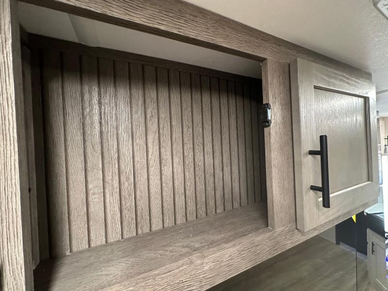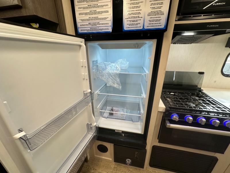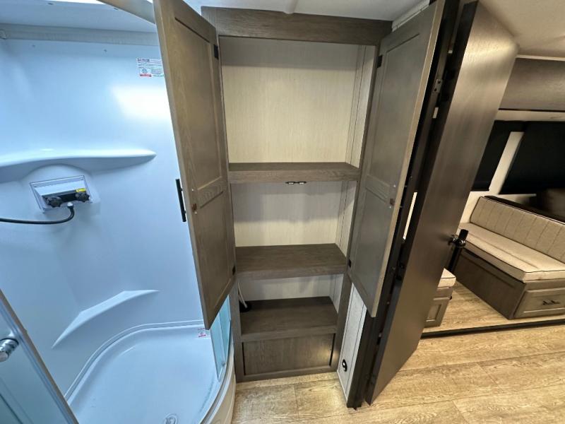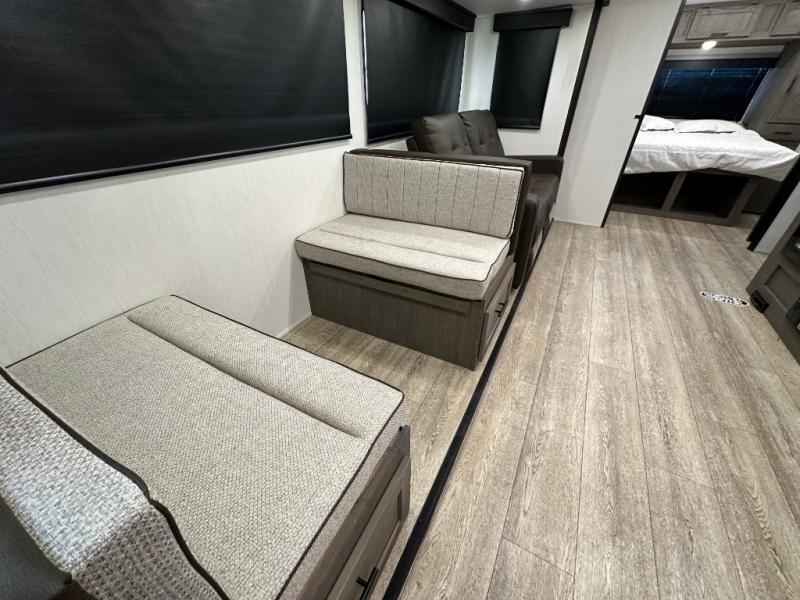 Head to your local state park in this travel trailer with a large slide out! You will love having more space to move about, and your crew can relax on the theater seating or play a game at the booth dinette. An optional TV can be added to the entertainment center, and the fireplace will make it feel a little more like home. There is a three burner cooktop and microwave oven in the kitchen, along with a 12V refrigerator and a walk-in pantry. If you enjoy cooking outdoors, then the outside kitchen will be waiting for you! The full rear bath will let you freshen up before bed, and the queen bed is sure to bring a great night's rest!