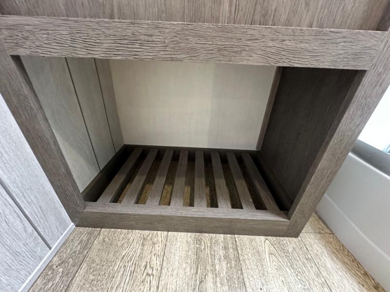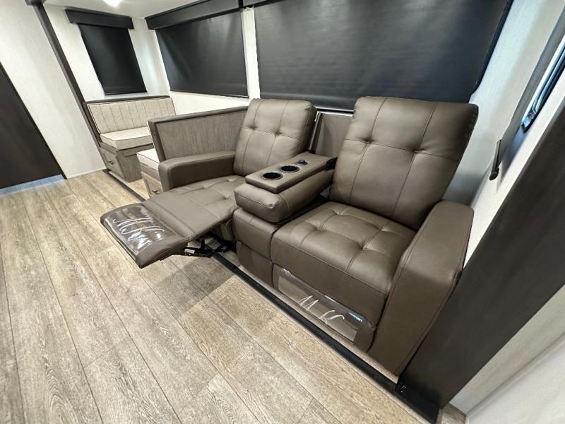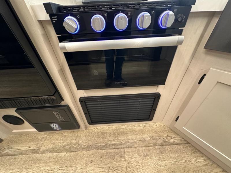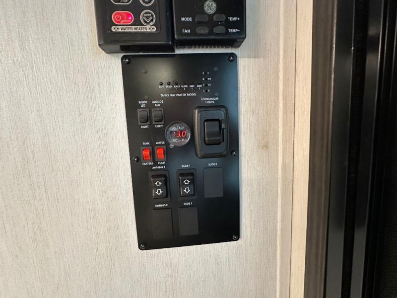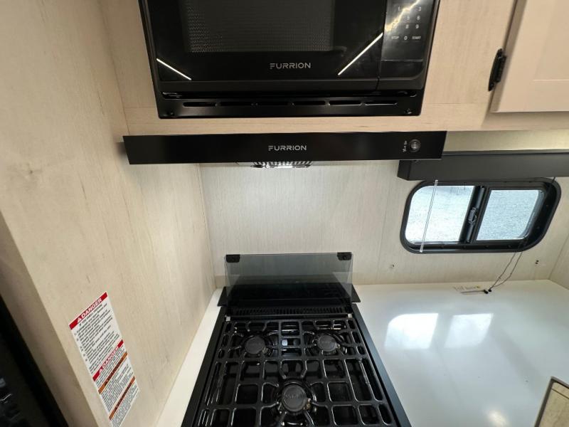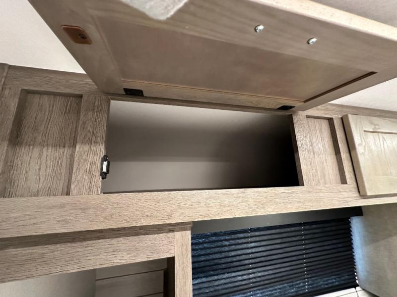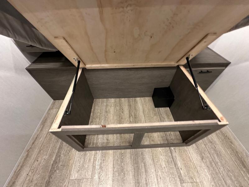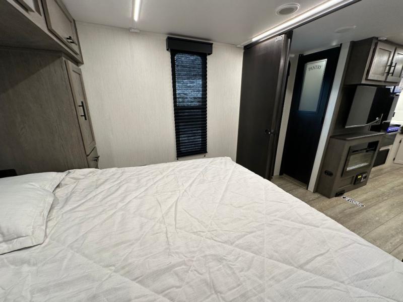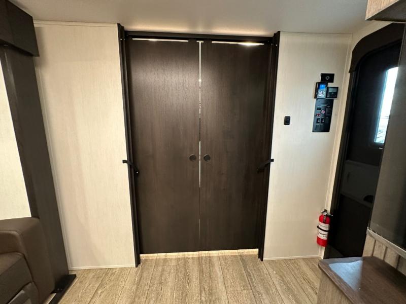 Head to your local state park in this travel trailer with a large slide out! You will love having more space to move about, and your crew can relax on the theater seating or play a game at the booth dinette. An optional TV can be added to the entertainment center, and the fireplace will make it feel a little more like home. There is a three burner cooktop and microwave oven in the kitchen, along with a 12V refrigerator and a walk-in pantry. If you enjoy cooking outdoors, then the outside kitchen will be waiting for you! The full rear bath will let you freshen up before bed, and the queen bed is sure to bring a great night's rest!