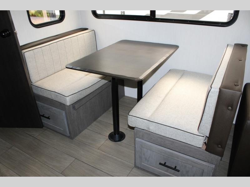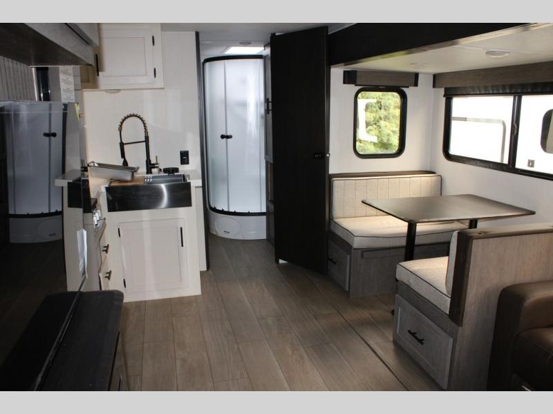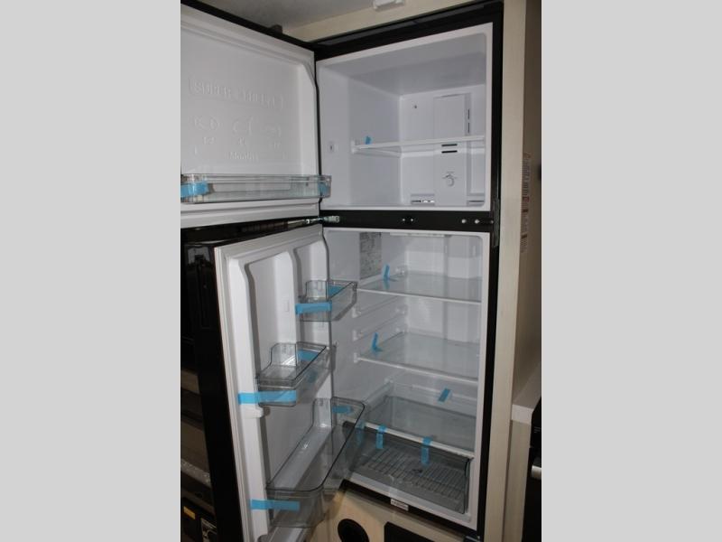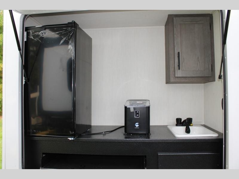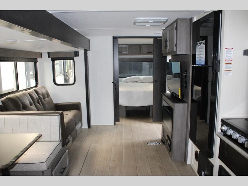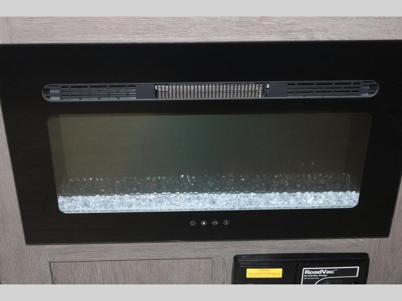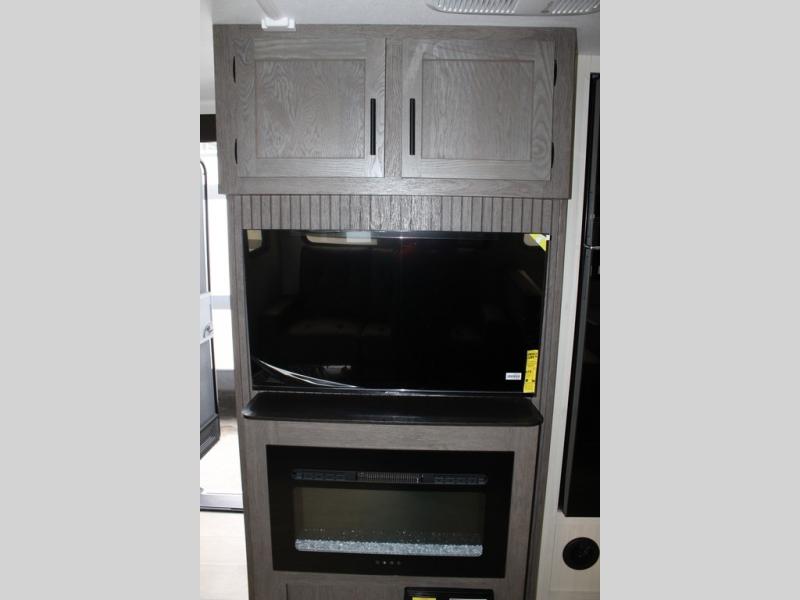 Head to your local state park in this travel trailer with a large slide out! You will love having more space to move about, and your crew can relax on the theater seating or play a game at the booth dinette. An optional TV can be added to the entertainment center, and the fireplace will make it feel a little more like home. There is a three burner cooktop and microwave oven in the kitchen, along with a 12V refrigerator and a walk-in pantry. If you enjoy cooking outdoors, then the outside kitchen will be waiting for you! The full rear bath will let you freshen up before bed, and the queen bed is sure to bring a great night's rest!