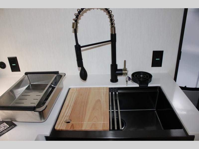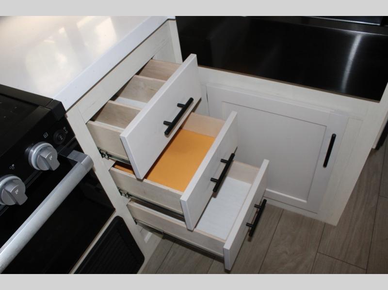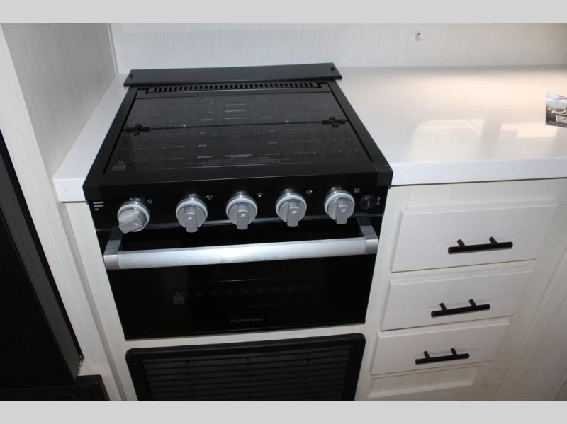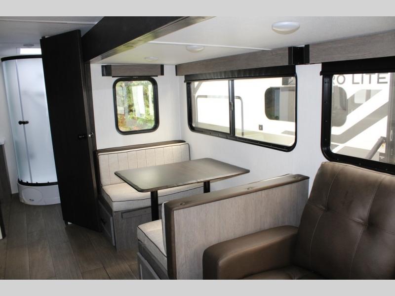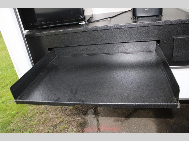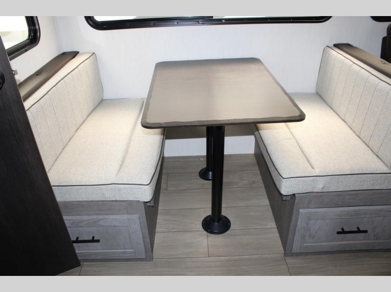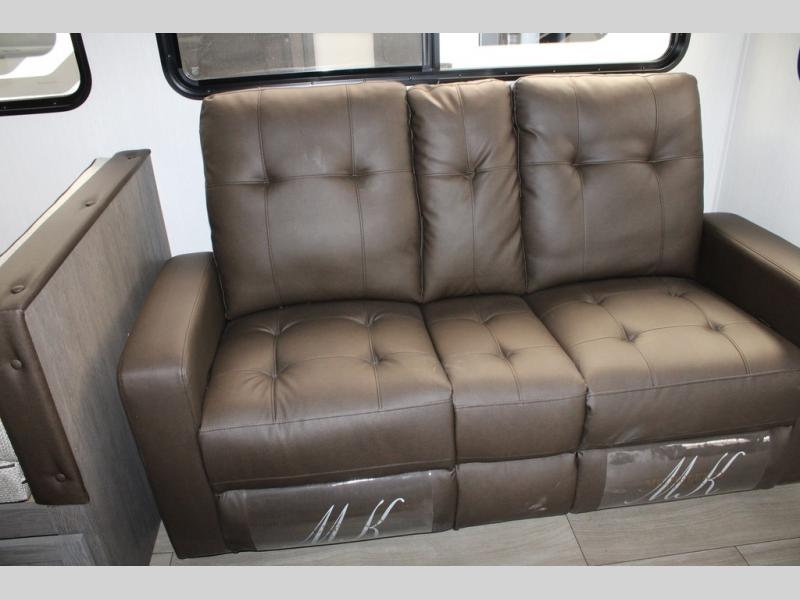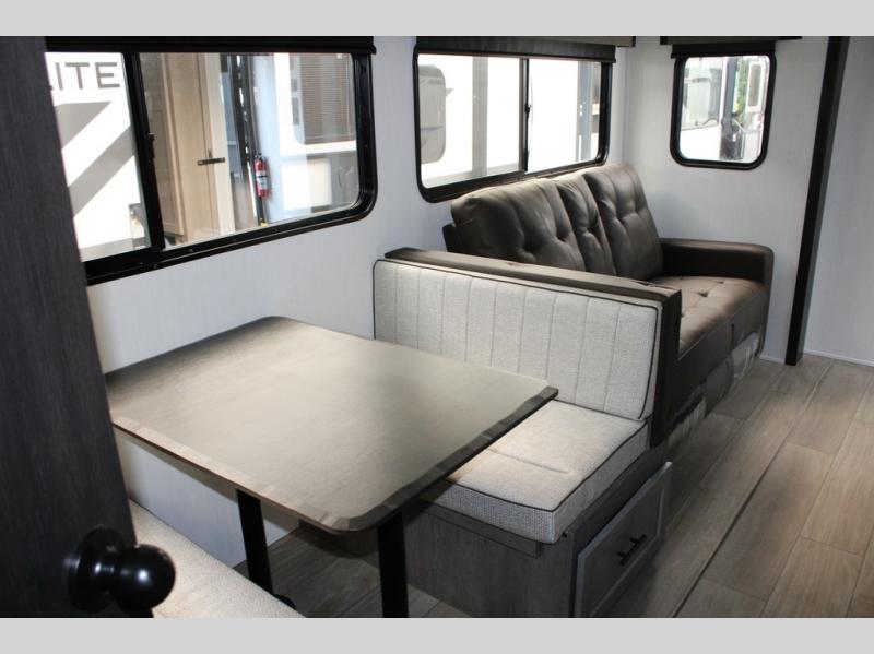 Head to your local state park in this travel trailer with a large slide out! You will love having more space to move about, and your crew can relax on the theater seating or play a game at the booth dinette. An optional TV can be added to the entertainment center, and the fireplace will make it feel a little more like home. There is a three burner cooktop and microwave oven in the kitchen, along with a 12V refrigerator and a walk-in pantry. If you enjoy cooking outdoors, then the outside kitchen will be waiting for you! The full rear bath will let you freshen up before bed, and the queen bed is sure to bring a great night's rest!