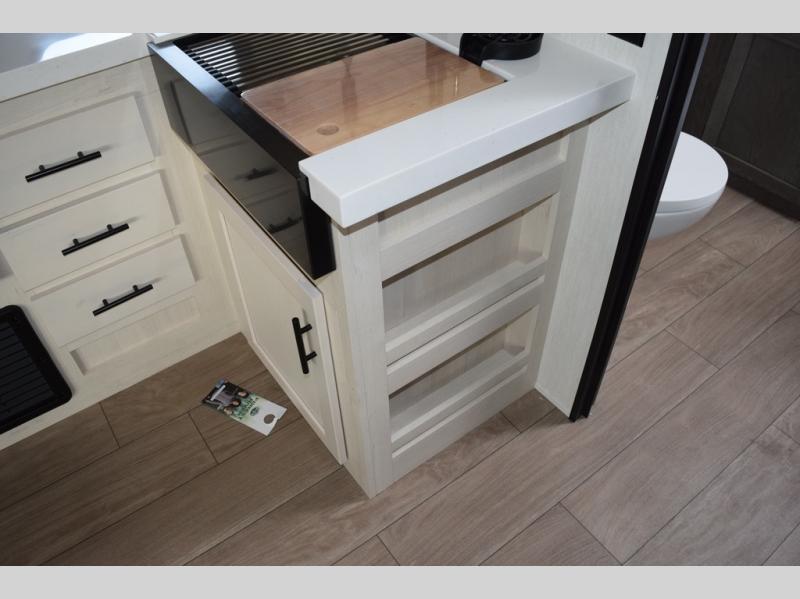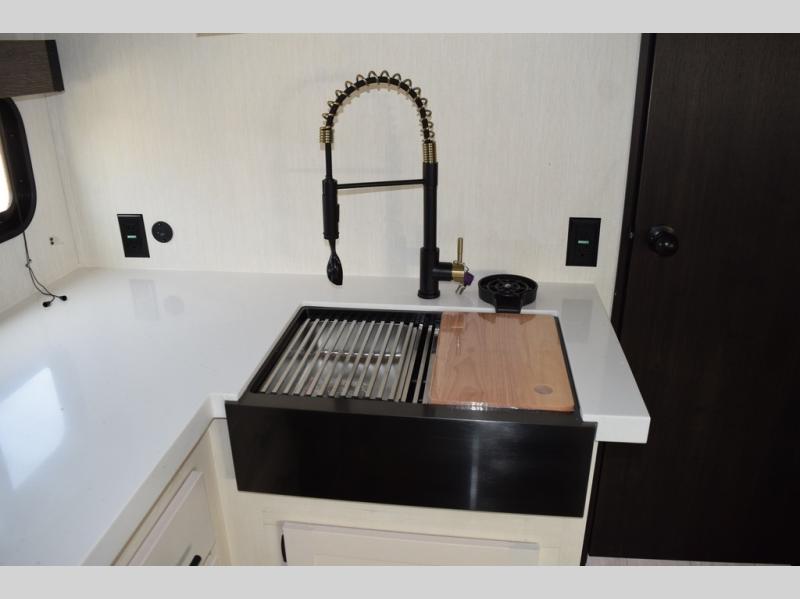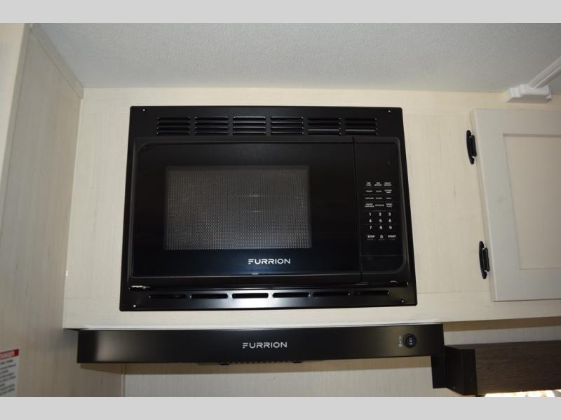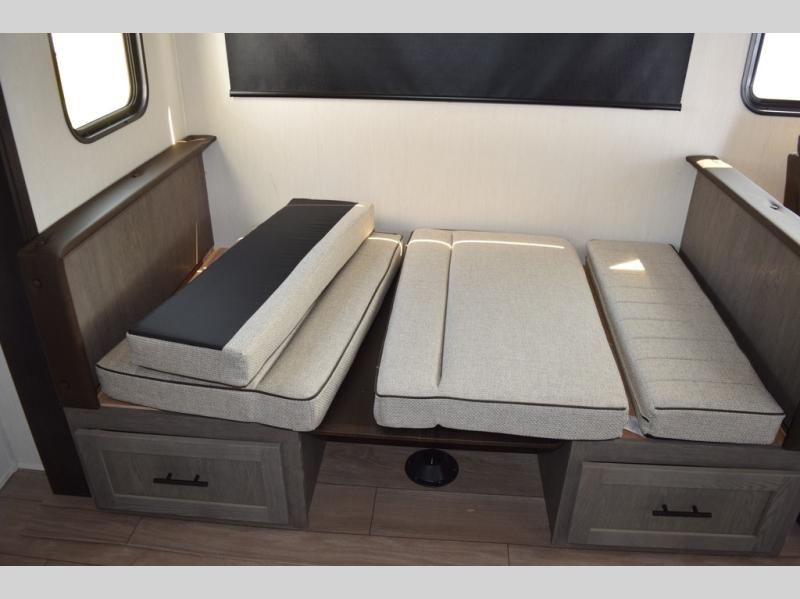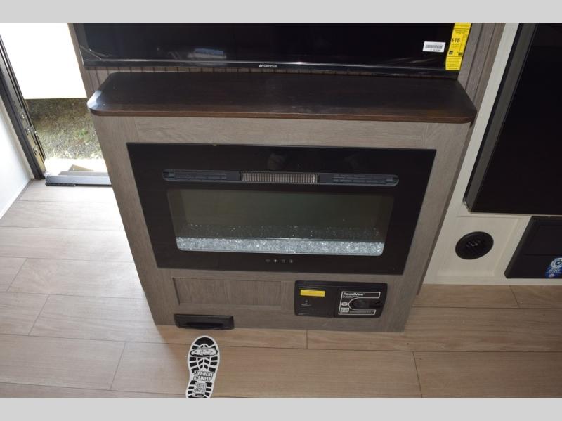 Head to your local state park in this travel trailer with a large slide out! You will love having more space to move about, and your crew can relax on the theater seating or play a game at the booth dinette. An optional TV can be added to the entertainment center, and the fireplace will make it feel a little more like home. There is a three burner cooktop and microwave oven in the kitchen, along with a 12V refrigerator and a walk-in pantry. If you enjoy cooking outdoors, then the outside kitchen will be waiting for you! The full rear bath will let you freshen up before bed, and the queen bed is sure to bring a great night's rest!