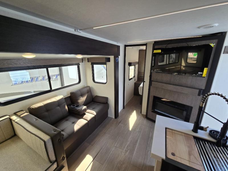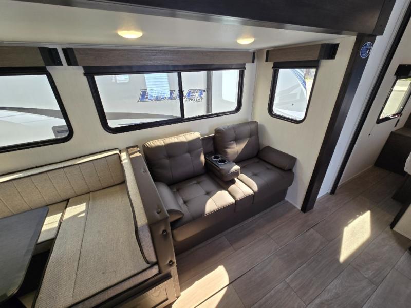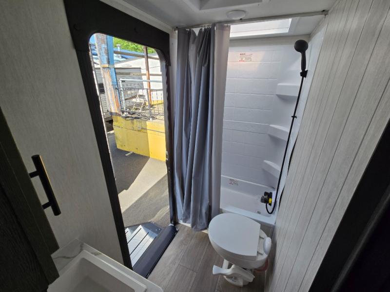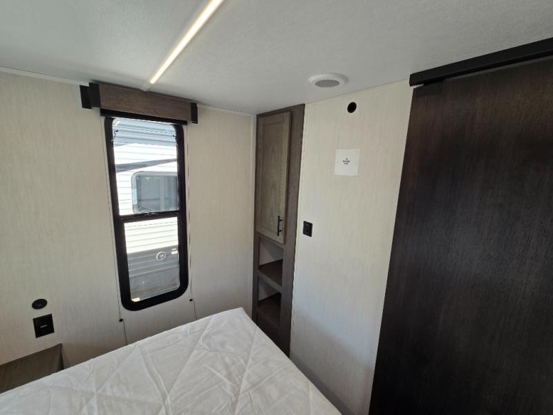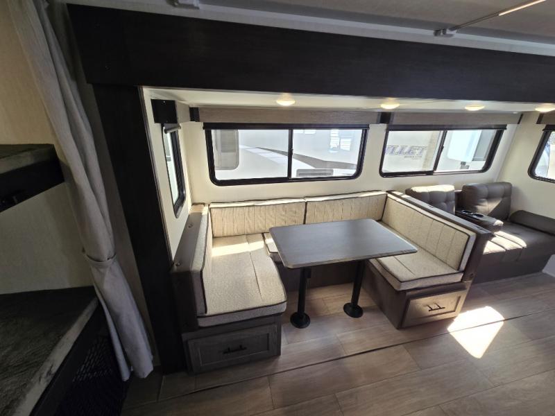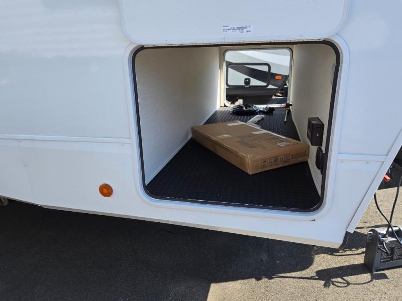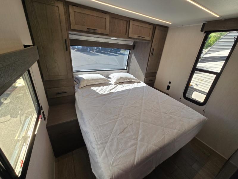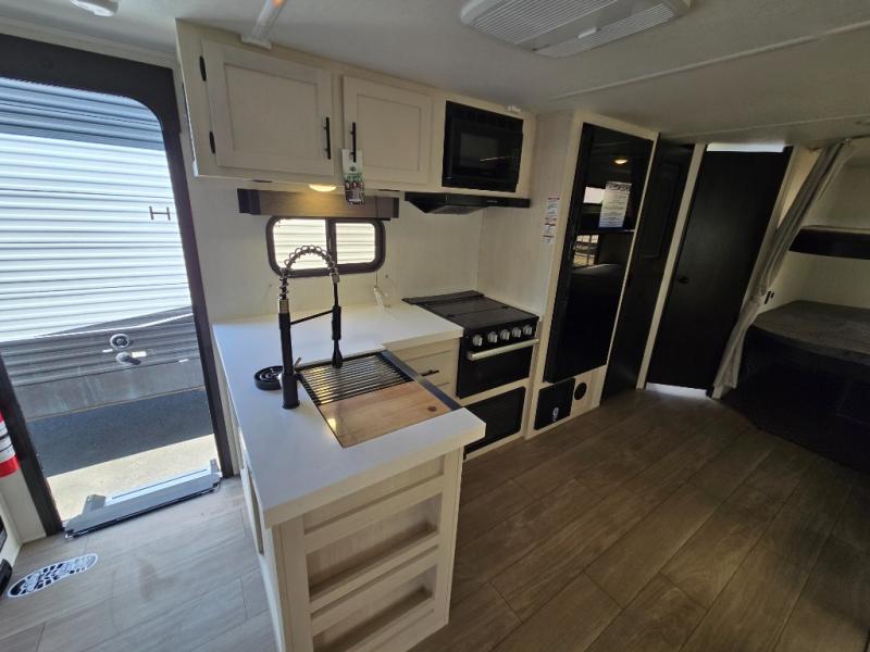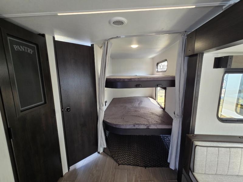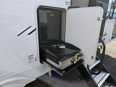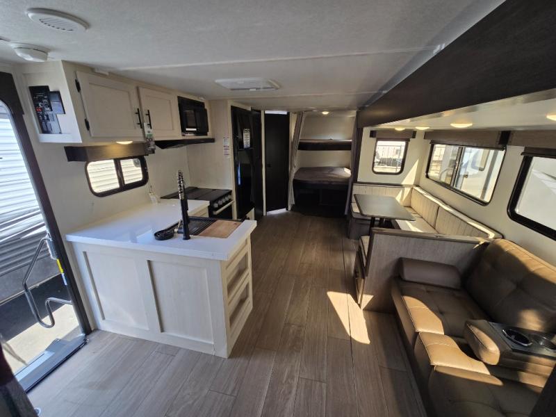 Looking for a multi-sleeper trailer to sleep nine to ten happy campers? You've found it in this dual entry model with an outside kitchen, double-size bunks, and a large slide out! The main living and kitchen area has a U-shaped dinette to utilize as a dining table, game table, work station, and/or an extra sleeping space. You will also find a hidden pantry behind the entertainment center and full kitchen amenities including a large sink and a residential-style refrigerator. The exterior provides a 20' awning for an outdoor living area, outside storage, plus large steps with oversized landing and quick release for convenience. You will also appreciate the Juice Pack that comes with a 100W solar panel, a battery, a 30 AMP solar charger, and more!