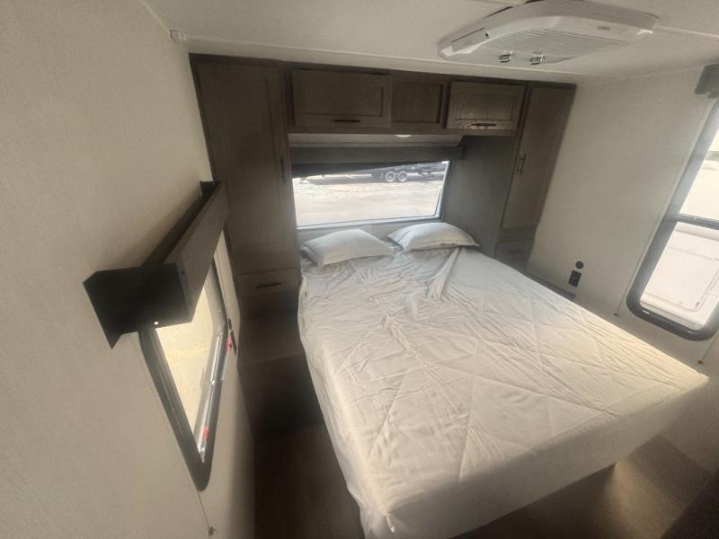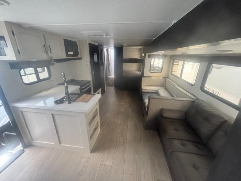 Looking for a multi-sleeper trailer to sleep nine to ten happy campers? You've found it in this dual entry model with an outside kitchen, double-size bunks, and a large slide out! The main living and kitchen area has a U-shaped dinette to utilize as a dining table, game table, work station, and/or an extra sleeping space. You will also find a hidden pantry behind the entertainment center and full kitchen amenities including a large sink and a residential-style refrigerator. The exterior provides a 20' awning for an outdoor living area, outside storage, plus large steps with oversized landing and quick release for convenience. You will also appreciate the Juice Pack that comes with a 100W solar panel, a battery, a 30 AMP solar charger, and more!
