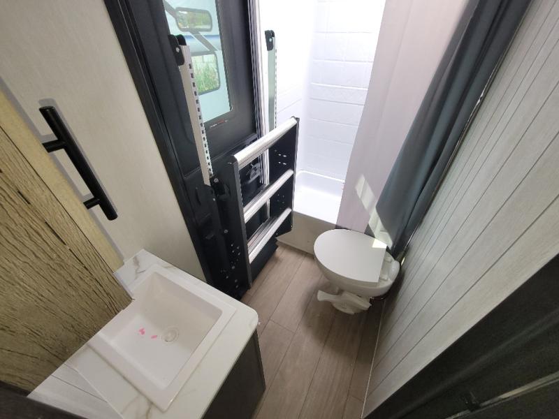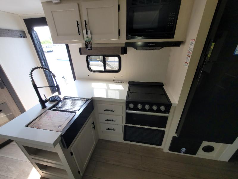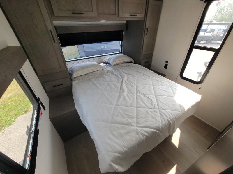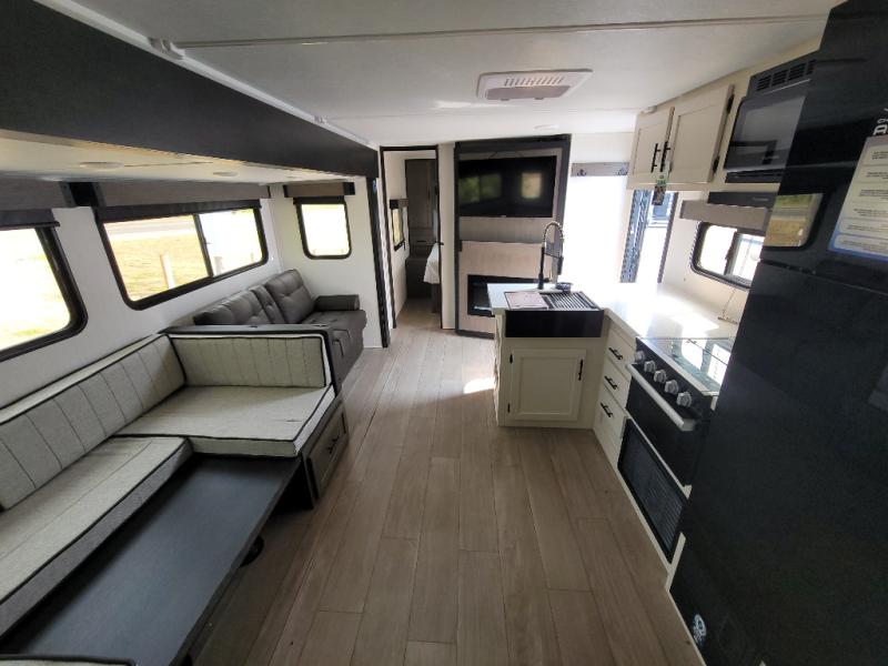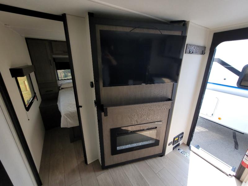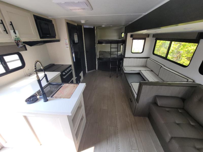 Looking for a multi-sleeper trailer to sleep nine to ten happy campers? You've found it in this dual entry model with an outside kitchen, double-size bunks, and a large slide out! The main living and kitchen area has a U-shaped dinette to utilize as a dining table, game table, work station, and/or an extra sleeping space. You will also find a hidden pantry behind the entertainment center and full kitchen amenities including a large sink and a residential-style refrigerator. The exterior provides a 20' awning for an outdoor living area, outside storage, plus large steps with oversized landing and quick release for convenience. You will also appreciate the Juice Pack that comes with a 100W solar panel, a battery, a 30 AMP solar charger, and more!