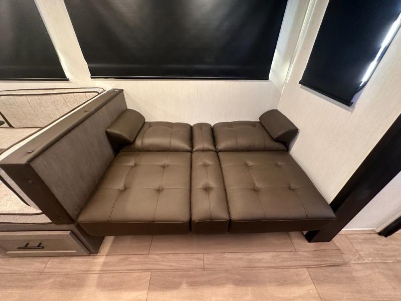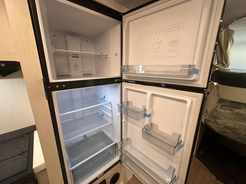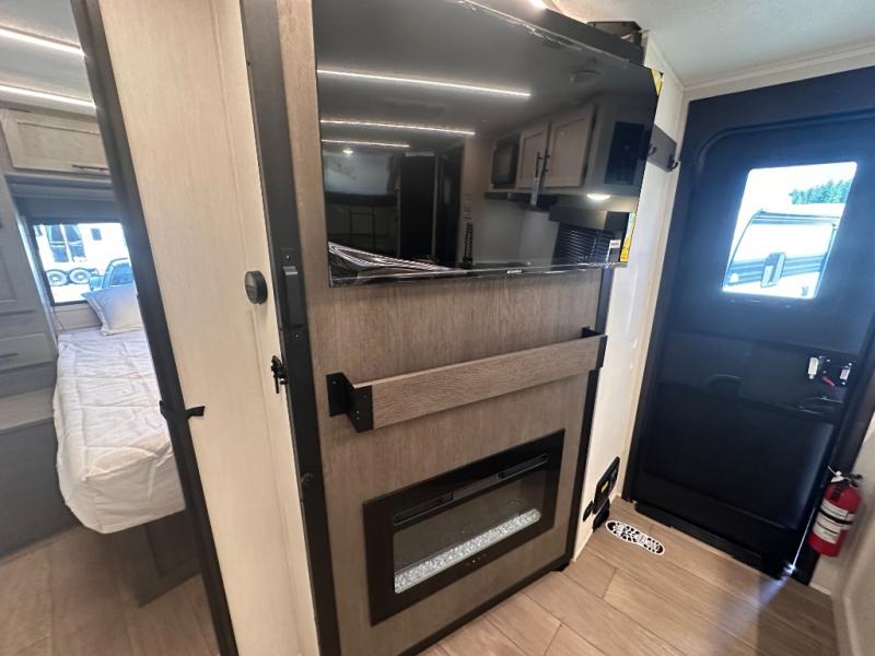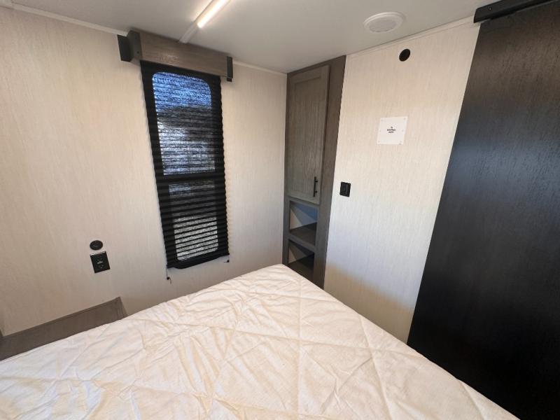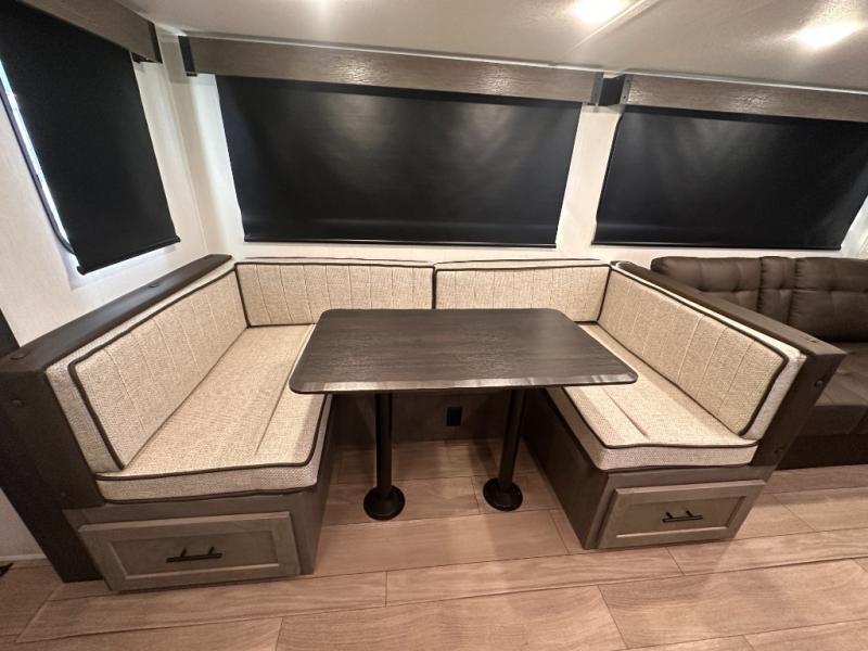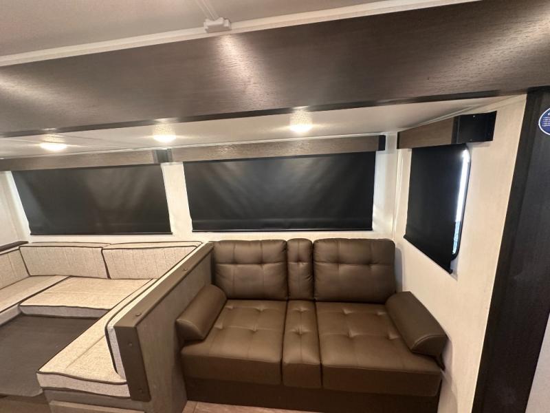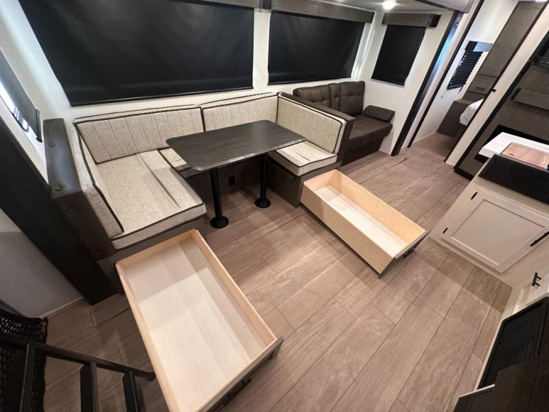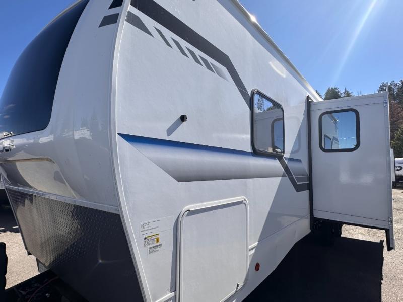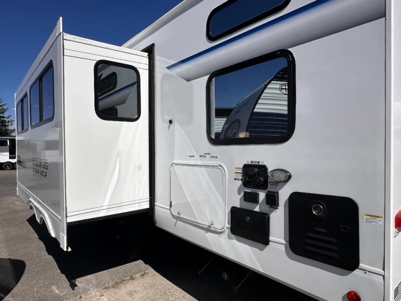 Looking for a multi-sleeper trailer to sleep nine to ten happy campers? You've found it in this dual entry model with an outside kitchen, double-size bunks, and a large slide out! The main living and kitchen area has a U-shaped dinette to utilize as a dining table, game table, work station, and/or an extra sleeping space. You will also find a hidden pantry behind the entertainment center and full kitchen amenities including a large sink and a residential-style refrigerator. The exterior provides a 20' awning for an outdoor living area, outside storage, plus large steps with oversized landing and quick release for convenience. You will also appreciate the Juice Pack that comes with a 100W solar panel, a battery, a 30 AMP solar charger, and more!