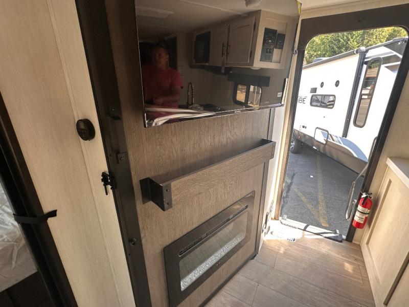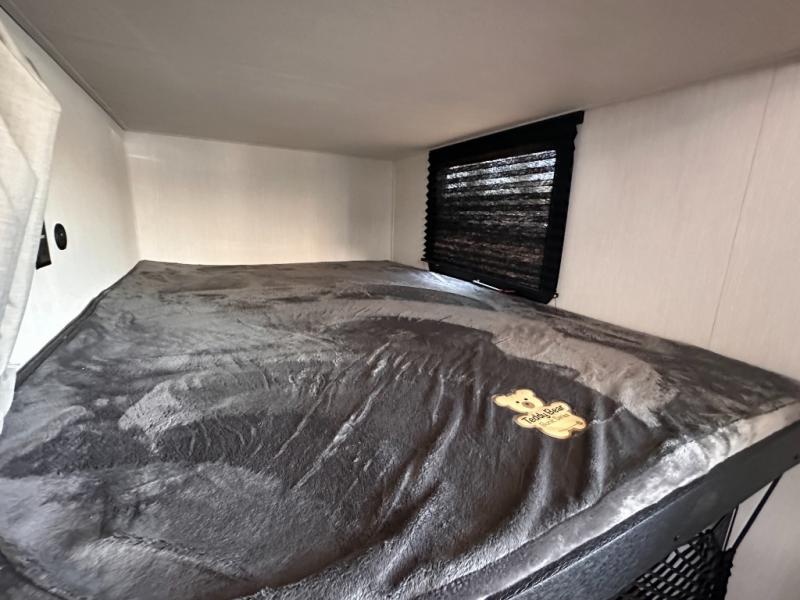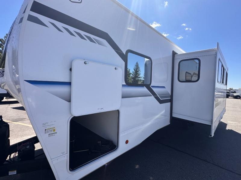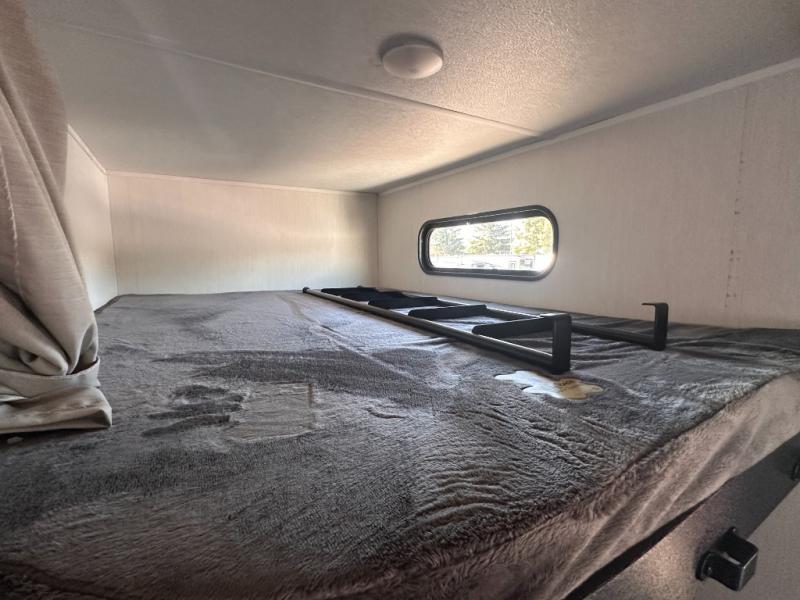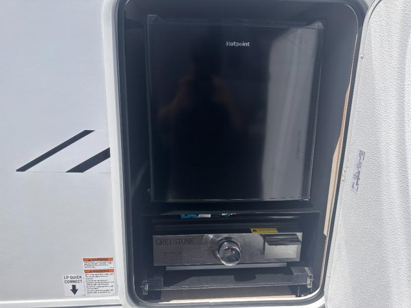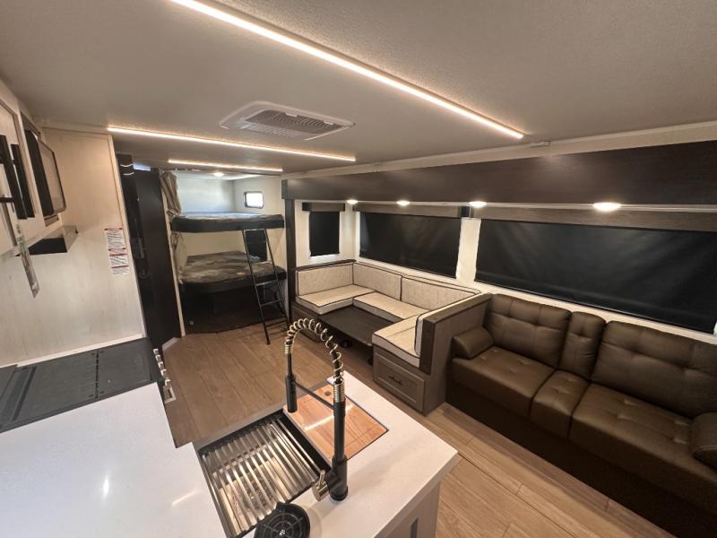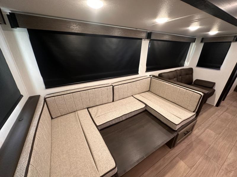 Looking for a multi-sleeper trailer to sleep nine to ten happy campers? You've found it in this dual entry model with an outside kitchen, double-size bunks, and a large slide out! The main living and kitchen area has a U-shaped dinette to utilize as a dining table, game table, work station, and/or an extra sleeping space. You will also find a hidden pantry behind the entertainment center and full kitchen amenities including a large sink and a residential-style refrigerator. The exterior provides a 20' awning for an outdoor living area, outside storage, plus large steps with oversized landing and quick release for convenience. You will also appreciate the Juice Pack that comes with a 100W solar panel, a battery, a 30 AMP solar charger, and more!