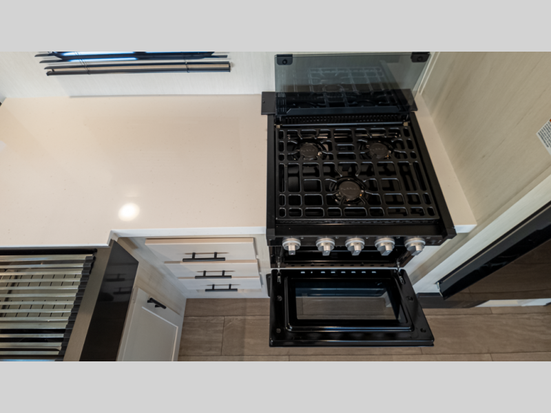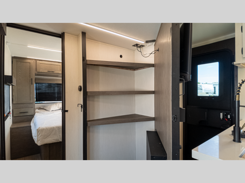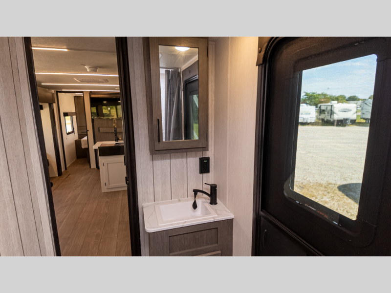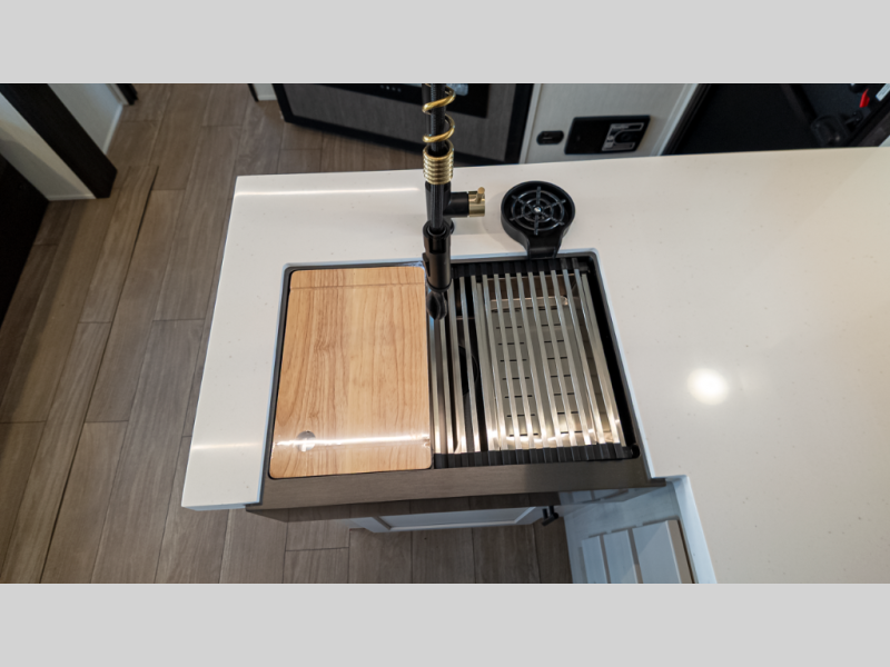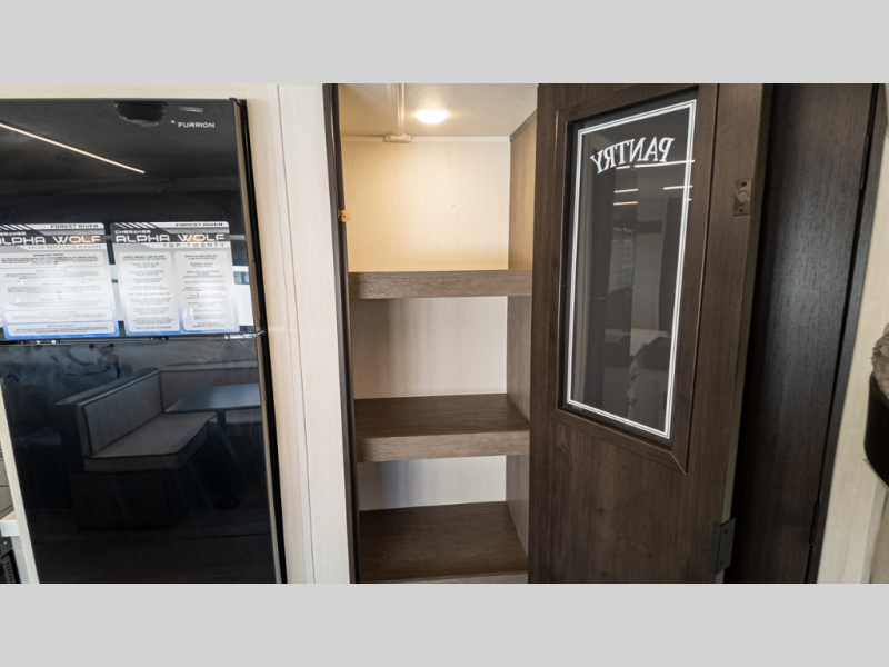 - Kitchen: Full-size pantry, 12-V residential fridge, farm-style sink, oven, microwave