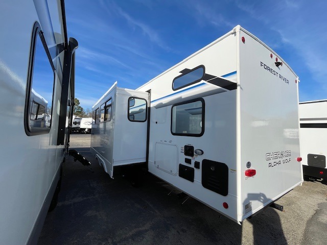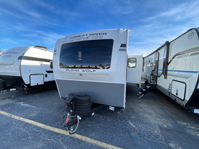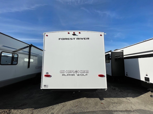 With any Cherokee Alpha Wolf travel trailer by Forest River, you'll enjoy outstanding amenities, quality construction, and an affordable price. Each model features a "ToughBend" rigid skirt metal design, 5/8" tongue and groove plywood floor decking, and a "SuperTruss" roof structure built for countless camping memories. There is a pet friendly "clean sweep" floor design with no heat vents indoors, along with a super lumen lighting system, a 15,000 BTU quick cool central air conditioning, and many more comforts. There are many convenient exterior features such as, Leash Latch pet safety technology, an outside shower with hot and cold water, and exterior steps with oversized landing and quick release. The Weather Guard Package will add protection against the elements with an armored underbelly tank enclosure and forced air heat, thermo-control reflective safety glass windows, and upgraded laminated exterior walls with block foam insulation!