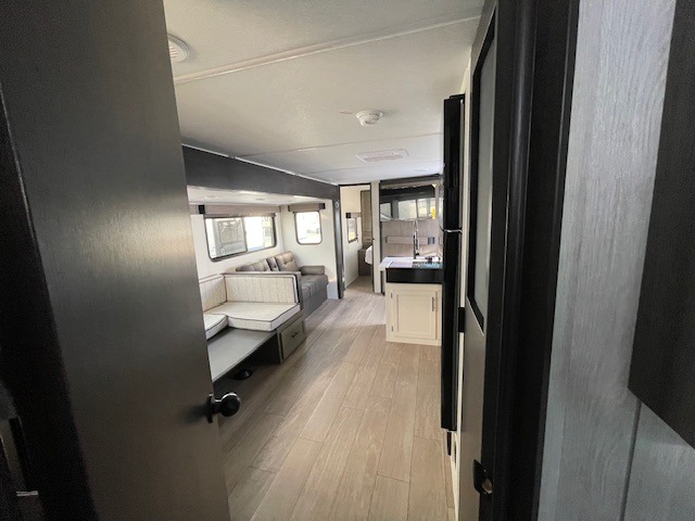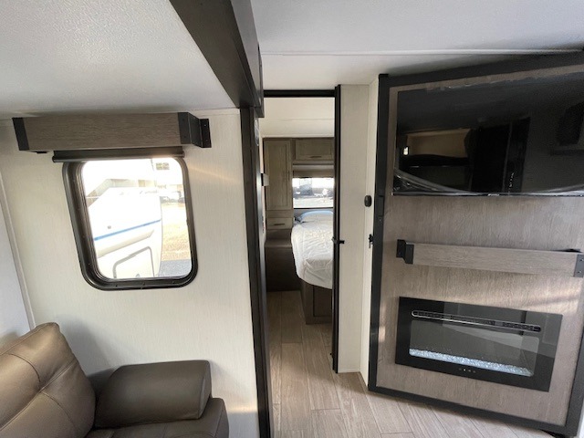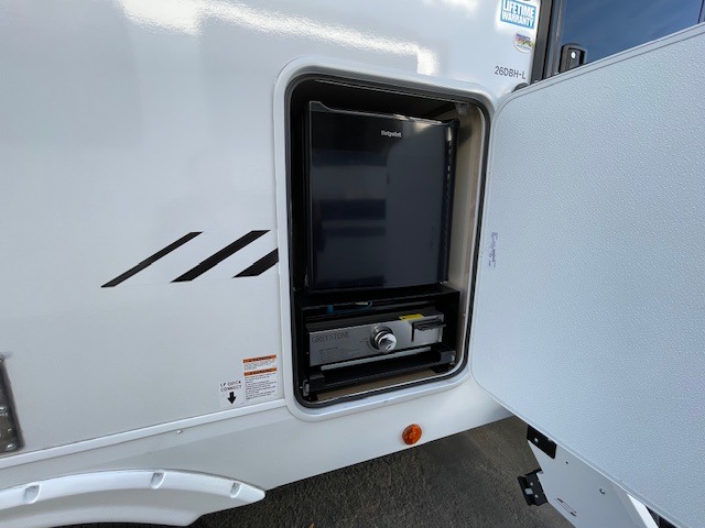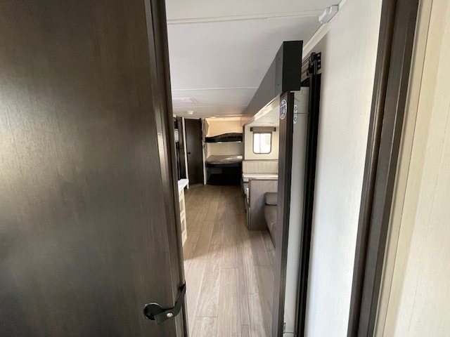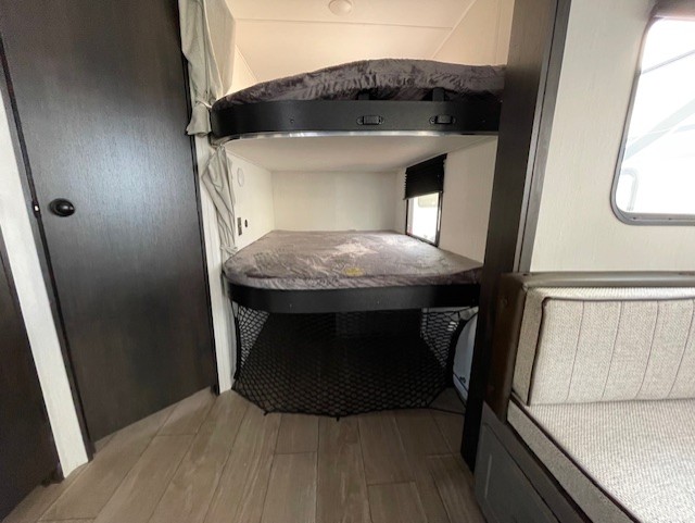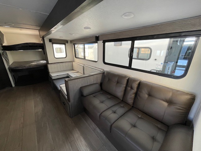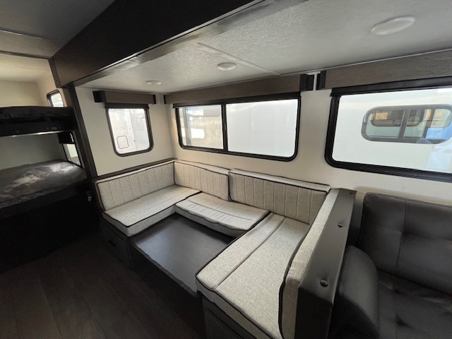 Looking for a multi-sleeper trailer to sleep up to nine campers? You've found it in this dual entry model with an outside kitchen, double-size bunks, and a large slide out! The main living and kitchen area has a U-shaped dinette to utilize as a dining table, game table, work station, and/or an extra sleeping space. You will also find a hidden pantry behind the entertainment center and full kitchen amenities including a large sink and a residential-style refrigerator. The exterior provides a 20' awning for an outdoor living area, outside storage, plus large steps with oversized landing and quick release for convenience. You will also appreciate the Juice Pack that comes with a 100W solar panel, a battery, a 30 AMP solar charger, and more!