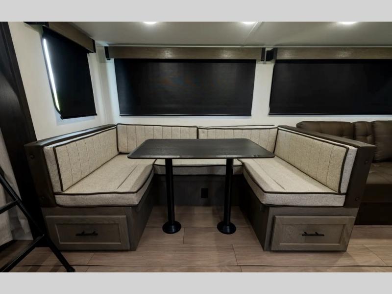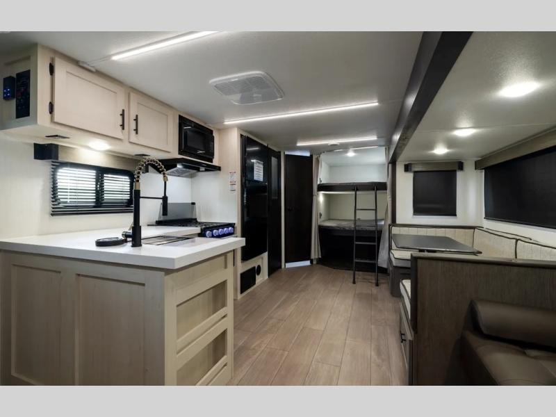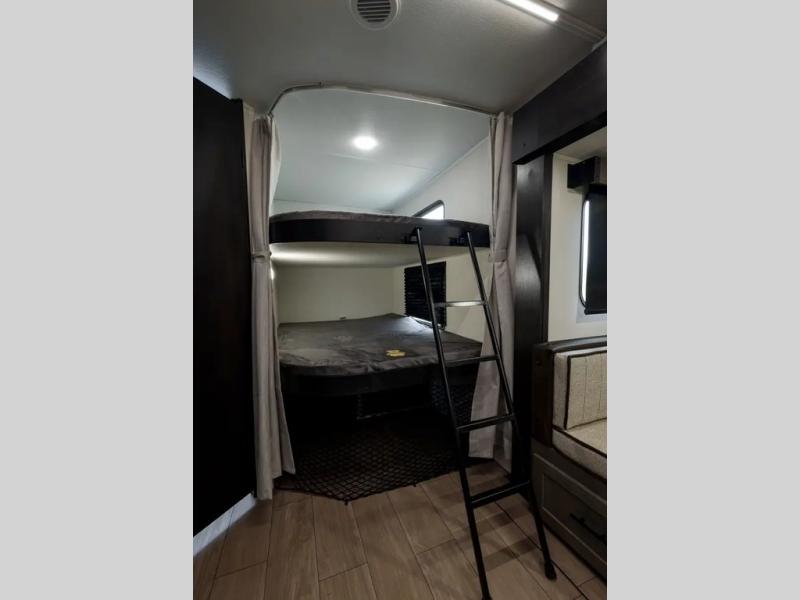 Looking for a multi-sleeper trailer to sleep up to nine campers? You've found it in this dual entry model with an outside kitchen, double-size bunks, and a large slide out! The main living and kitchen area has a U-shaped dinette to utilize as a dining table, game table, work station, and/or an extra sleeping space. You will also find a hidden pantry behind the entertainment center and full kitchen amenities including a large sink and a residential-style refrigerator. The exterior provides a 20' awning for an outdoor living area, outside storage, plus large steps with oversized landing and quick release for convenience. You will also appreciate the Juice Pack that comes with a 100W solar panel, a battery, a 30 AMP solar charger, and more!