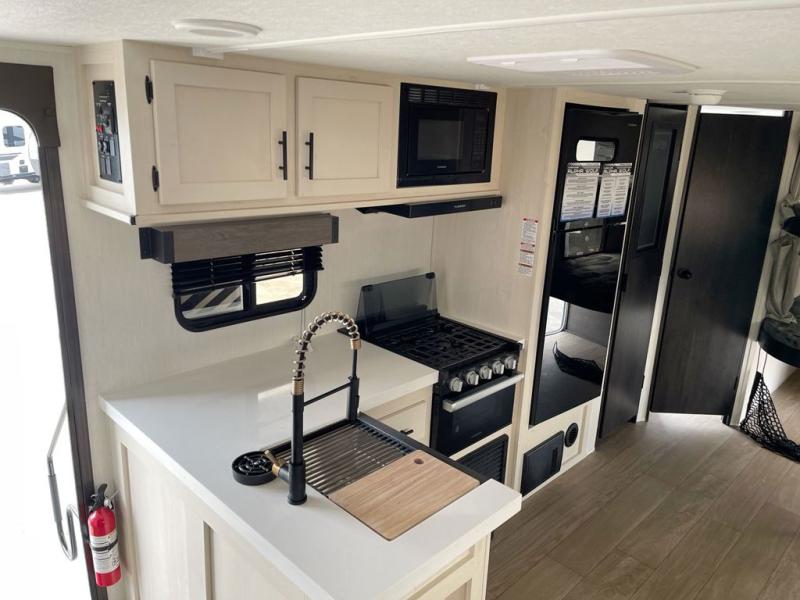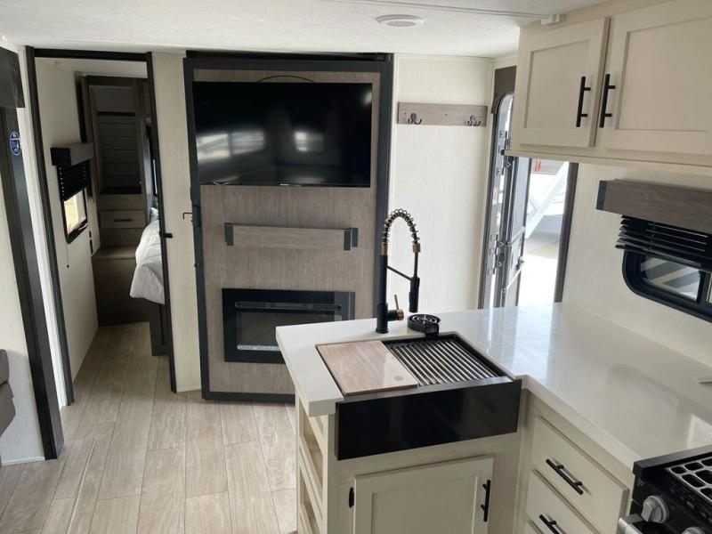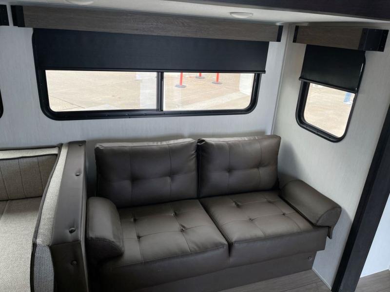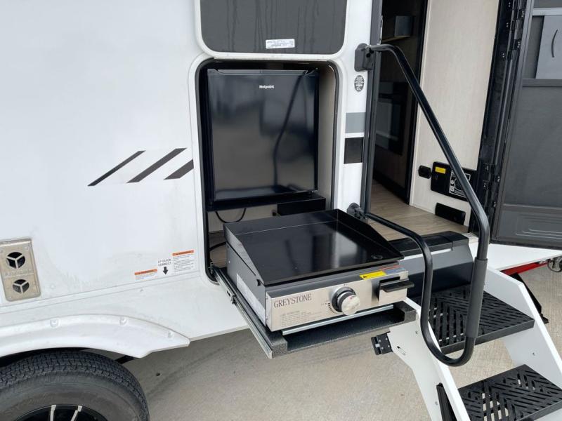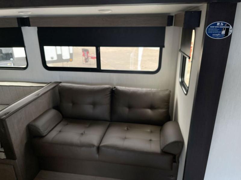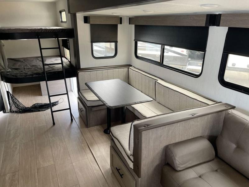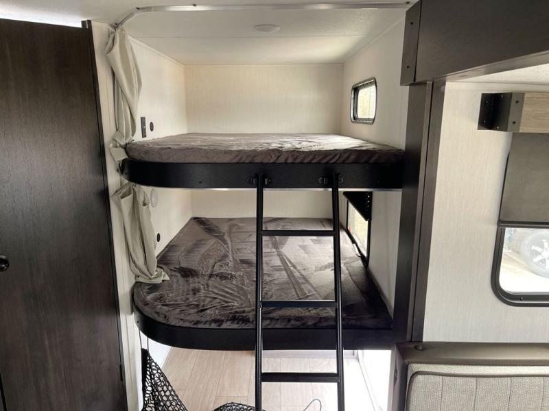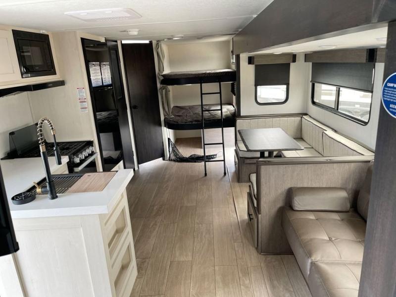 Looking for a multi-sleeper trailer to sleep up to nine campers? You've found it in this dual entry model with an outside kitchen, double-size bunks, and a large slide out! The main living and kitchen area has a U-shaped dinette to utilize as a dining table, game table, work station, and/or an extra sleeping space. You will also find a hidden pantry behind the entertainment center and full kitchen amenities including a large sink and a residential-style refrigerator. The exterior provides a 20' awning for an outdoor living area, outside storage, plus large steps with oversized landing and quick release for convenience. You will also appreciate the Juice Pack that comes with a 100W solar panel, a battery, a 30 AMP solar charger, and more!
