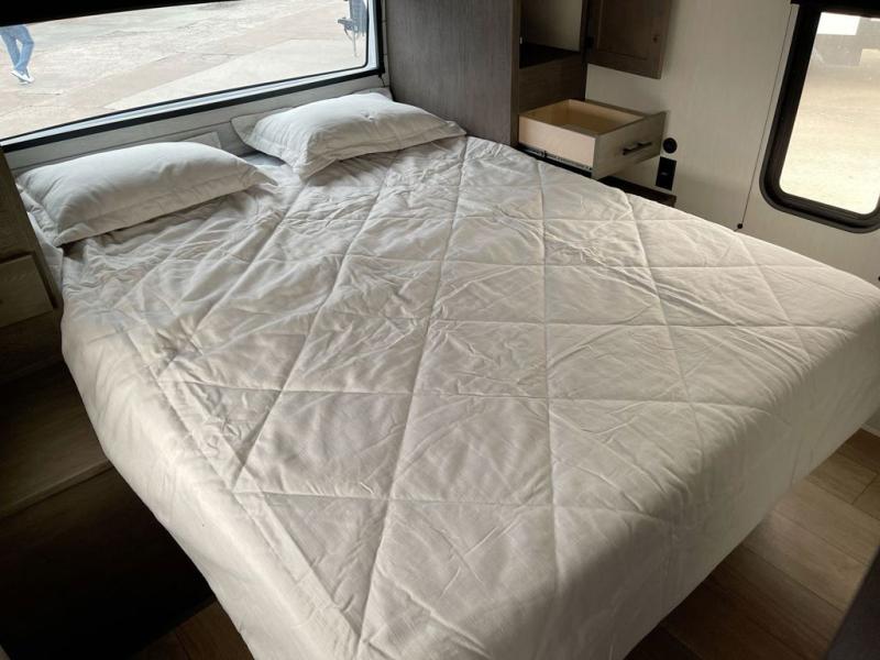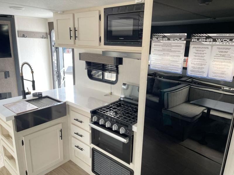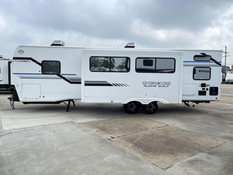 With any Cherokee Alpha Wolf travel trailer by Forest River, you'll enjoy outstanding amenities, quality construction, and an affordable price. Each model features a "ToughBend" rigid skirt metal design, 5/8" tongue and groove plywood floor decking, and a "SuperTruss" roof structure built for countless camping memories. There is a pet friendly "clean sweep" floor design with no heat vents indoors, along with a super lumen lighting system, a 15,000 BTU quick cool central air conditioning, and many more comforts. There are many convenient exterior features such as, Leash Latch pet safety technology, an outside shower with hot and cold water, and exterior steps with oversized landing and quick release. The Weather Guard Package will add protection against the elements with an armored underbelly tank enclosure and forced air heat, thermo-control reflective safety glass windows, and upgraded laminated exterior walls with block foam insulation!