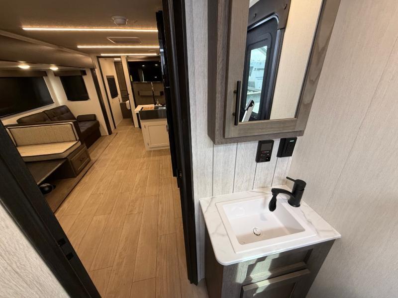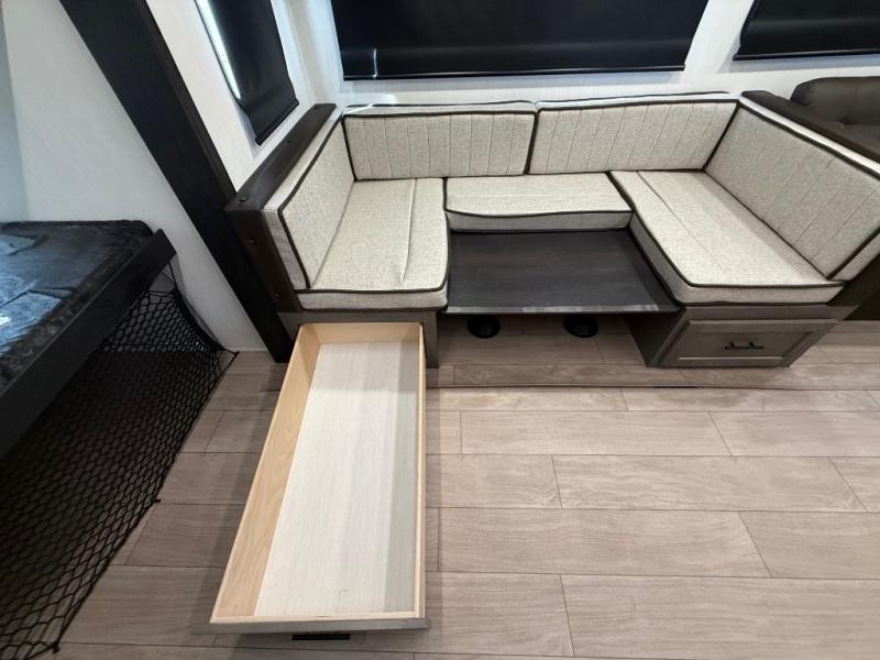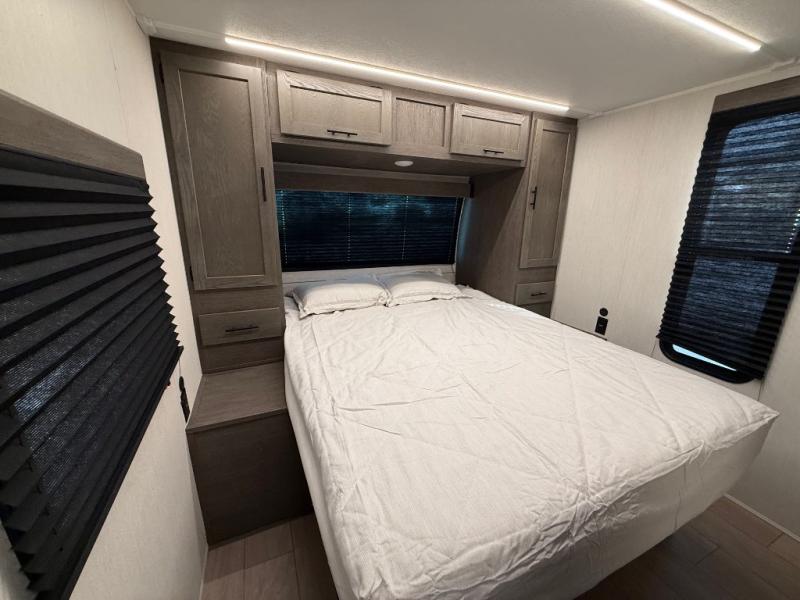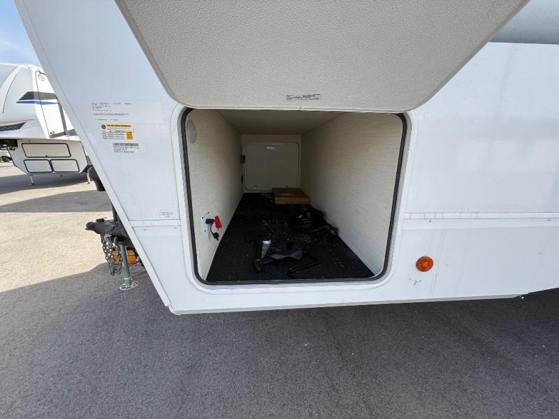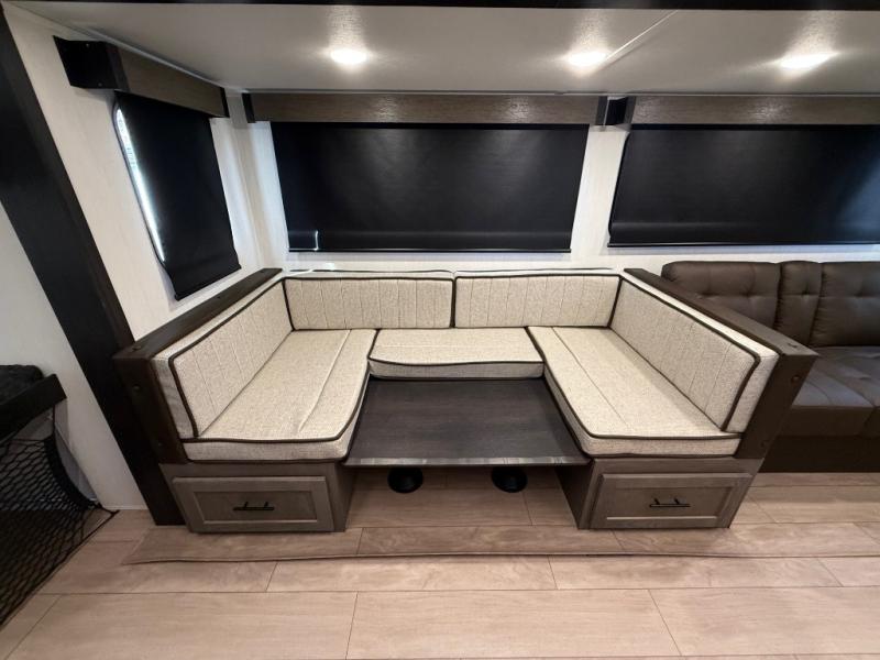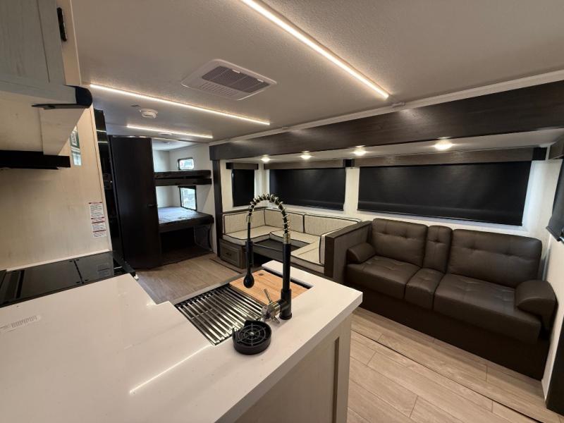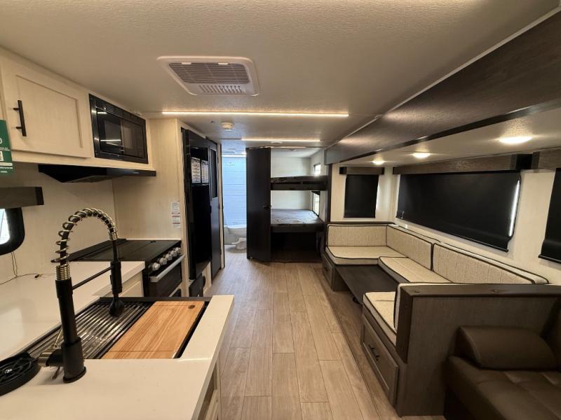 Looking for a multi-sleeper trailer to sleep up to nine campers? You've found it in this dual entry model with an outside kitchen, double-size bunks, and a large slide out! The main living and kitchen area has a U-shaped dinette to utilize as a dining table, game table, work station, and/or an extra sleeping space. You will also find a hidden pantry behind the entertainment center and full kitchen amenities including a large sink and a residential-style refrigerator. The exterior provides a 20' awning for an outdoor living area, outside storage, plus large steps with oversized landing and quick release for convenience. You will also appreciate the Juice Pack that comes with a 100W solar panel, a battery, a 30 AMP solar charger, and more!