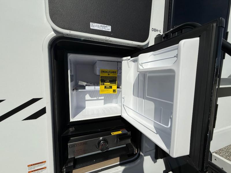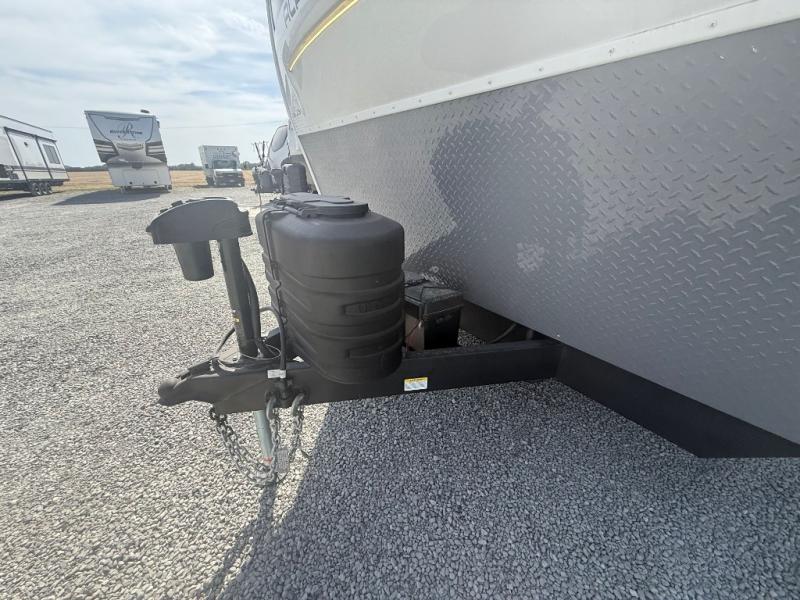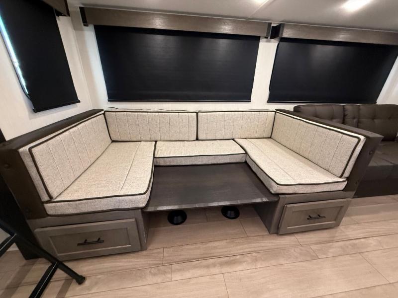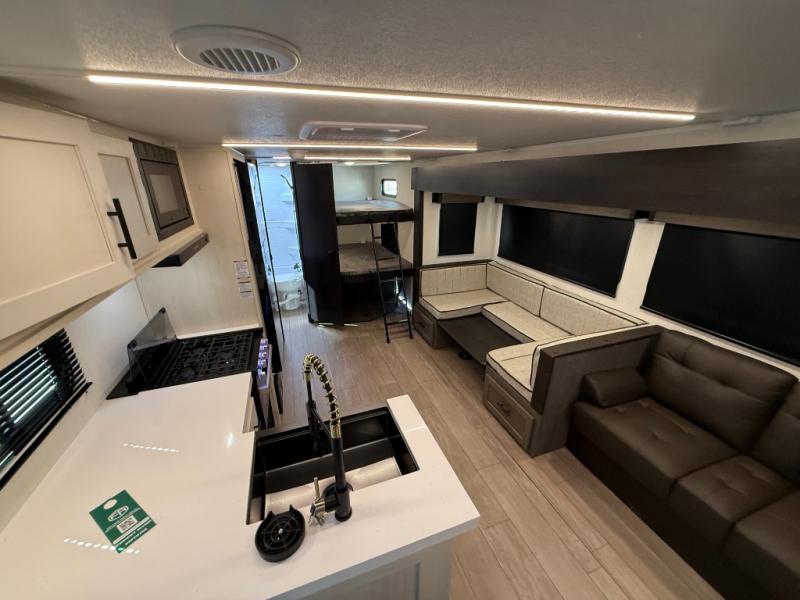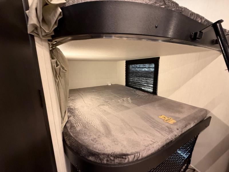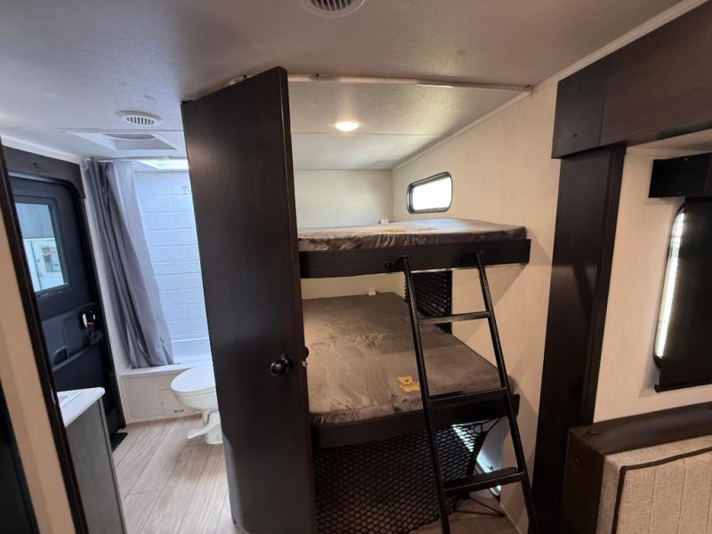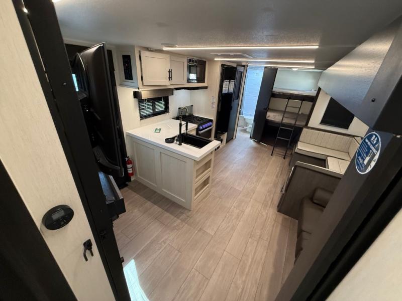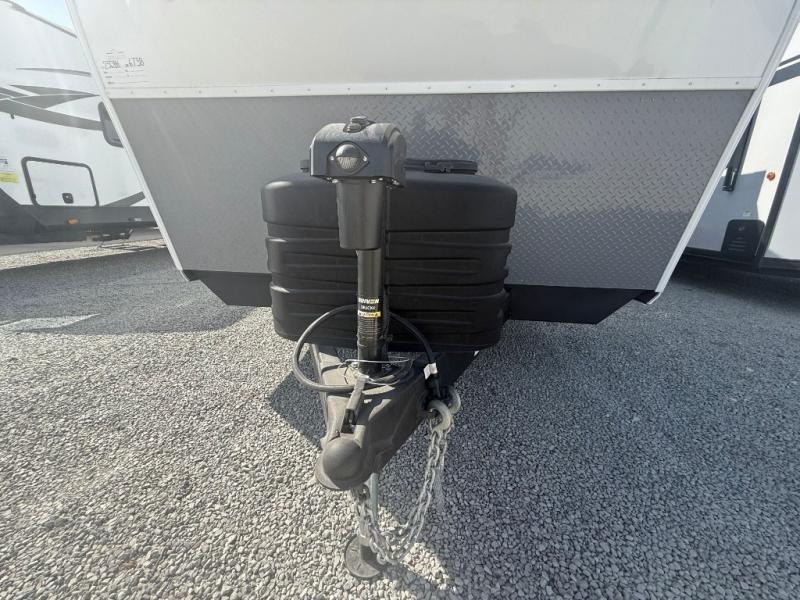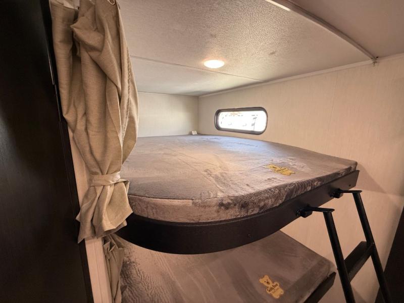 Looking for a multi-sleeper trailer to sleep nine to ten happy campers? You've found it in this dual entry model with an outside kitchen, double-size bunks, and a large slide out! The main living and kitchen area has a U-shaped dinette to utilize as a dining table, game table, work station, and/or an extra sleeping space. You will also find a hidden pantry behind the entertainment center and full kitchen amenities including a large sink and a residential-style refrigerator. The exterior provides a 20' awning for an outdoor living area, outside storage, plus large steps with oversized landing and quick release for convenience. You will also appreciate the Juice Pack that comes with a 100W solar panel, a battery, a 30 AMP solar charger, and more!