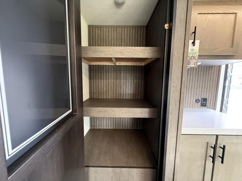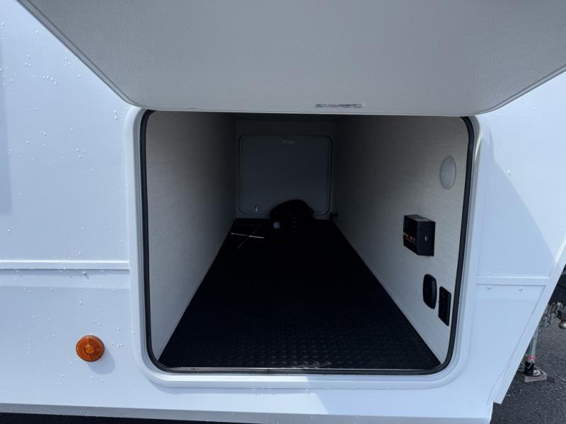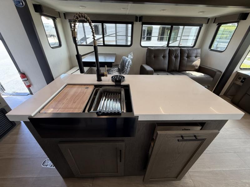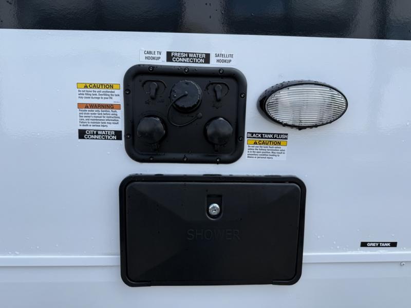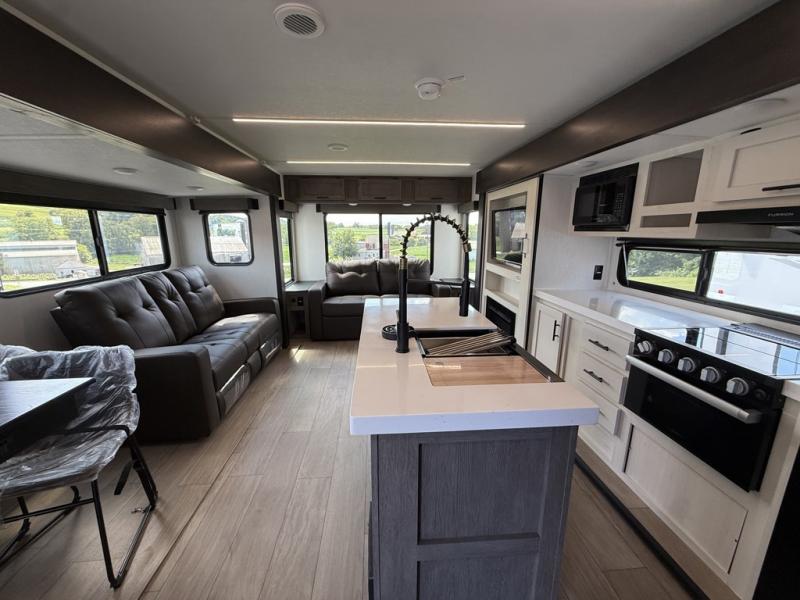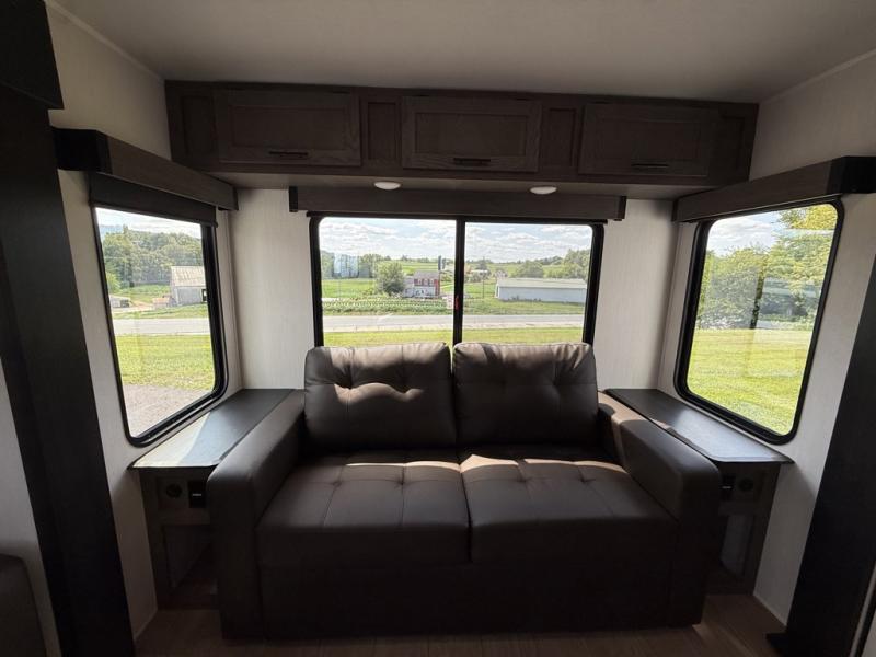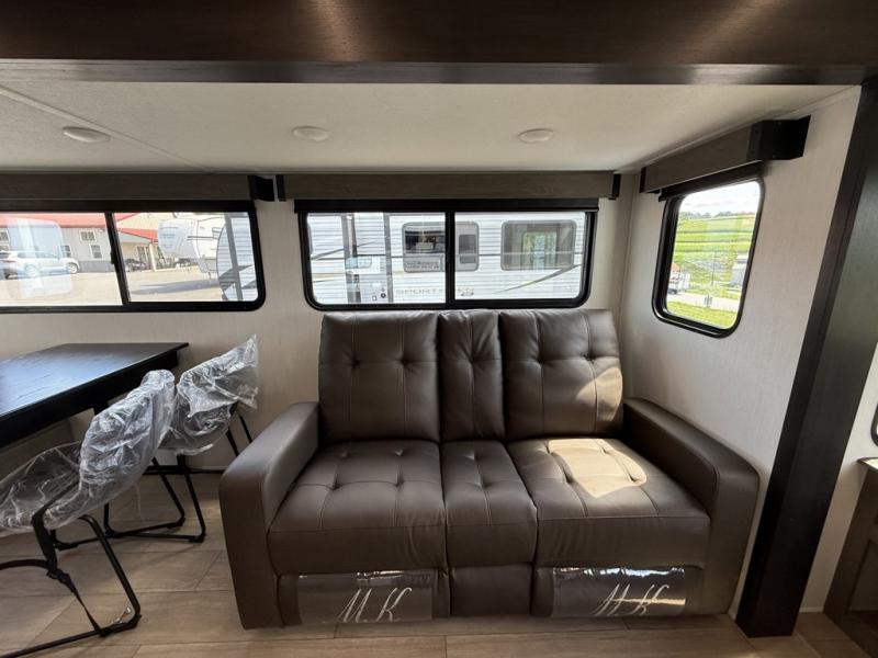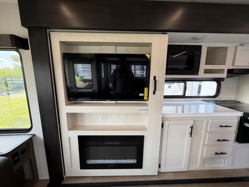 This trailer has it all for maximum comfort and convenience as well as entertainment! The rear living area includes a tri-fold sofa with a rear Pano-Vision window for great views of your campsite, and dual opposing slides widen this area so you can visit with friends. You'll also find theater seating, plus a free-standing table with two chairs and a storage ottoman seat. Enjoy the fireplace on a cool night or when you want a little ambiance while seated inside. Two patio awnings will provide an outdoor living area; just grab your camping chairs from the full pass-through storage. When you want to call it a night, fall quickly to sleep on the queen bed in the front bedroom with easy access to a dual entry bathroom!