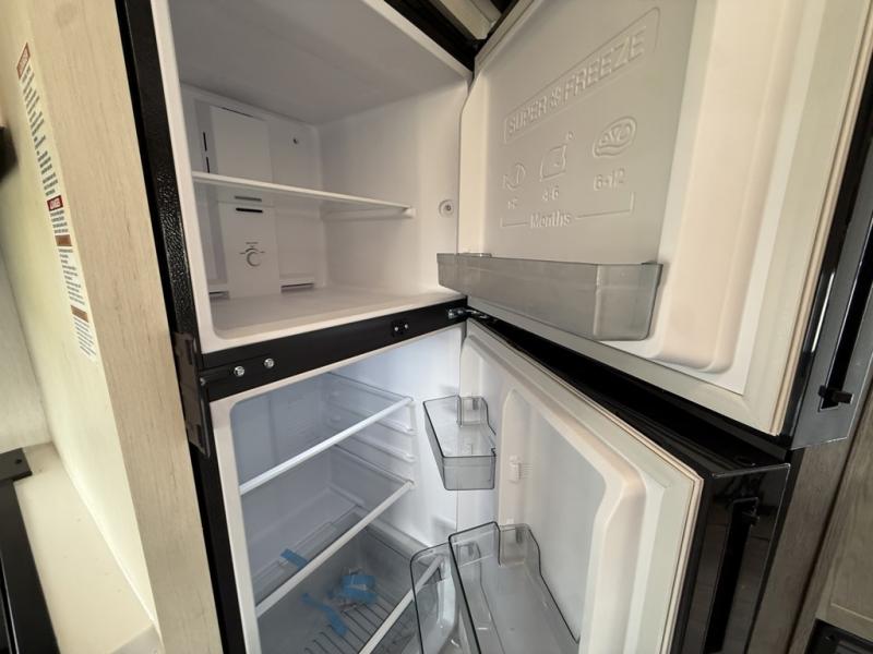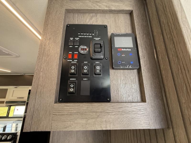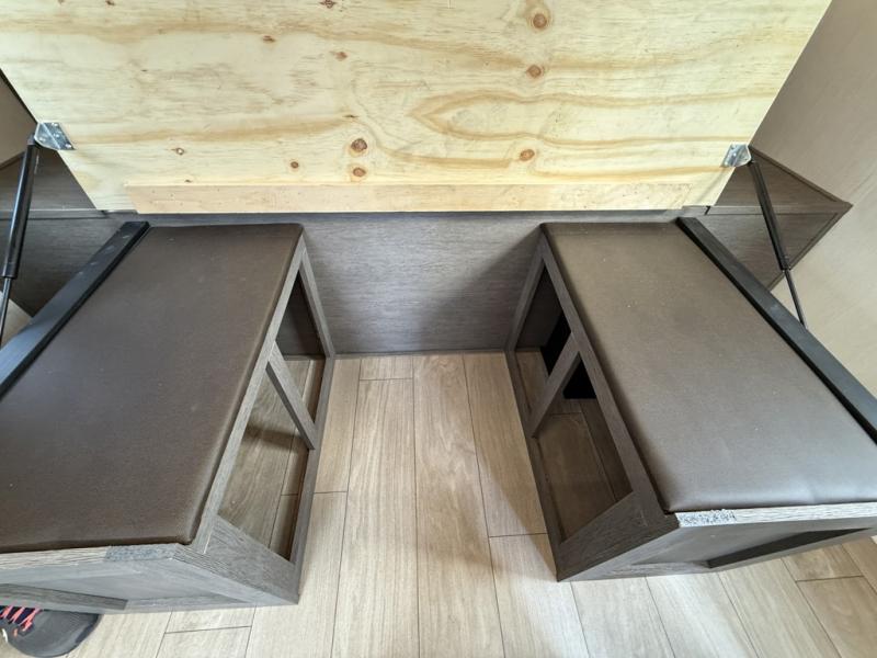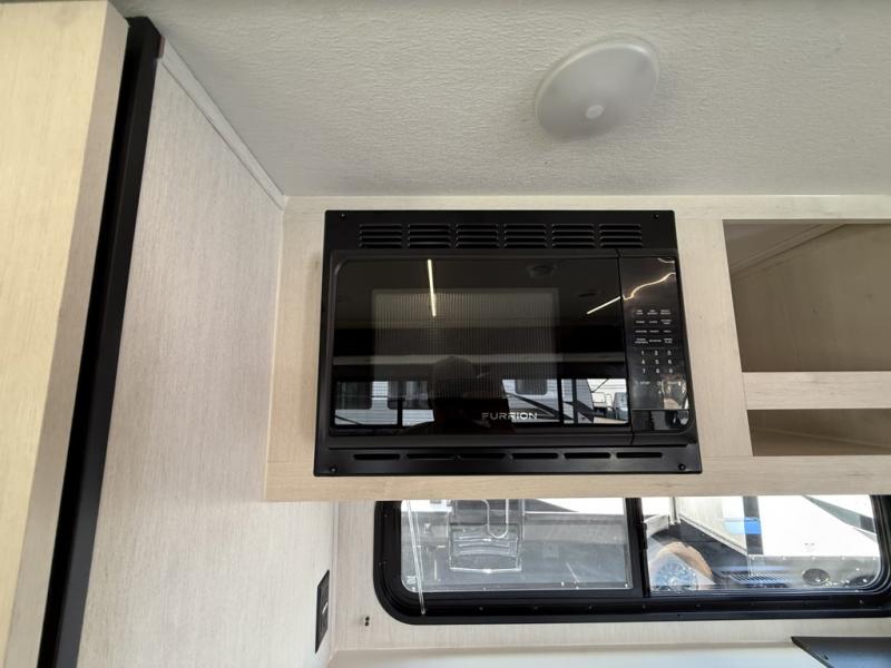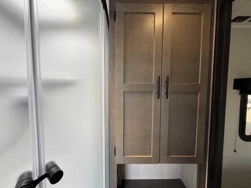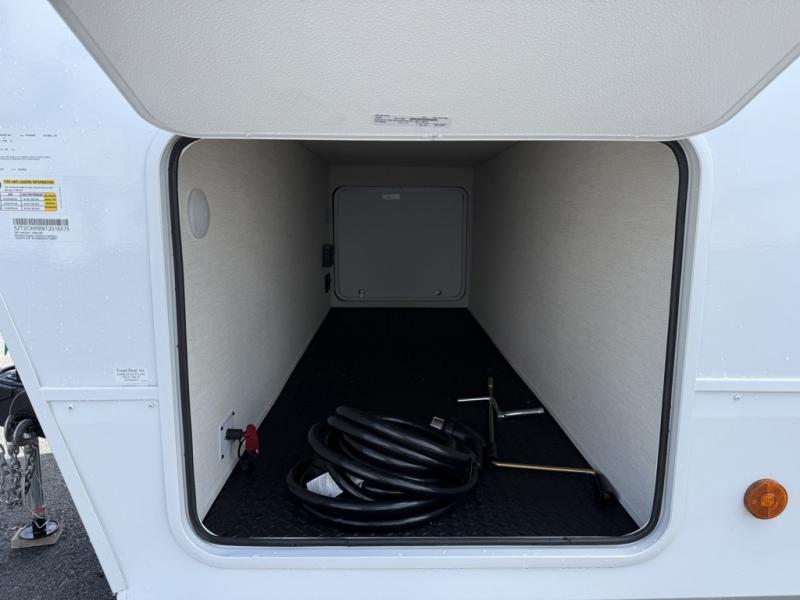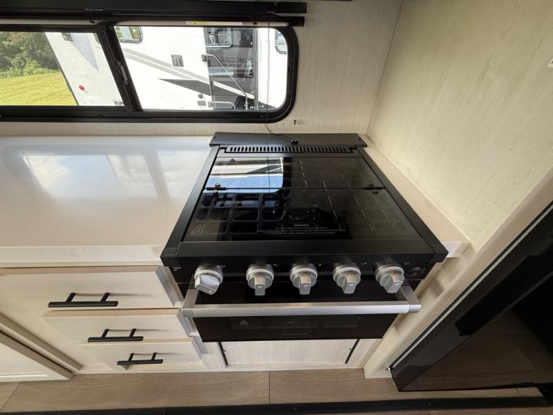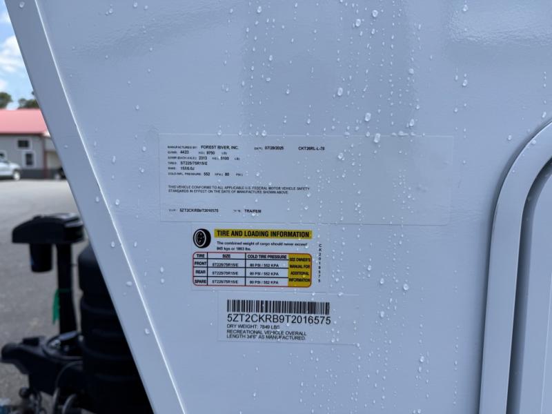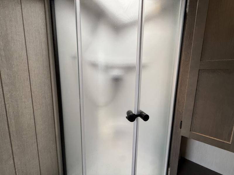 This trailer has it all for maximum comfort and convenience as well as entertainment! The rear living area includes a tri-fold sofa with a rear Pano-Vision window for great views of your campsite, and dual opposing slides widen this area so you can visit with friends. You'll also find theater seating, plus a free-standing table with two chairs and a storage ottoman seat. Enjoy the fireplace on a cool night or when you want a little ambiance while seated inside. Two patio awnings will provide an outdoor living area; just grab your camping chairs from the full pass-through storage. When you want to call it a night, fall quickly to sleep on the queen bed in the front bedroom with easy access to a dual entry bathroom!