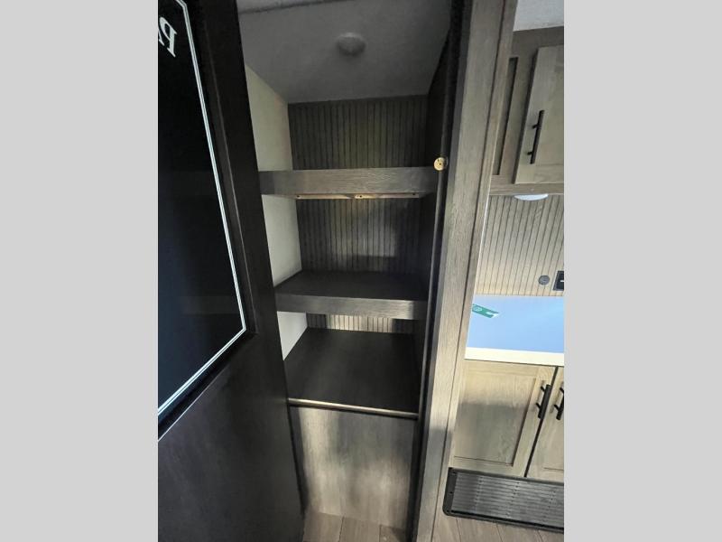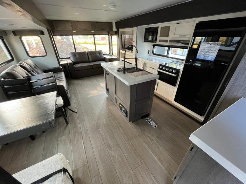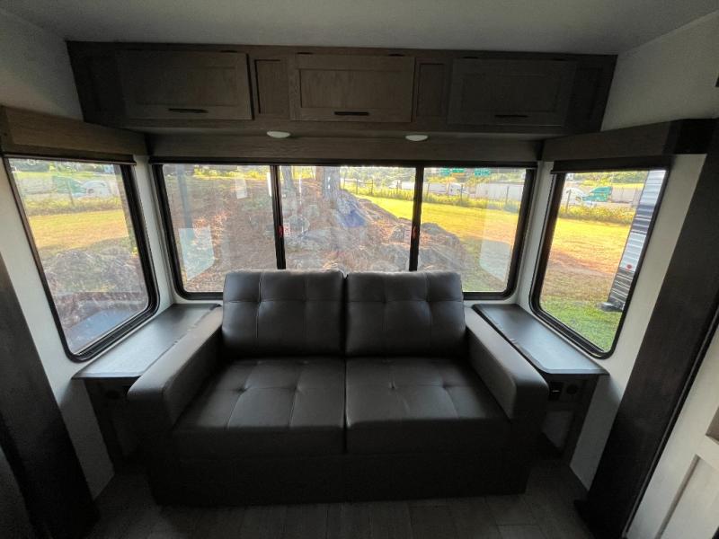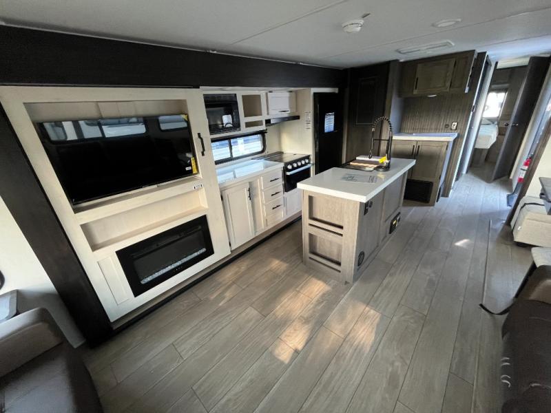 This trailer has it all for maximum comfort and convenience as well as entertainment! The rear living area includes a tri-fold sofa with a rear Pano-Vision window for great views of your campsite, and dual opposing slides widen this area so you can visit with friends. You'll also find theater seating, plus a free-standing table with two chairs and a storage ottoman seat. Enjoy the fireplace on a cool night or when you want a little ambiance while seated inside. Two patio awnings will provide an outdoor living area; just grab your camping chairs from the full pass-through storage. When you want to call it a night, fall quickly to sleep on the queen bed in the front bedroom with easy access to a dual entry bathroom!