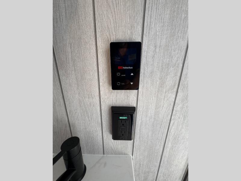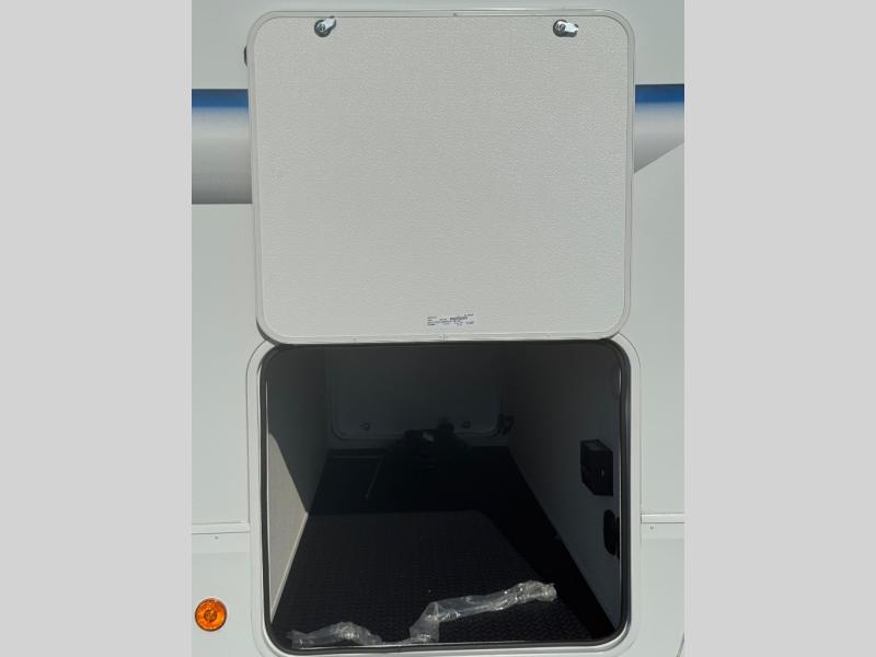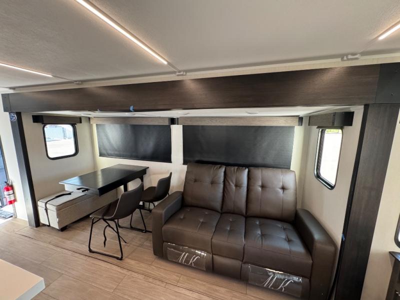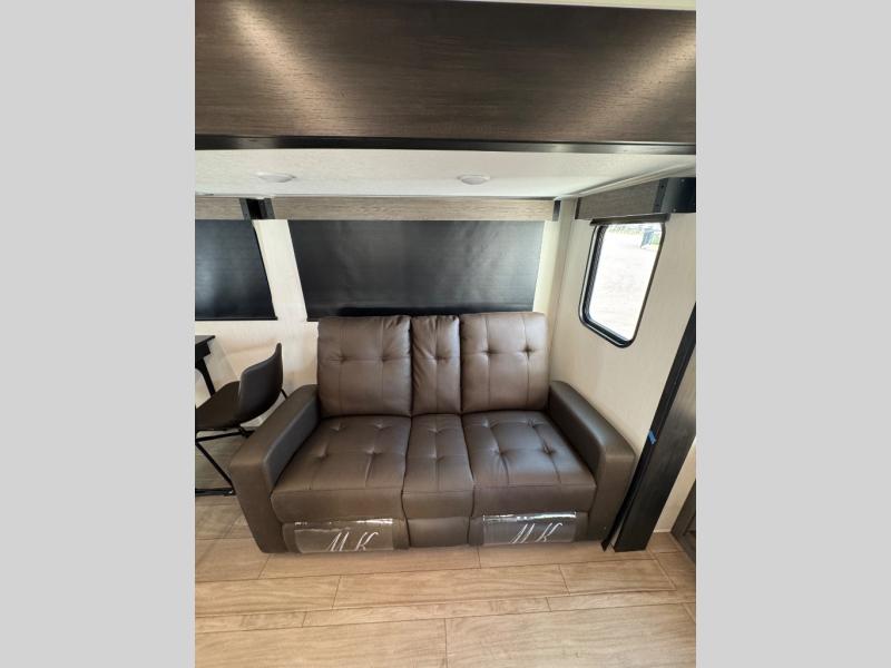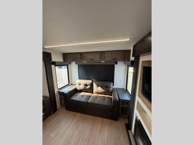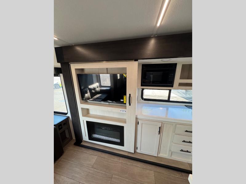 This trailer has it all for maximum comfort and convenience as well as entertainment! The rear living area includes a tri-fold sofa with a rear Pano-Vision window for great views of your campsite, and dual opposing slides widen this area so you can visit with friends. You'll also find theater seating, plus a free-standing table with two chairs and a storage ottoman seat. Enjoy the fireplace on a cool night or when you want a little ambiance while seated inside. Two patio awnings will provide an outdoor living area; just grab your camping chairs from the full pass-through storage. When you want to call it a night, fall quickly to sleep on the queen bed in the front bedroom with easy access to a dual entry bathroom!