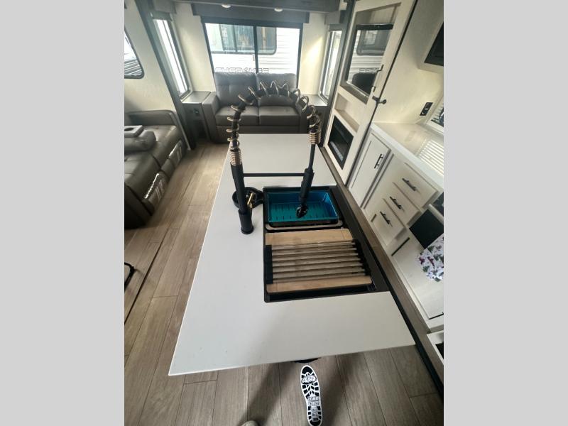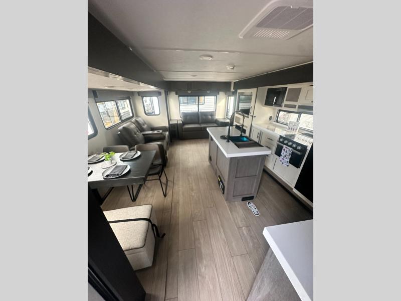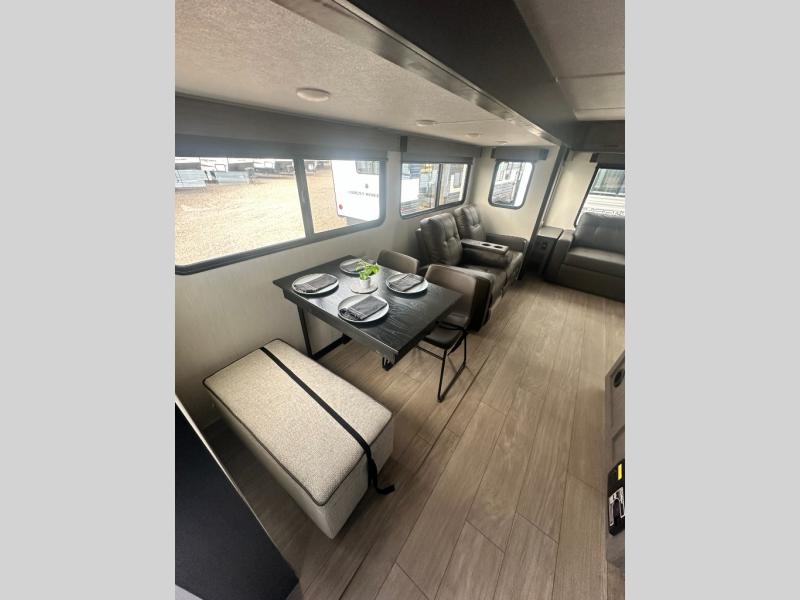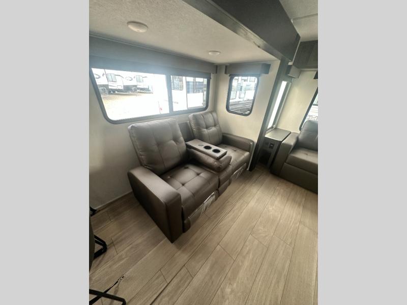 This trailer has it all for maximum comfort and convenience as well as entertainment! The rear living area includes a tri-fold sofa with a rear Pano-Vision window for great views of your campsite, and dual opposing slides widen this area so you can visit with friends. You'll also find theater seating, plus a free-standing table with two chairs and a storage ottoman seat. Enjoy the fireplace on a cool night or when you want a little ambiance while seated inside. Two patio awnings will provide an outdoor living area; just grab your camping chairs from the full pass-through storage. When you want to call it a night, fall quickly to sleep on the queen bed in the front bedroom with easy access to a dual entry bathroom!