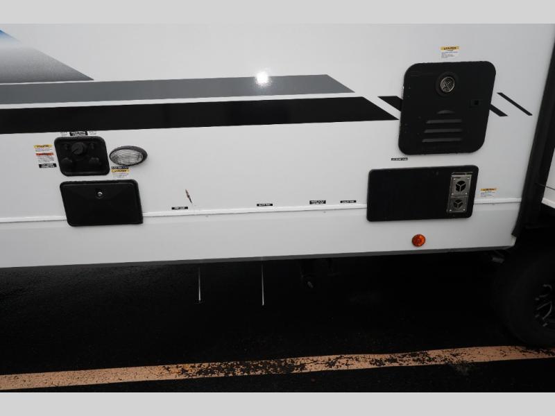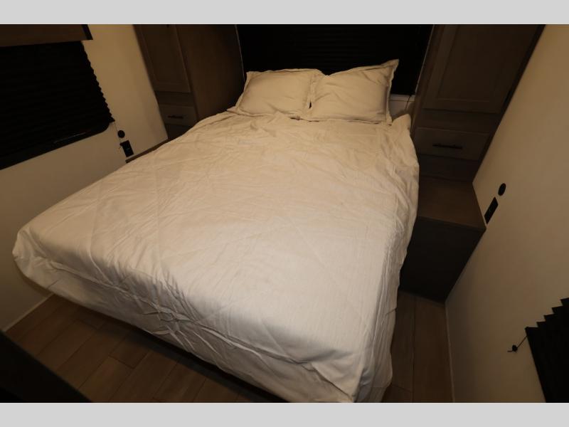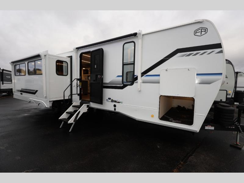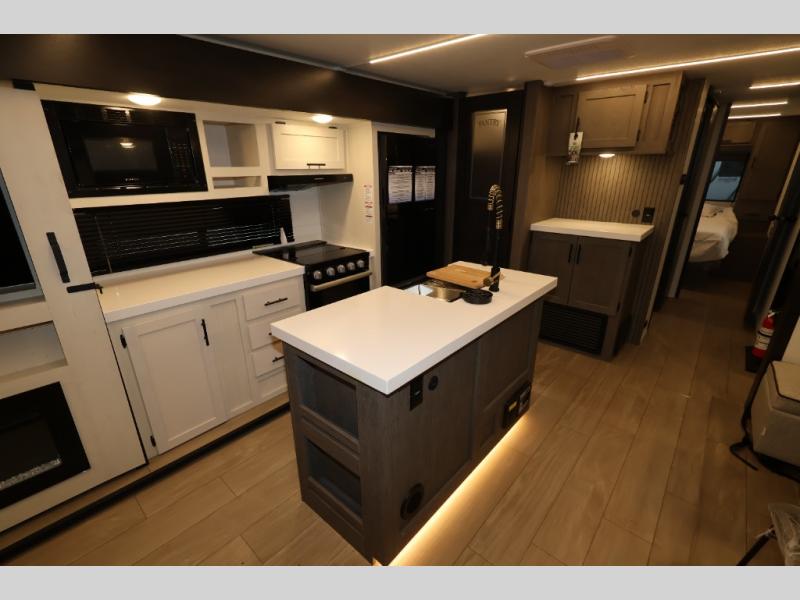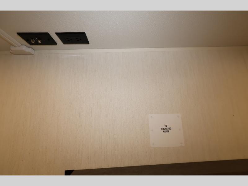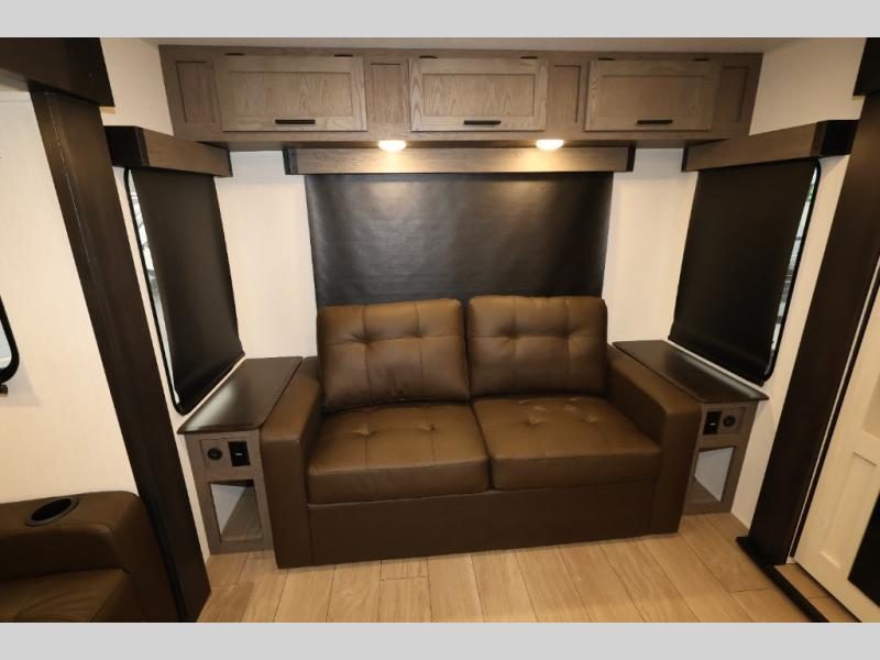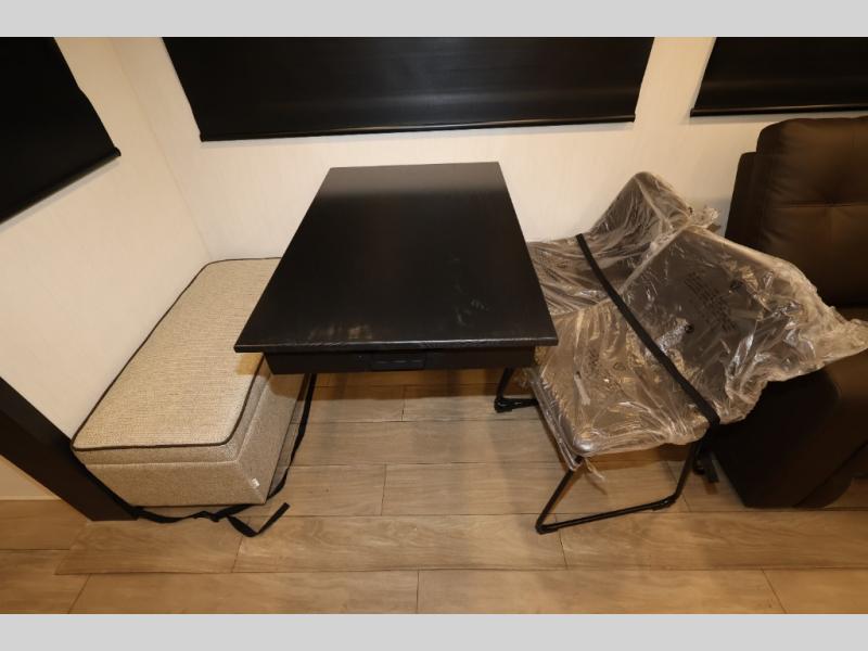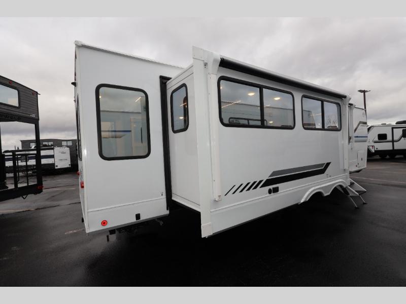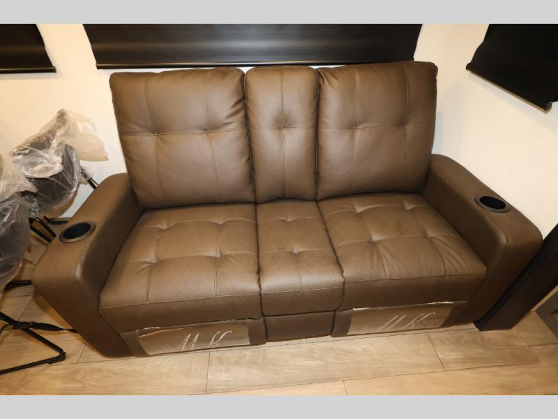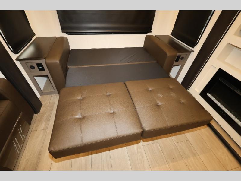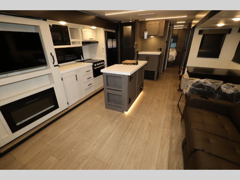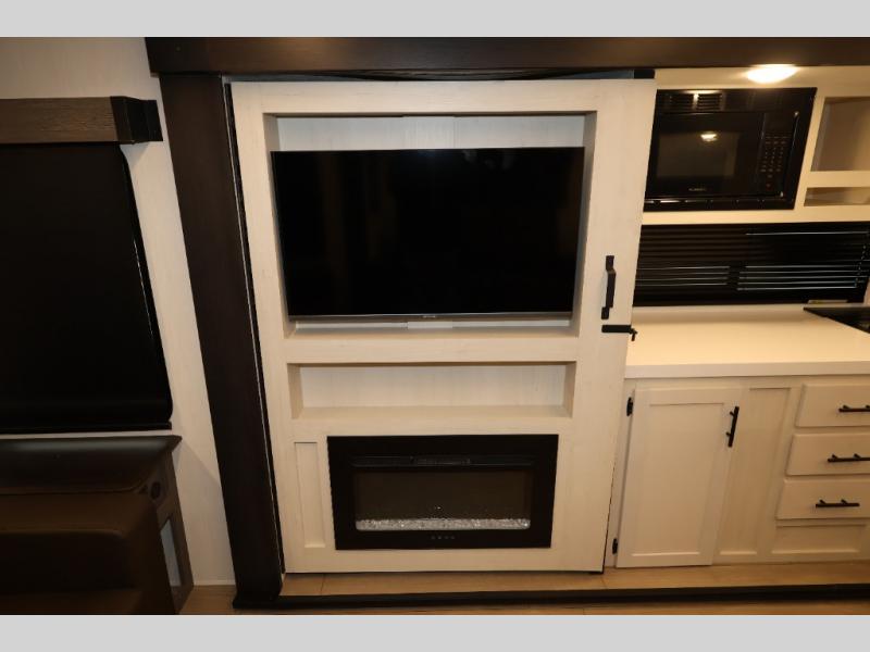 This trailer has it all for maximum comfort and convenience as well as entertainment! The rear living area includes a tri-fold sofa with a rear Pano-Vision window for great views of your campsite, and dual opposing slides widen this area so you can visit with friends. You'll also find theater seating, plus a free-standing table with two chairs and a storage ottoman seat. Enjoy the fireplace on a cool night or when you want a little ambiance while seated inside. Two patio awnings will provide an outdoor living area; just grab your camping chairs from the full pass-through storage. When you want to call it a night, fall quickly to sleep on the queen bed in the front bedroom with easy access to a dual entry bathroom!