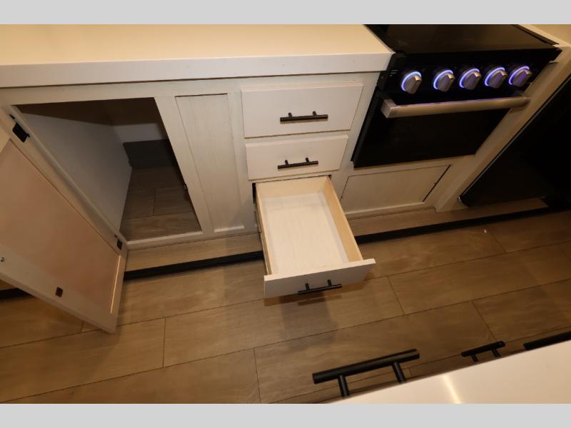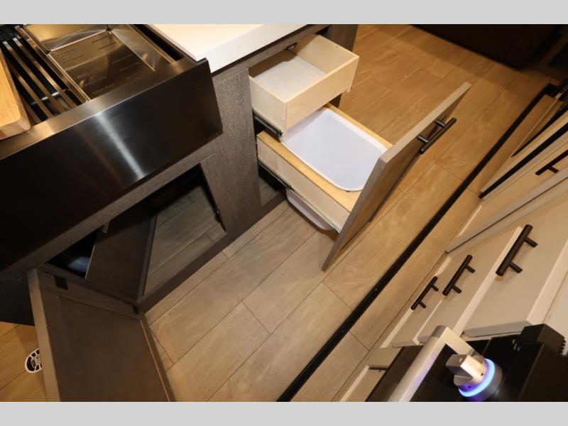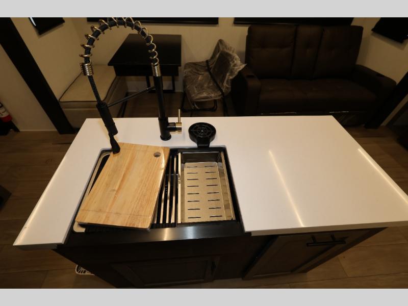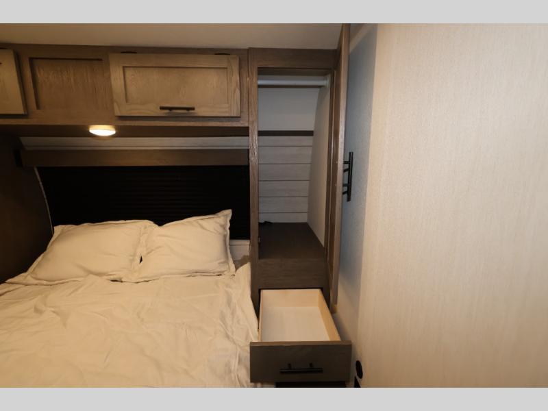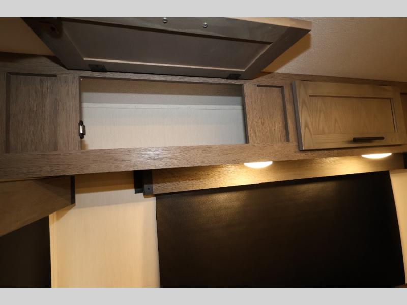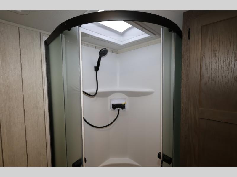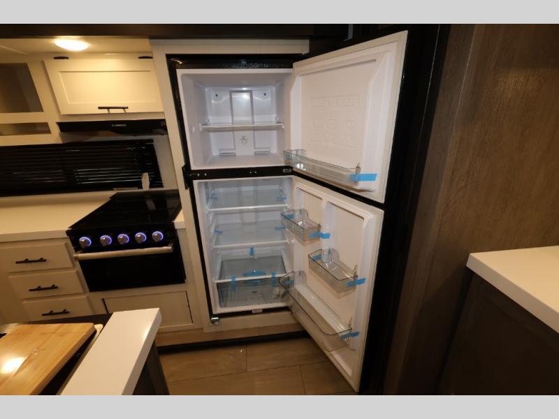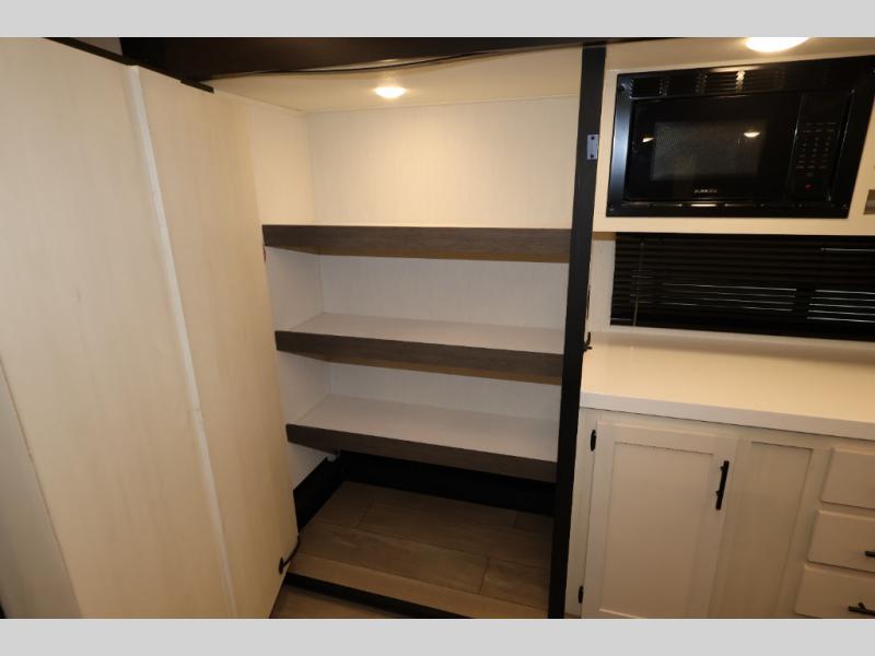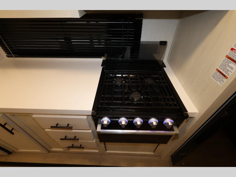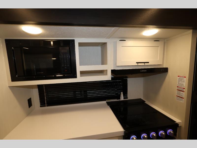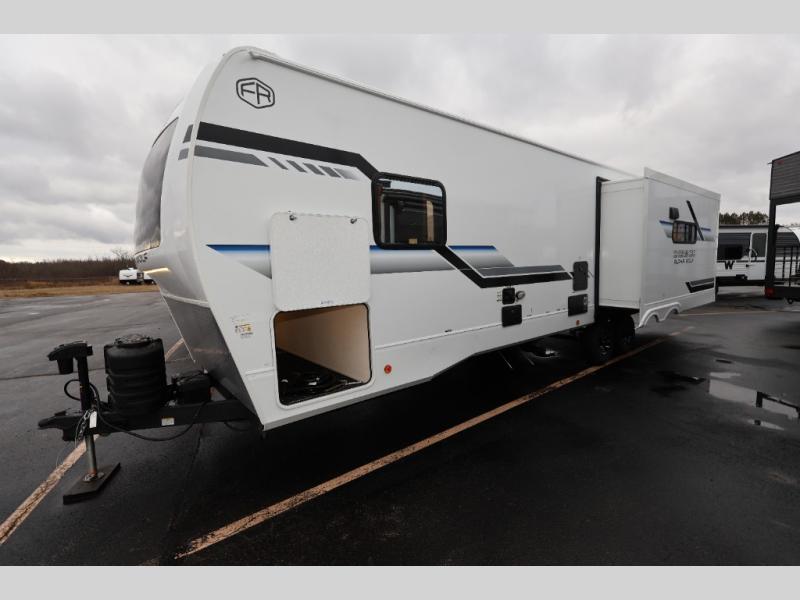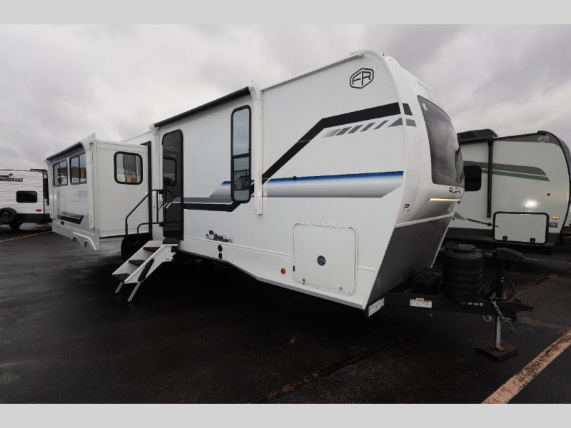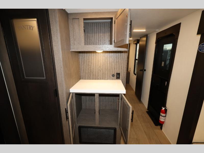 This trailer has it all for maximum comfort and convenience as well as entertainment! The rear living area includes a tri-fold sofa with a rear Pano-Vision window for great views of your campsite, and dual opposing slides widen this area so you can visit with friends. You'll also find theater seating, plus a free-standing table with two chairs and a storage ottoman seat. Enjoy the fireplace on a cool night or when you want a little ambiance while seated inside. Two patio awnings will provide an outdoor living area; just grab your camping chairs from the full pass-through storage. When you want to call it a night, fall quickly to sleep on the queen bed in the front bedroom with easy access to a dual entry bathroom!