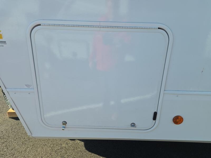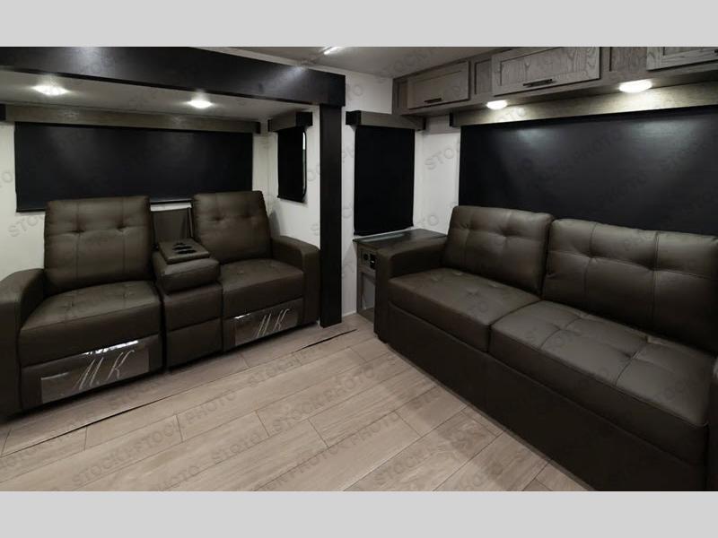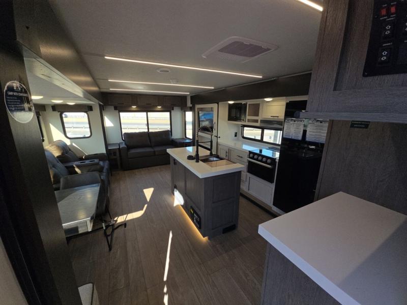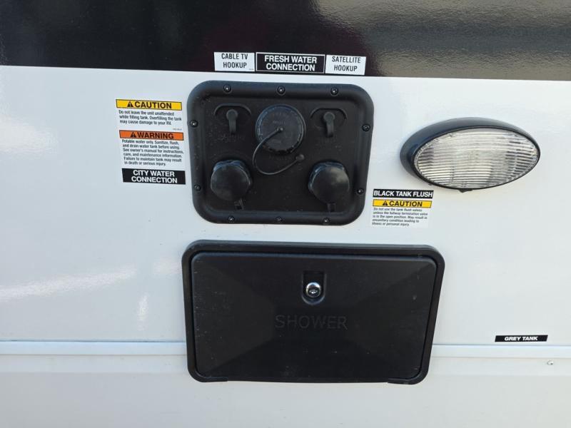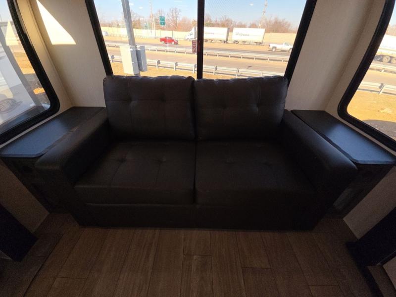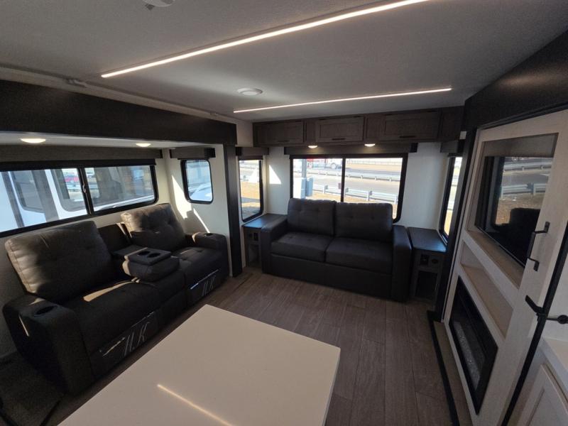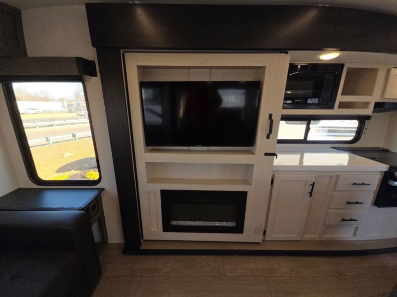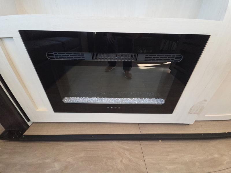 This trailer has it all for maximum comfort and convenience as well as entertainment! The rear living area includes a tri-fold sofa with a rear Pano-Vision window for great views of your campsite, and dual opposing slides widen this area so you can visit with friends. You'll also find theater seating, plus a free-standing table with two chairs and a storage ottoman seat. Enjoy the fireplace on a cool night or when you want a little ambiance while seated inside. Two patio awnings will provide an outdoor living area; just grab your camping chairs from the full pass-through storage. When you want to call it a night, fall quickly to sleep on the queen bed in the front bedroom with easy access to a dual entry bathroom!