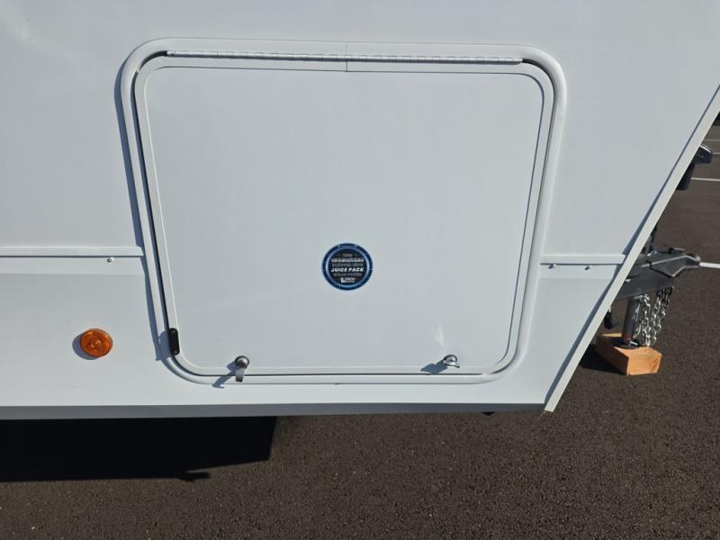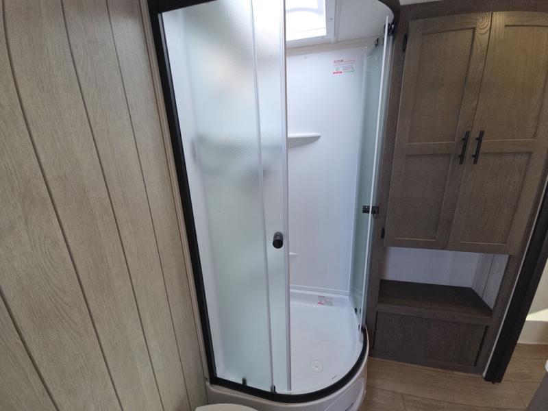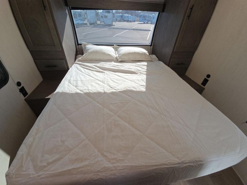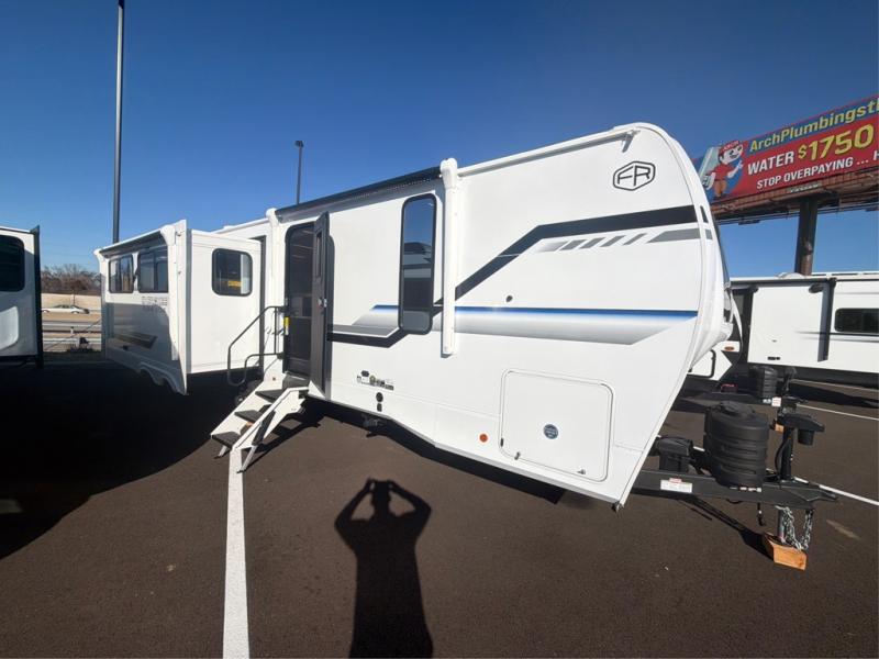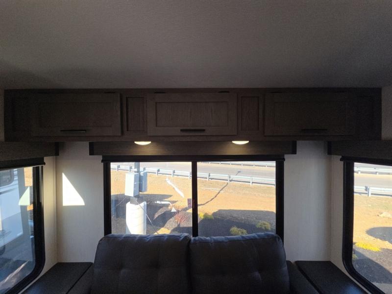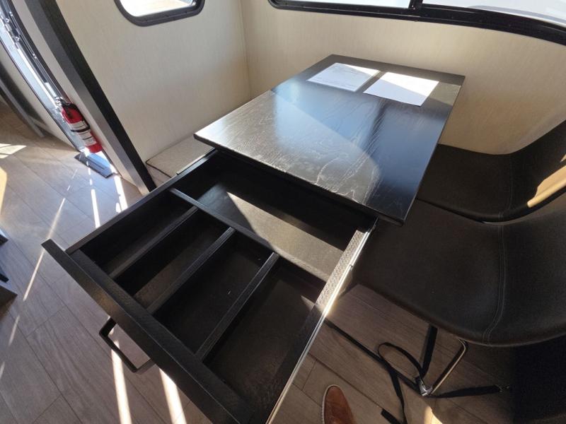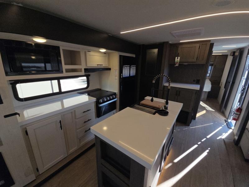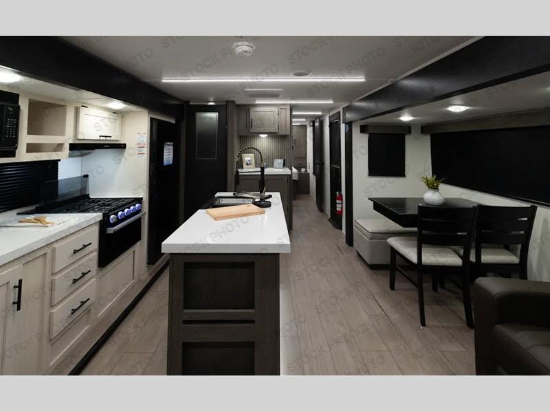 This trailer has it all for maximum comfort and convenience as well as entertainment! The rear living area includes a tri-fold sofa with a rear Pano-Vision window for great views of your campsite, and dual opposing slides widen this area so you can visit with friends. You'll also find theater seating, plus a free-standing table with two chairs and a storage ottoman seat. Enjoy the fireplace on a cool night or when you want a little ambiance while seated inside. Two patio awnings will provide an outdoor living area; just grab your camping chairs from the full pass-through storage. When you want to call it a night, fall quickly to sleep on the queen bed in the front bedroom with easy access to a dual entry bathroom!