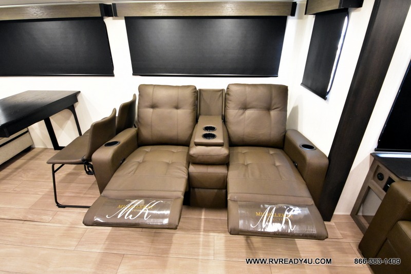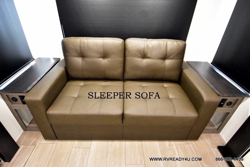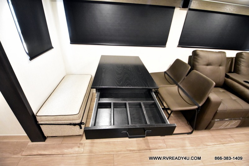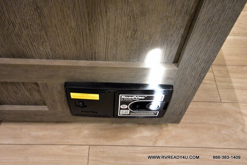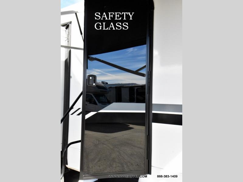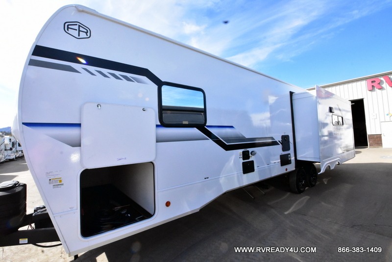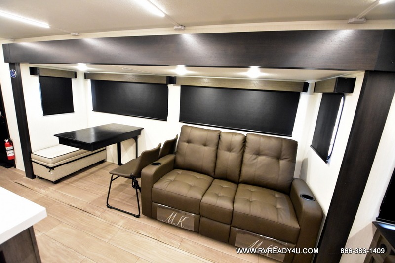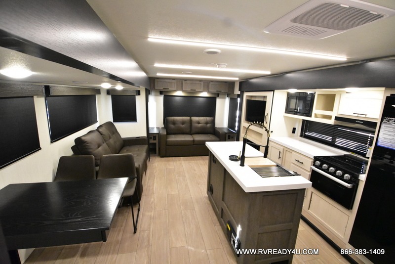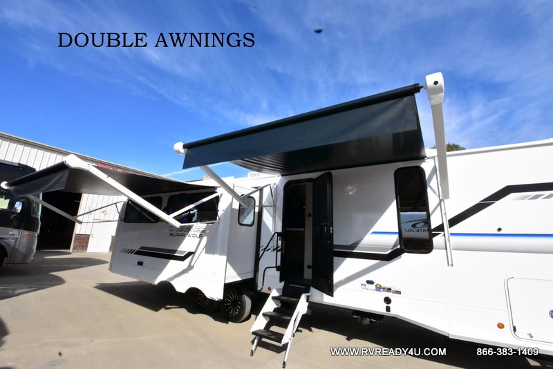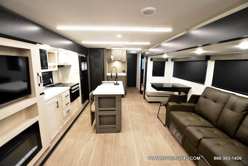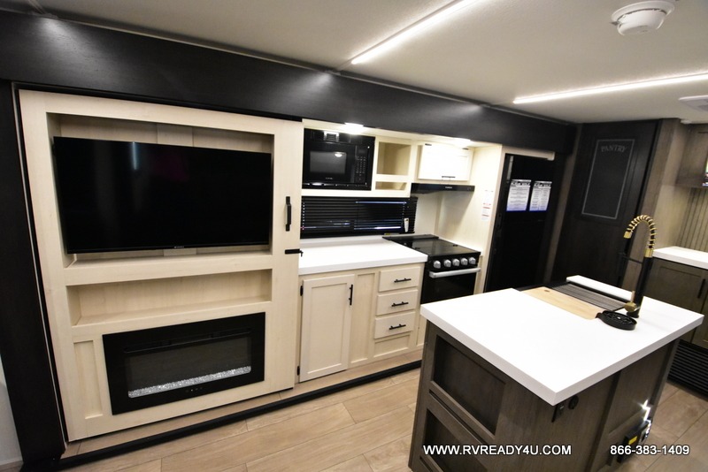 This trailer has it all for maximum comfort and convenience as well as entertainment! The rear living area includes a tri-fold sofa with a rear Pano-Vision window for great views of your campsite, and dual opposing slides widen this area so you can visit with friends. You'll also find theater seating, plus a free-standing table with two chairs and a storage ottoman seat. Enjoy the fireplace on a cool night or when you want a little ambiance while seated inside. Two patio awnings will provide an outdoor living area; just grab your camping chairs from the full pass-through storage. When you want to call it a night, fall quickly to sleep on the queen bed in the front bedroom with easy access to a dual entry bathroom!