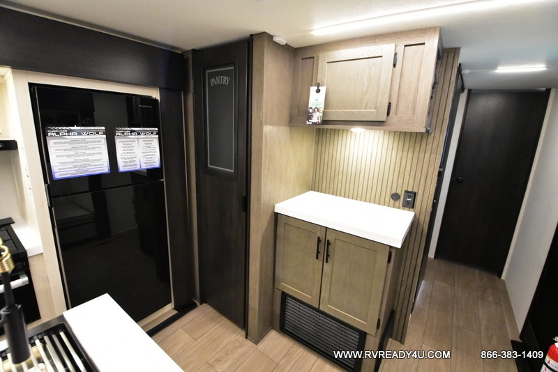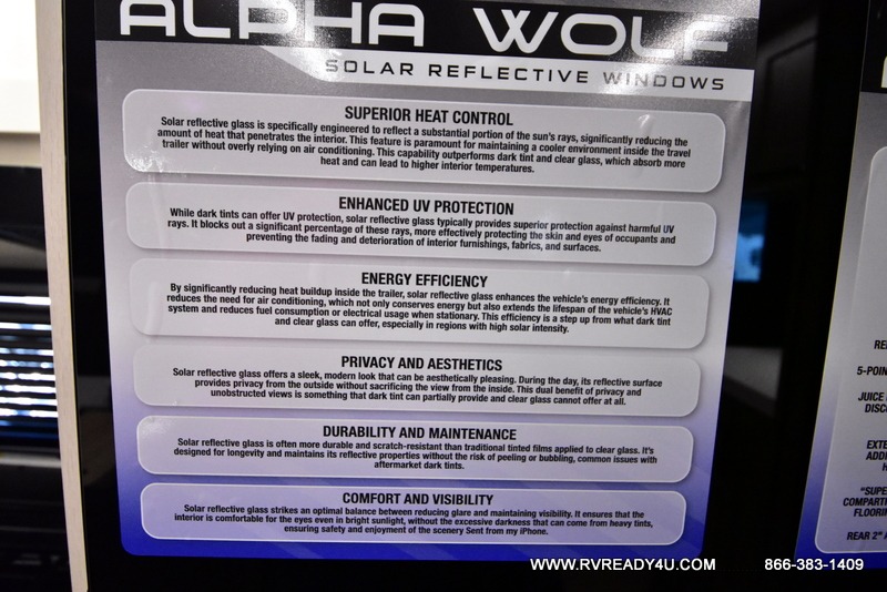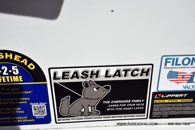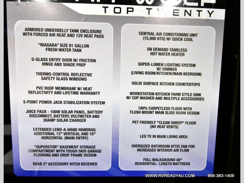 With any Cherokee Alpha Wolf travel trailer by Forest River you'll enjoy outstanding amenities, quality construction, and an affordable price. Each model features a "ToughBend" rigid skirt metal design, 5/8" tongue and groove plywood floor decking, and a "SuperTruss" roof structure that will hold up through years of camping memories. There is a pet friendly "clean sweep" floor design with no heat vents indoors, along with a super lumen lighting system, a 15,000 BTU quick cool central air conditioning, and many more comforts. There are many convenient exterior features such as, Leash Latch pet safety technology, an outside shower with hot and cold water, and exterior steps with oversized landing and quick release. The Weather Guard Package will add protection against the elements with an armored underbelly tank enclosure and forced air heat, thermo-control reflective safety glass windows, and upgraded laminated walls with block foam insulation!
