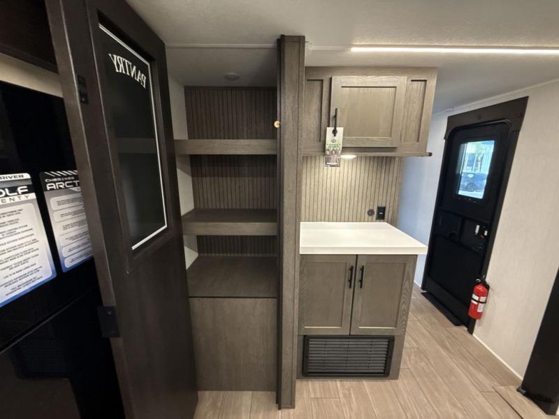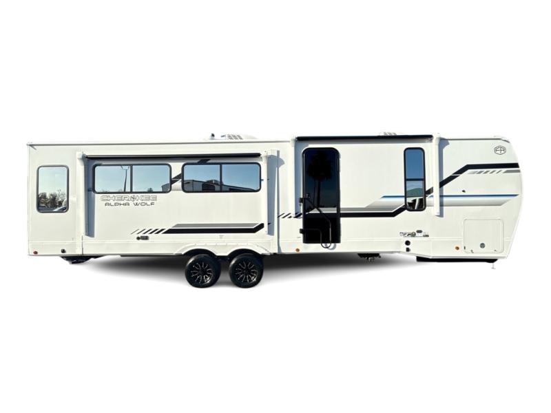 With any Cherokee Alpha Wolf travel trailer by Forest River you'll enjoy outstanding amenities, quality construction, and an affordable price. Each model features a "ToughBend" rigid skirt metal design, 5/8" tongue and groove plywood floor decking, and a "SuperTruss" roof structure that will hold up through years of camping memories. There is a pet friendly "clean sweep" floor design with no heat vents indoors, along with a super lumen lighting system, a 15,000 BTU quick cool central air conditioning, and many more comforts. There are many convenient exterior features such as, Leash Latch pet safety technology, an outside shower with hot and cold water, and exterior steps with oversized landing and quick release. The Weather Guard Package will add protection against the elements with an armored underbelly tank enclosure and forced air heat, thermo-control reflective safety glass windows, and upgraded laminated walls with block foam insulation!