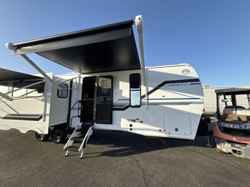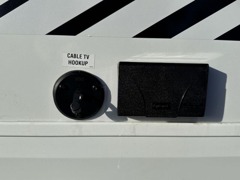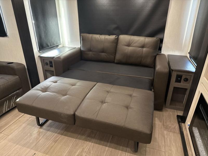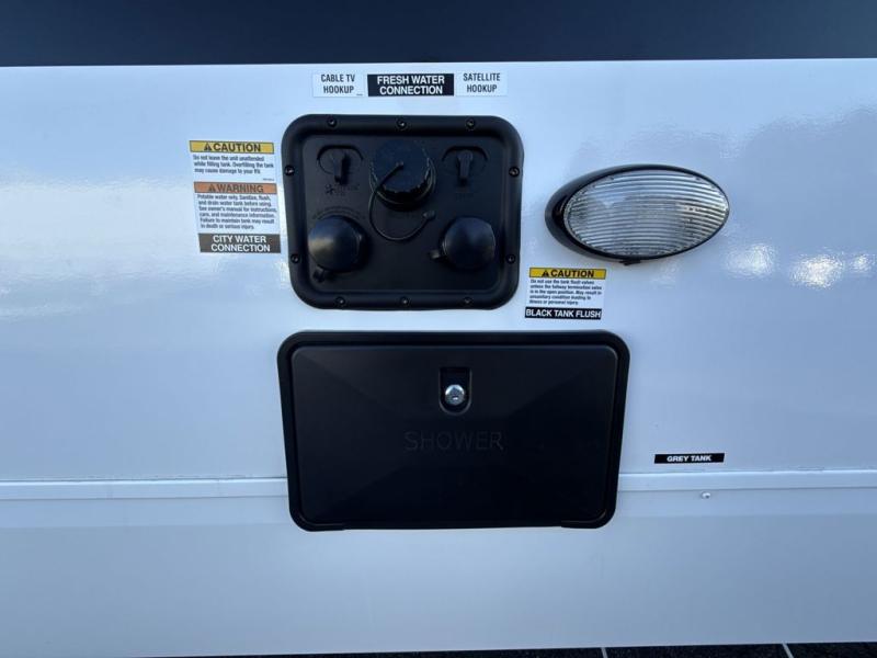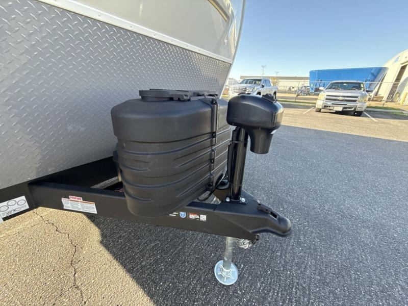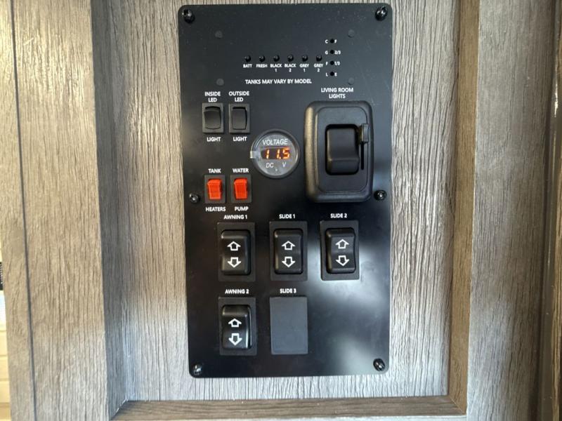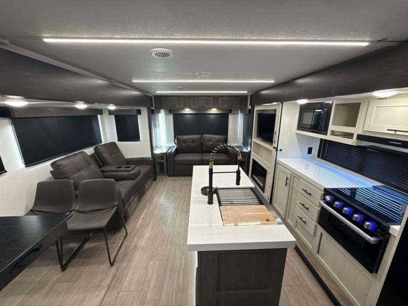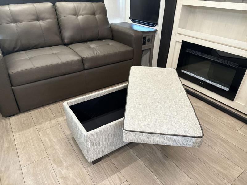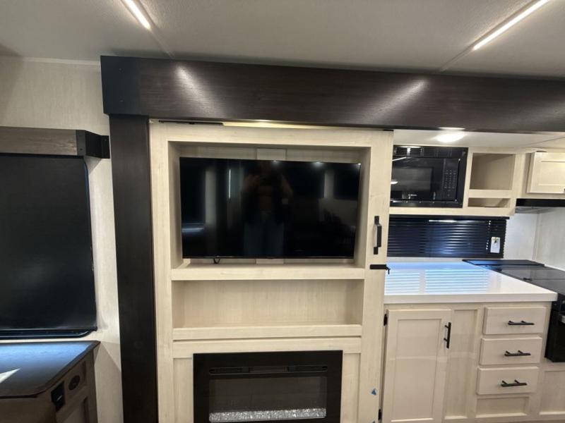 This trailer has it all for maximum comfort and convenience as well as entertainment! The rear living area includes a tri-fold sofa with a rear Pano-Vision window for great views of your campsite, and dual opposing slides widen this area so you can visit with friends. You'll also find theater seating, plus a free-standing table with two chairs and a storage ottoman seat. Enjoy the fireplace on a cool night or when you want a little ambiance while seated inside. Two patio awnings will provide an outdoor living area; just grab your camping chairs from the full pass-through storage. When you want to call it a night, fall quickly to sleep on the queen bed in the front bedroom with easy access to a dual entry bathroom!