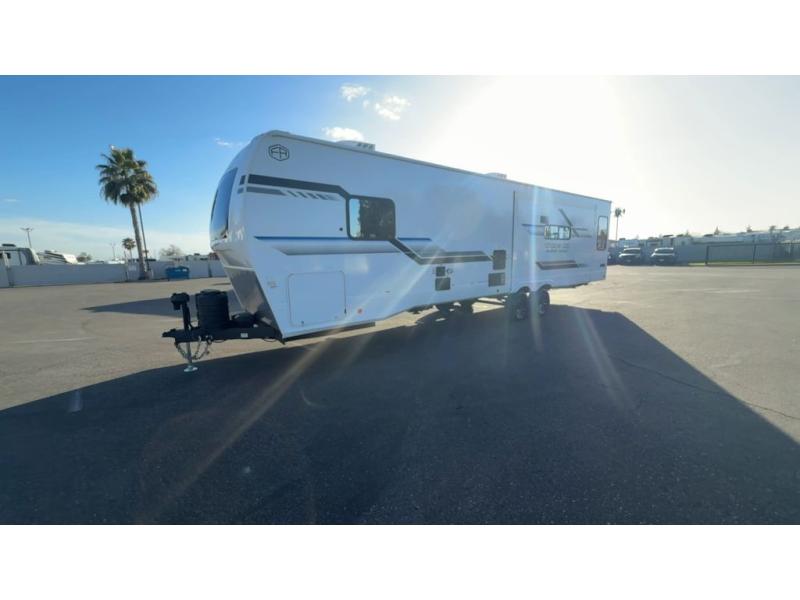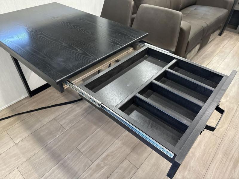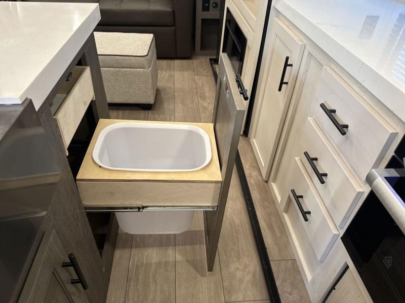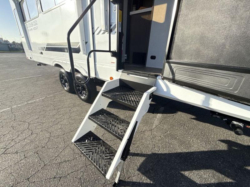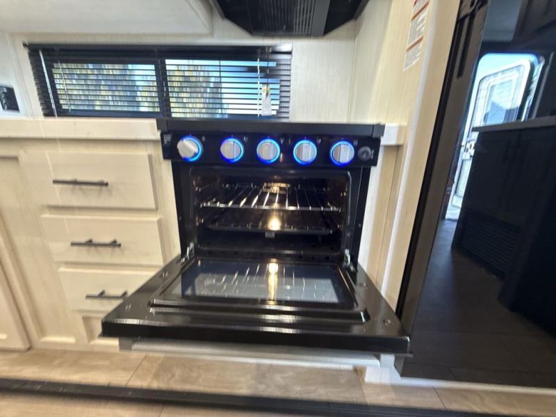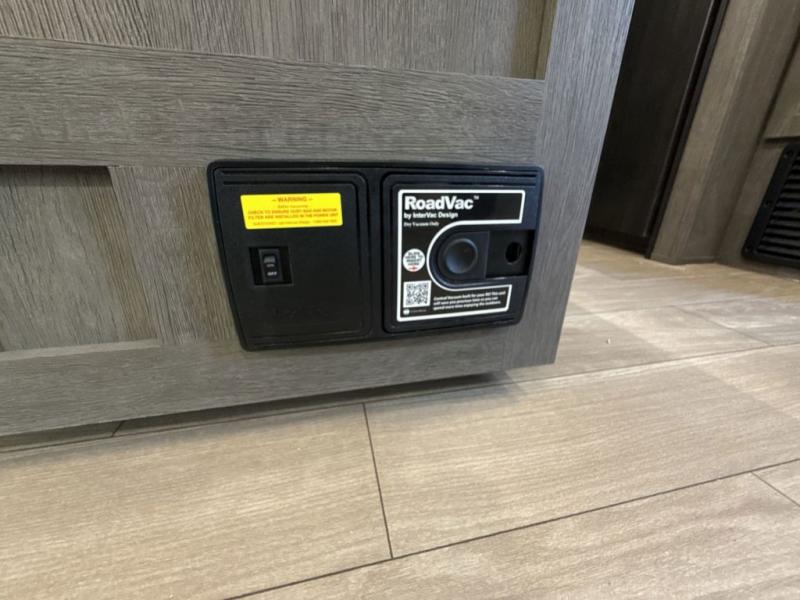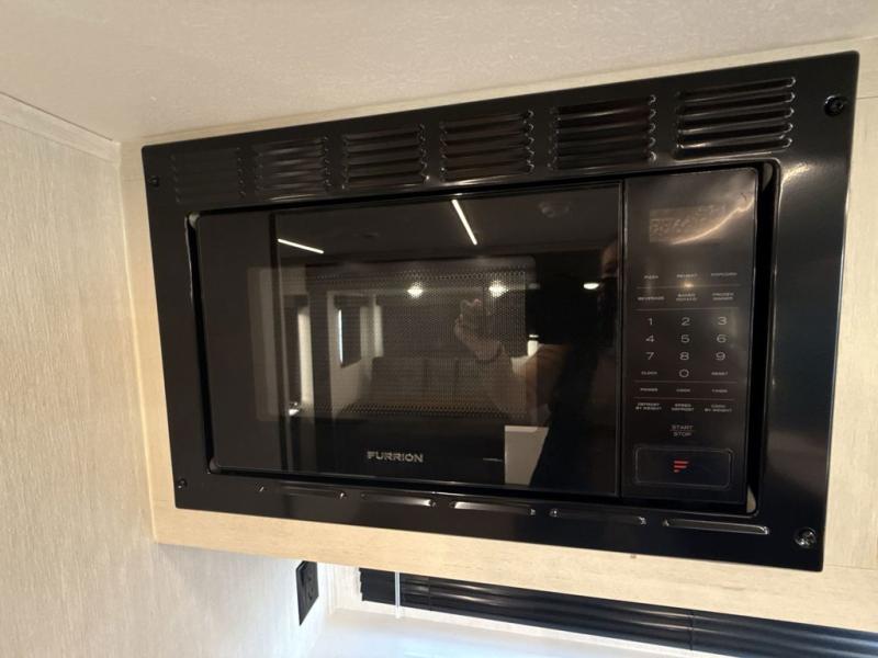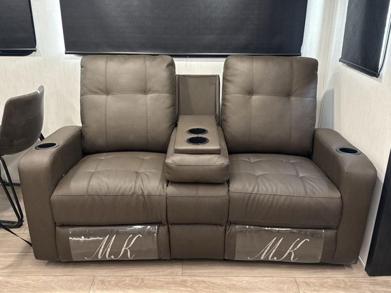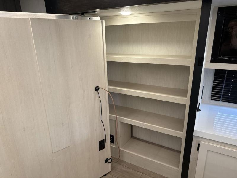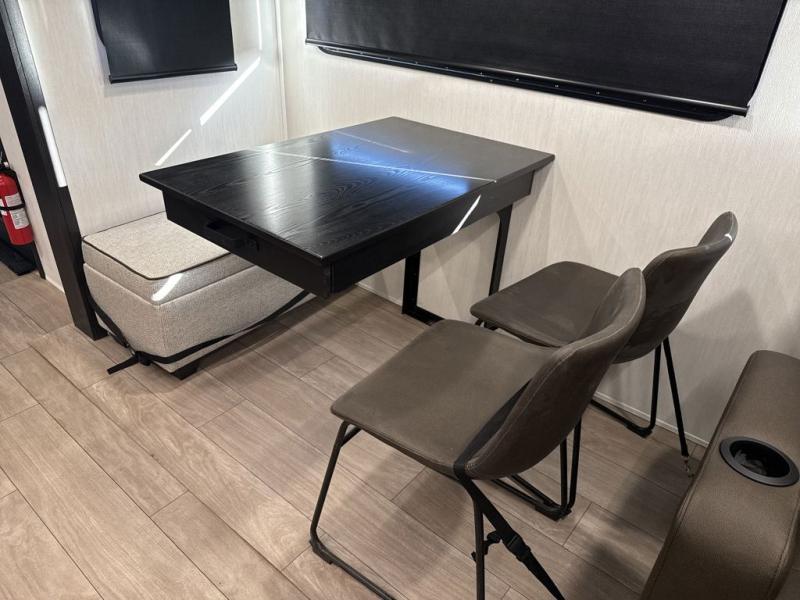 This trailer has it all for maximum comfort and convenience as well as entertainment! The rear living area includes a tri-fold sofa with a rear Pano-Vision window for great views of your campsite, and dual opposing slides widen this area so you can visit with friends. You'll also find theater seating, plus a free-standing table with two chairs and a storage ottoman seat. Enjoy the fireplace on a cool night or when you want a little ambiance while seated inside. Two patio awnings will provide an outdoor living area; just grab your camping chairs from the full pass-through storage. When you want to call it a night, fall quickly to sleep on the queen bed in the front bedroom with easy access to a dual entry bathroom!