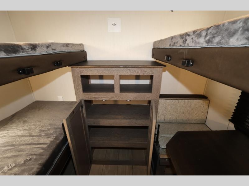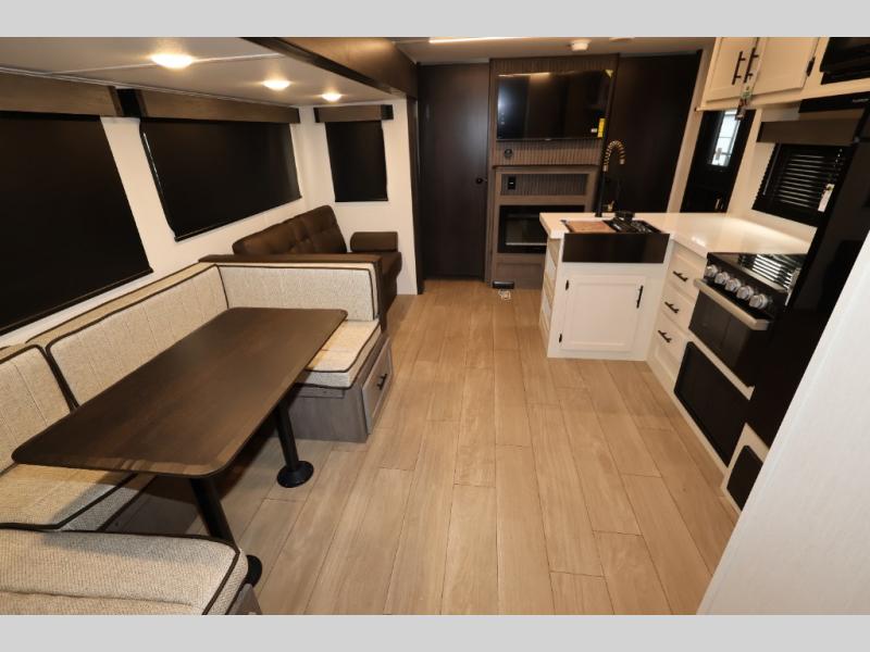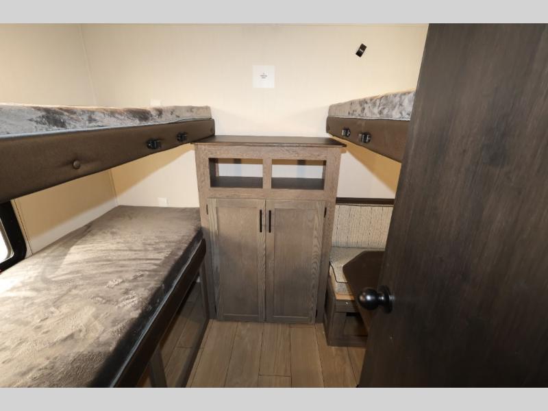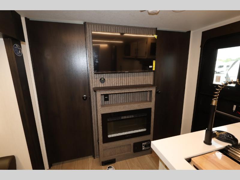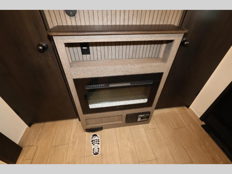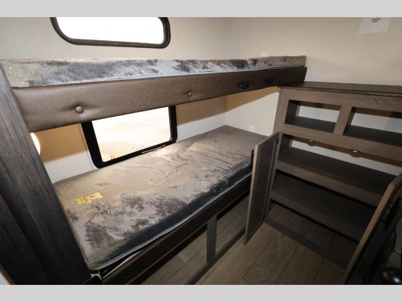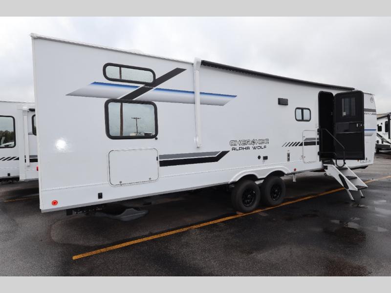 Looking for a spacious travel trailer to sleep nine or ten happy campers? You've found it in this Cherokee Alpha Wolf model with a handy outside kitchen, a bunkhouse with a dinette, a front private bedroom, and a large slide out! The main living and kitchen area has a U-shaped dinette to utilize as a dining table, game table, work station, and/or an extra sleeping space. There is also a jackknife sofa for seating, TV watching, or sleeping. From any seating area you can easily view the entertainment center and fireplace which is centered in the unit with doors on either side to the front private bedroom. You will also find a nice pantry and full kitchen amenities including a large sink, and residential-style refrigerator allowing you to easily create meals for your hungry crew. The exterior provides an 18' awning for an outdoor living area over the outside kitchen, and there is ample exterior storage for all of your camping gear like camp chairs, outside games, rugs, and more.