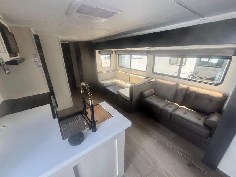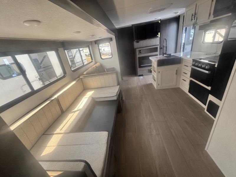 Looking for a spacious travel trailer to sleep nine or ten happy campers? You've found it in this Cherokee Alpha Wolf model with a handy outside kitchen, a bunkhouse with a dinette, a front private bedroom, and a large slide out! The main living and kitchen area has a U-shaped dinette to utilize as a dining table, game table, work station, and/or an extra sleeping space. There is also a jackknife sofa for seating, TV watching, or sleeping. From any seating area you can easily view the entertainment center and fireplace which is centered in the unit with doors on either side to the front private bedroom. You will also find a nice pantry and full kitchen amenities including a large sink, and residential-style refrigerator allowing you to easily create meals for your hungry crew. The exterior provides an 18' awning for an outdoor living area over the outside kitchen, and there is ample exterior storage for all of your camping gear like camp chairs, outside games, rugs, and more.