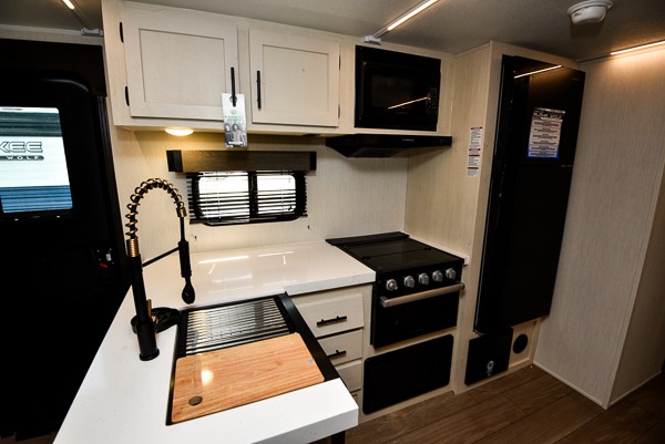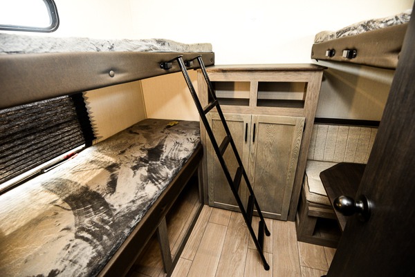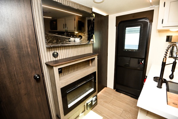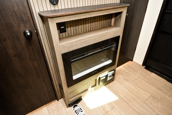 Looking for a spacious travel trailer to sleep nine or ten happy campers? You've found it in this Cherokee Alpha Wolf model with a handy outside kitchen, a bunkhouse with a dinette, a front private bedroom, and a large slide out! The main living and kitchen area has a U-shaped dinette to utilize as a dining table, game table, work station, and/or an extra sleeping space. There is also a jackknife sofa for seating, TV watching, or sleeping. From any seating area you can easily view the entertainment center and fireplace which is centered in the unit with doors on either side to the front private bedroom. You will also find a nice pantry and full kitchen amenities including a large sink, and residential-style refrigerator allowing you to easily create meals for your hungry crew. The exterior provides an 18' awning for an outdoor living area over the outside kitchen, and there is ample exterior storage for all of your camping gear like camp chairs, outside games, rugs, and more.
