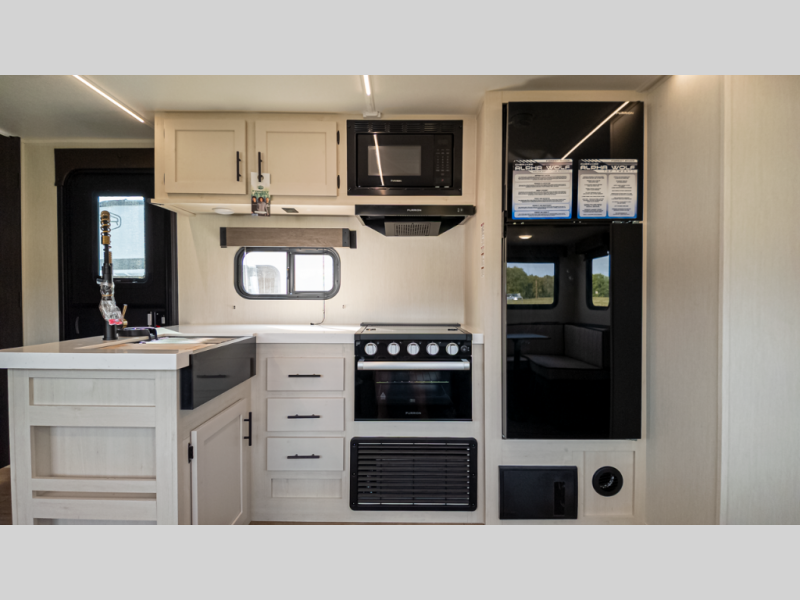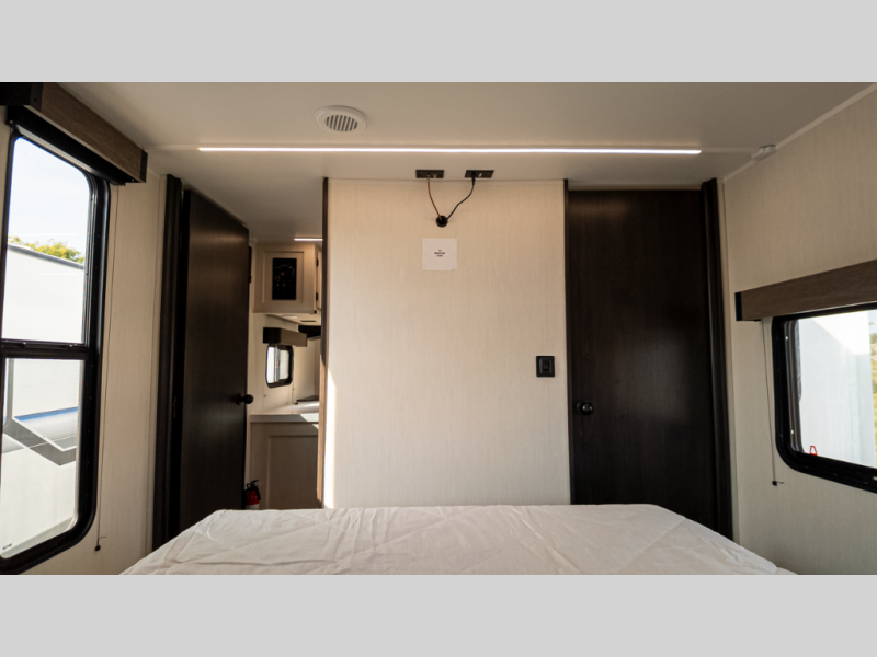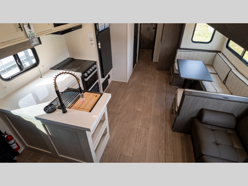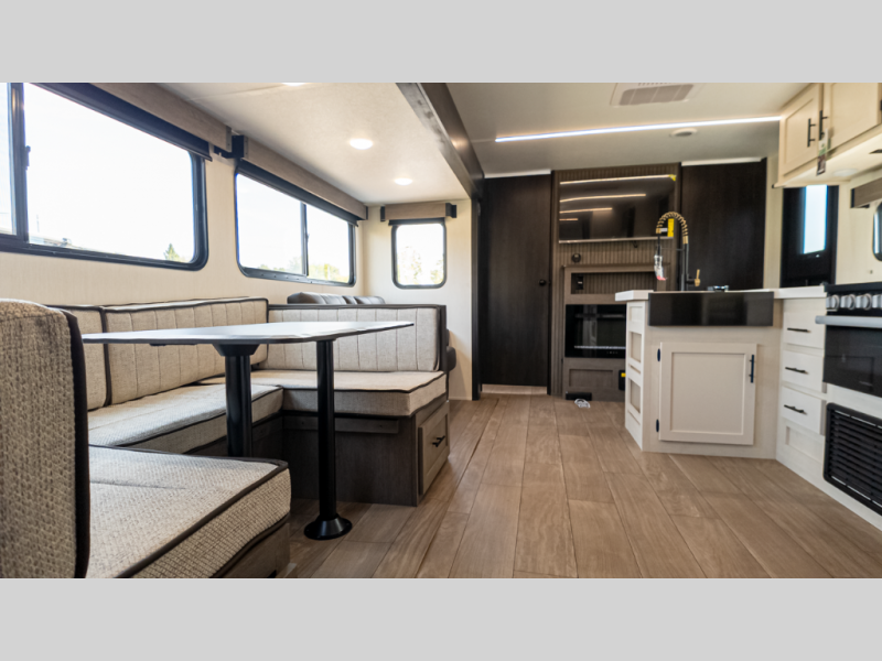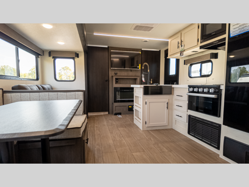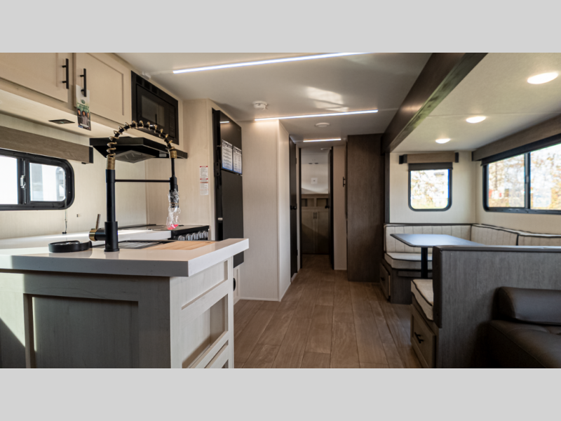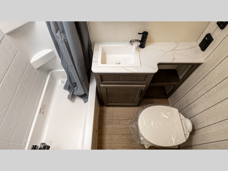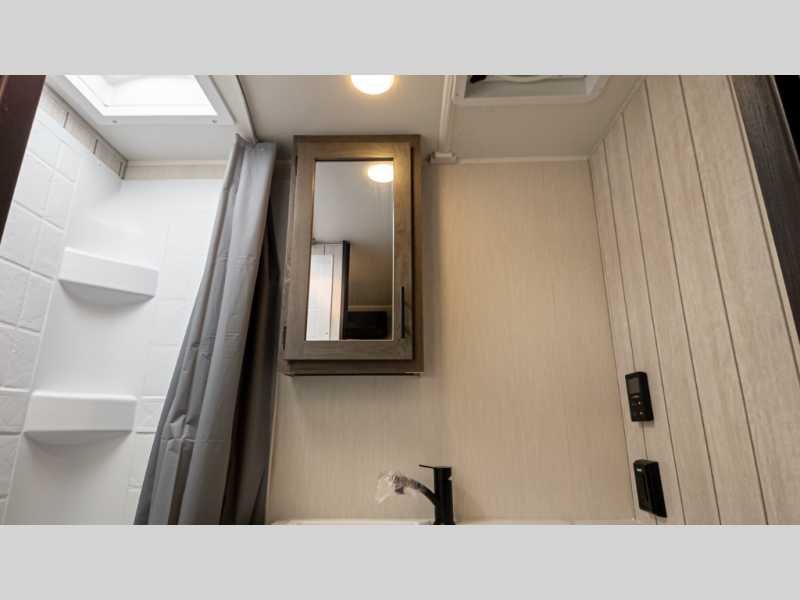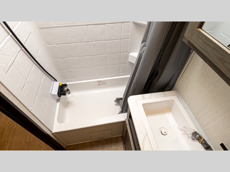- Climate & Comfort: 15,000 BTU A/C, on-demand tankless water heater, laminated insulated walls, weather guard package